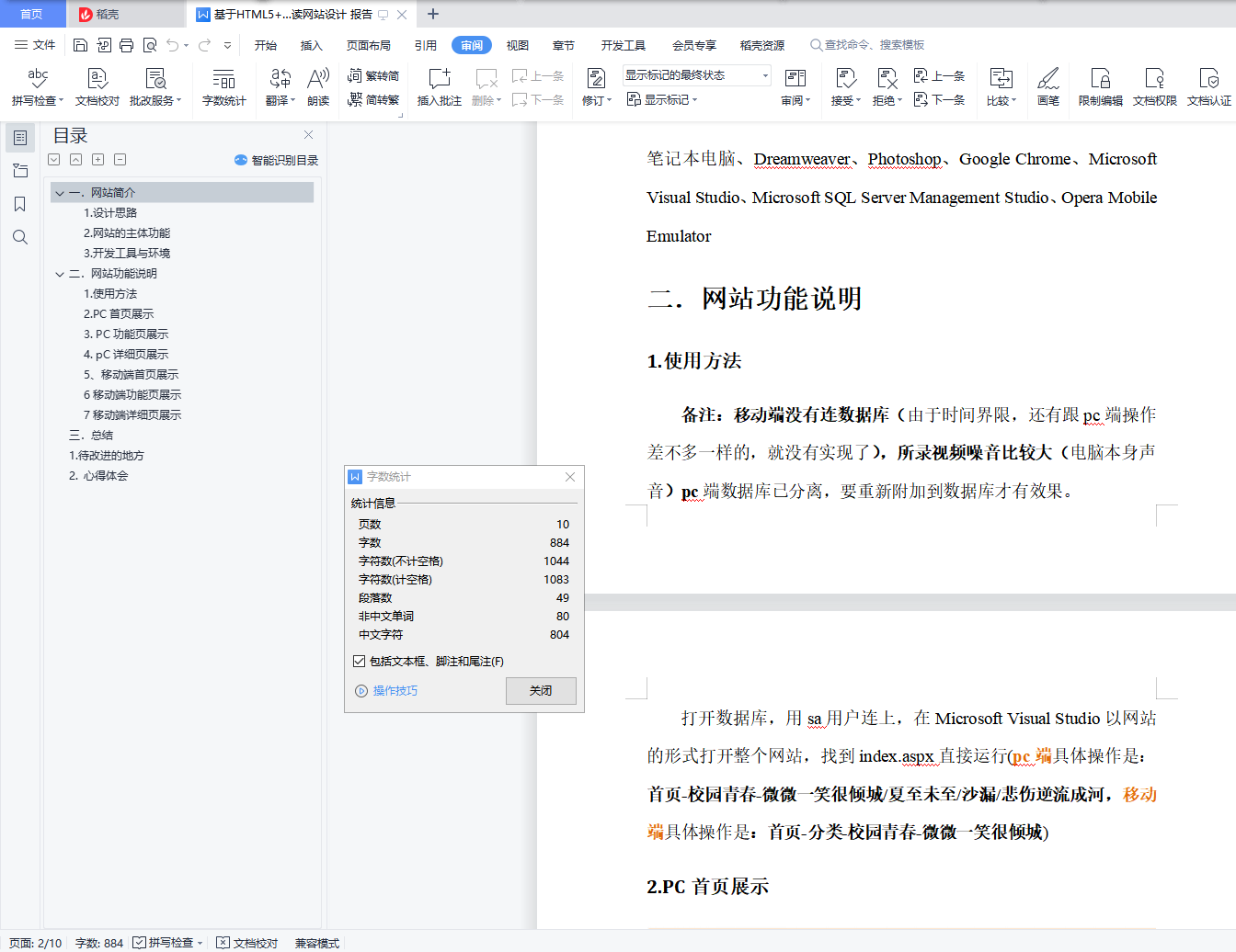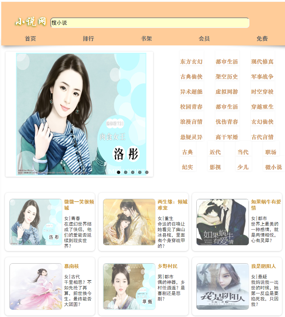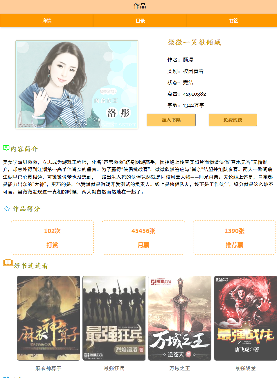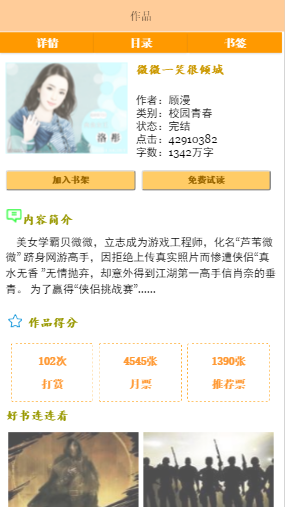 目录一.网站简介 11.设计思路 12.网站的主体功能 13.开发工具与环境 1二.网站功能说明 21.使用方法 22.PC首页展示 33. PC功能页展示 44. pC详细页展示 45、移动端首页展示 66移动端功能页展示 77移动端详细页展示 9三.总结 91.待改进的地方 92. 心得体会 10一.网站简介1.设计思路根据一般人阅读小说的顺序,利用了HTML5、CSS3制作一个普通pc端和跨平台移动端。Pc端:小说的首页、小说某类具体信息、某小说详细信息页移动端:小说的首页、小说分类、小说某类具体信息、小说详情。2.网站的主体功能小说的分类,小说的推荐,小说的详细信息,在小说的详细页运用了数据库的数据进行页面的更新,避免重复页面的设计。
