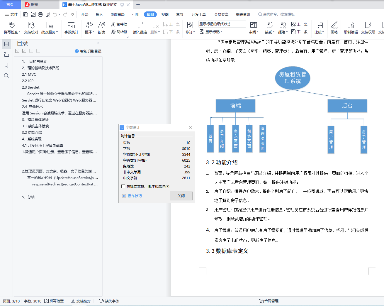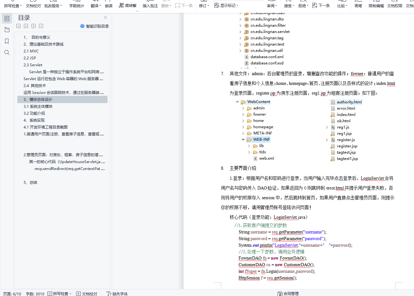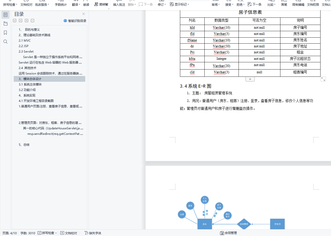 摘 要:房屋租赁管理系统与网络相结合,给用户提供更加周到和人性化的服务。网站模式为MVC模式,基于MySql数据库,采用Jsp,Session绘画跟踪、JavaScript等技术,实现了普通用户可以浏览、查看房屋信息,可以注册成为网站用户、登录网站,然后查看个人信息,还可以查看该系统下的房子出租情况等,管理员可以对普通用户、房屋信息进行管理等功能。目录1、 目的与意义 22、 理论基础及技术路线 22.1 MVC 22.2 JSP 32.3 Servlet 3Servlet是一种独立于操作系统平台和网络传输协议的服务器端的Java应用程序,具有独立于平台和协议的特性,主要功能在于交互式地浏览和生成数据,生成动态Web内容。 3Servlet运行在包含Web容器的Web服务器上,Web容器给客户端的请求传给Servlet,并将Servlet的响应返回给客户端。 32.4 其他技术 3运用Session会话跟踪技术,通过在服务器端记录信息确定用户的身份,用来记录以及跟踪用户在登录网页后的整个会话。同时通过配置文件,利用Servlet过滤器,使用他们来它们拦截请求和响应,比如利用过滤器判断用户是否为管理员才决定他们能否进入后台管理界面。例如admin网页用到“欢迎来到管理员页面”的标签语句,也可以采用自定义标签技术。 33、 模块总体设计 33.1系统主体模块 33.2功能介绍 44、 系统实现 64.1开发环境工程目录截图 61. 普通用户页面:注册,查看房子信息,查看或修改个人信息 99102. 管理员页面:对房东,租客,房子信息的增删查改操作。 10其一的核心代码(UpdateHouseServlet.java): 10resp.sendRedirect(req.getContextPath()+"/error.html"); 11115、总结 111、 目的与意义随着计算机科学的发展,数据库技术在 Internet中的应用越来越广泛为广大网络用户提供了更加周到和人性化的服务。个性化已逐渐成为当今Web应用的朝流。简单的租赁服务已经不能满足人们的需求,利用先进的管理手段,提高租赁管理的效率,是当今社会所面临的一个重要课题,为此我想设计一个房屋租赁管理系统实现用户和房子的增删查改,使得房子租赁更加有效率,也使租客租用房子更加便利。2、理论基础及技术路线2.1 MVCMVC是Model-View-Controller的缩写,它能很好地使数据层与表示层进行分离,应用程序的输入、输出和处理流程。其模式分为三部分,Model(模型)是用于处理应用程序数据逻辑的部分,负责在数据库中存取数据;View(视图)是处理数据显示部分,依据模型数据而创建;Controller(控制器)是处理用户交互的部分,负责从视图读取数据,控制用户输入并发送数据。
