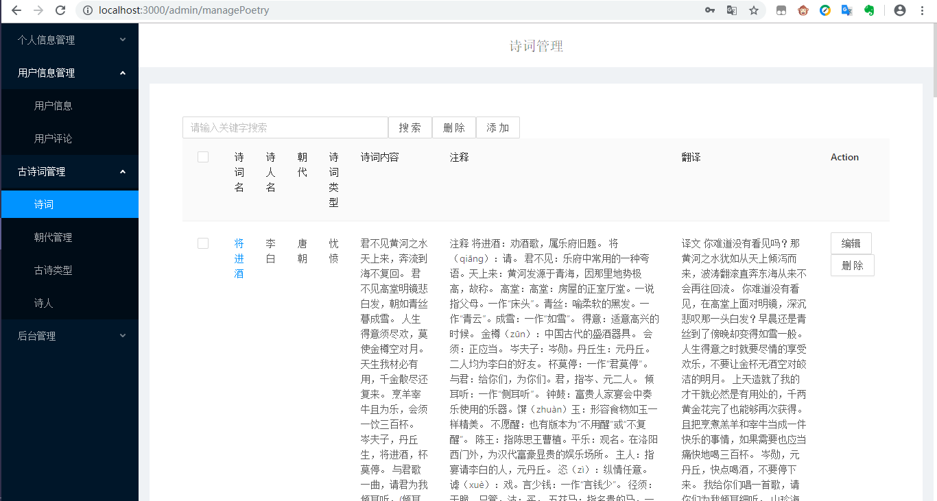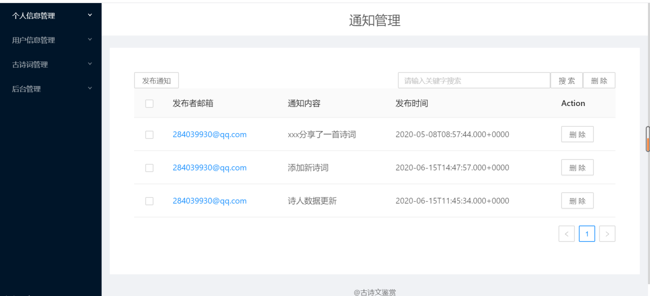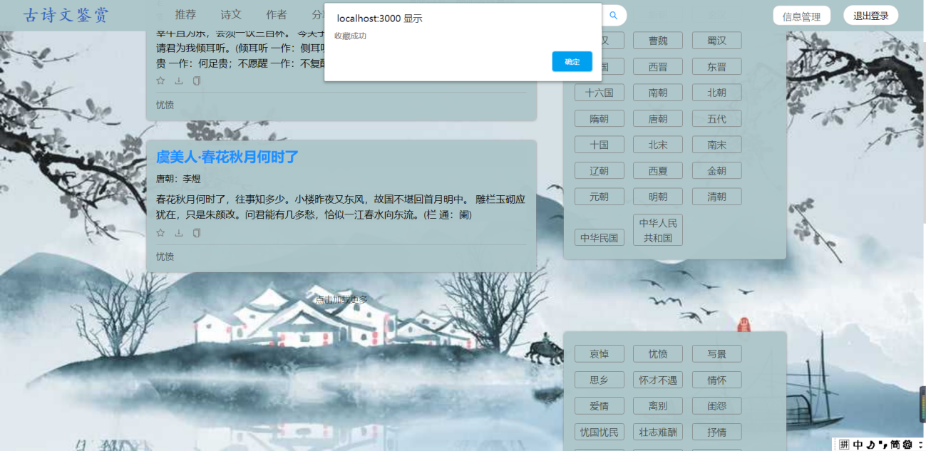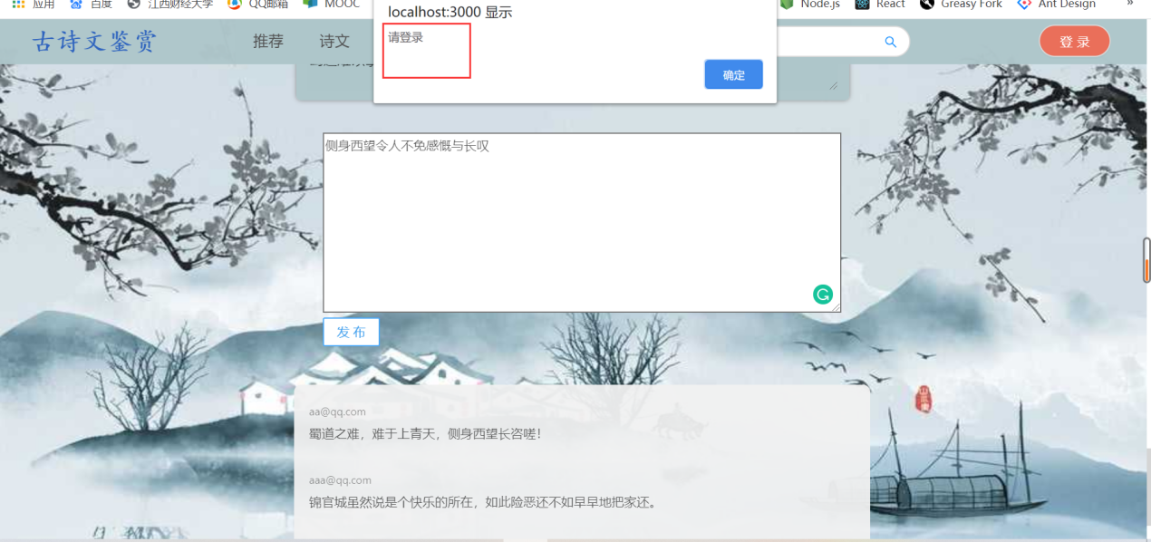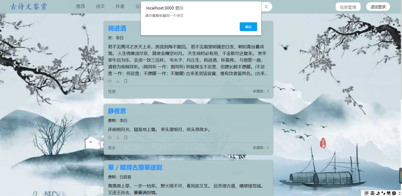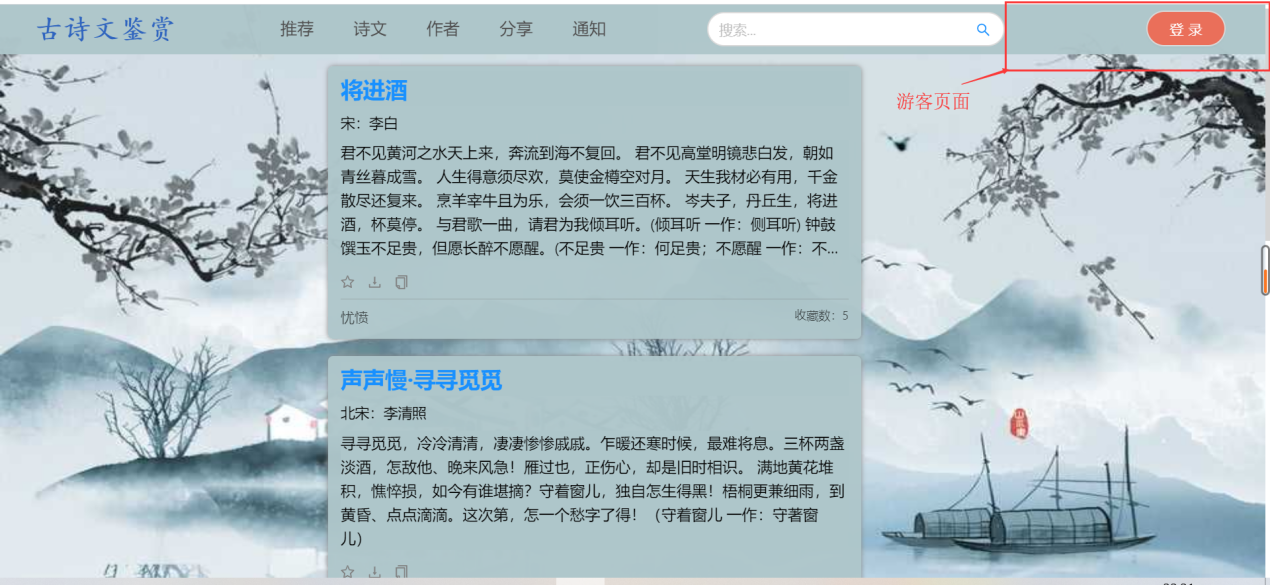 (1)用户需求:古诗词系统,浏览古诗、诗人、用户分享的资源等,具体如下:①浏览不同类别的诗词,例如思闺、战争、悼亡、思乡、怀古、禅、离别等;②浏览不同朝代的诗词,例如唐朝、宋朝、元朝等;③浏览推荐页面(此页面的诗词是根据各个诗词的收藏数排序)④用户可以在诗词展示页中点击特定的诗词,进入详情页中查看诗词全文、诗词注释以及诗词翻译⑤在线收藏功能:登录用户在浏览诗词的时候,如果是看到自己的喜欢的诗词内容,可以通过在线收藏的方式,把内容产品收藏到自己的收藏夹中,可以下次直接在收藏的内容中查找到自己喜欢的诗词内容,很方便。另外,可以对自己收藏的诗词内容进行搜索以及删除;⑥评论功能:登录用户可以查看诗词详情页中的评论,并且有发表评论的权限,也可以对自己的评论进行搜索以及删除;⑦分享功能:用户可以在“分享页面”浏览ji其他用户分享的诗词。也可以自己登录后上传想要分享的内容,其中,分享内容框体可自己手动输入文字,也可通过图片识别文字。⑧修改功能:用户可以修改自己的个人信息⑨查看管理员发布的所有通知⑩在头部搜索栏输入关键字,搜索对应信息的诗词列表集⑪登录12、注册13、找回密码(2)管理员需求:①个人信息管理:对自己的个人信息进行修改,并且可以对用户信息进行增删改查;②收藏、评论管理:对用户收藏的诗词以及发表的评论进行增删改查;③诗词管理:对数据库中存在的诗词、诗人、朝代信息、诗词类别信息等进行增删改查;④发布通知,并且对通知进行增删改查⑤对用户上传的资源进行审核,也可以增删查改(3)安全需求①直接将密码写入数据库中是极不安全的,因为任何可以打开数据库的人,都将可以直接看到这些密码,所以我们系统使用SHA-1将密码加密后再存储进数据库。