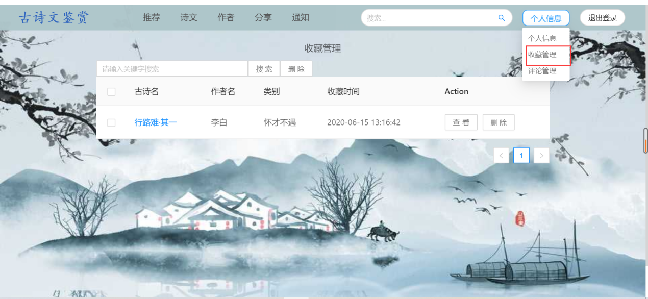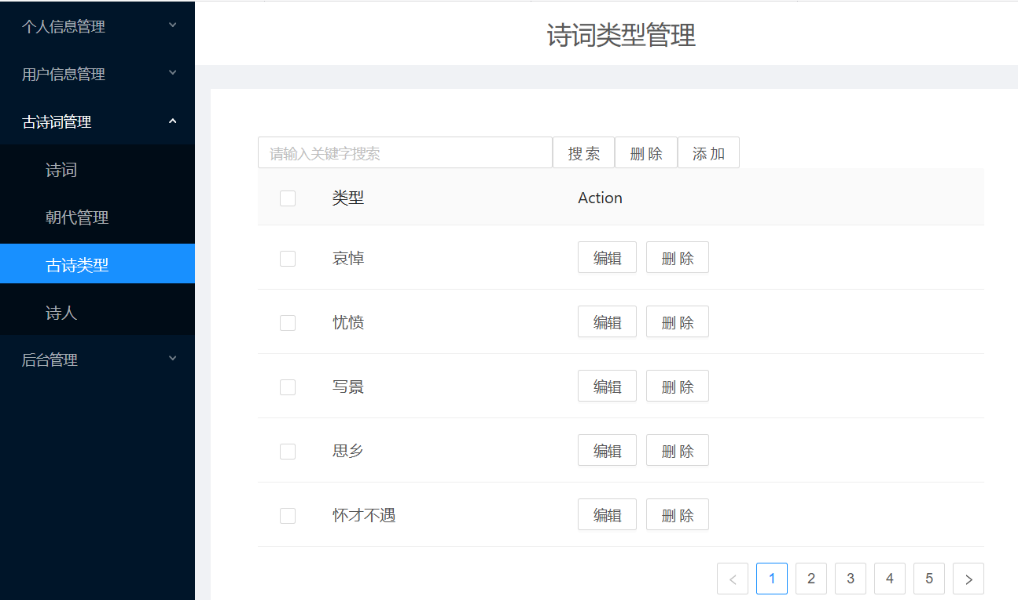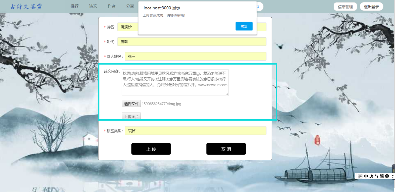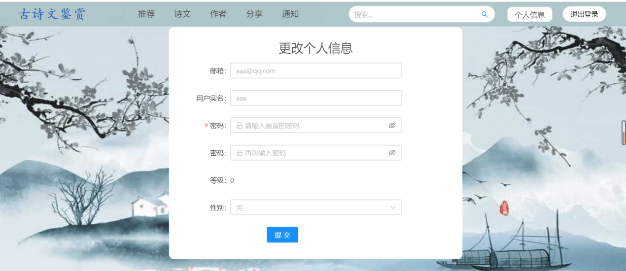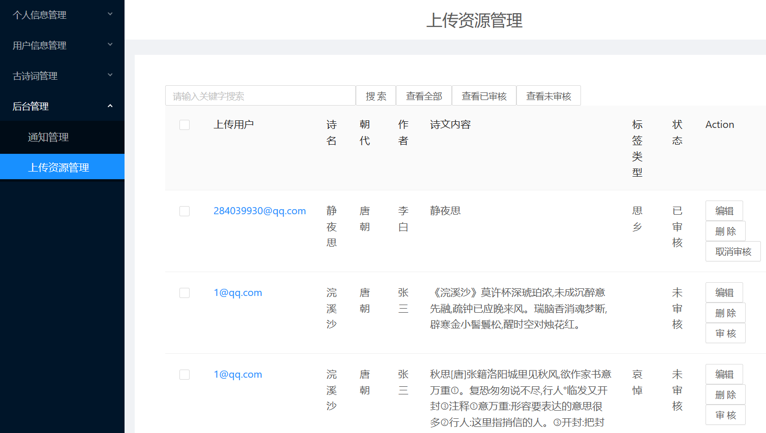 (1)用户需求:古诗词系统,浏览古诗、诗人、用户分享的资源等,具体如下:①浏览不同类别的诗词,例如思闺、战争、悼亡、思乡、怀古、禅、离别等;②浏览不同朝代的诗词,例如唐朝、宋朝、元朝等;③浏览推荐页面(此页面的诗词是根据各个诗词的收藏数排序)④用户可以在诗词展示页中点击特定的诗词,进入详情页中查看诗词全文、诗词注释以及诗词翻译⑤在线收藏功能:登录用户在浏览诗词的时候,如果是看到自己的喜欢的诗词内容,可以通过在线收藏的方式,把内容产品收藏到自己的收藏夹中,可以下次直接在收藏的内容中查找到自己喜欢的诗词内容,很方便。另外,可以对自己收藏的诗词内容进行搜索以及删除;⑥评论功能:登录用户可以查看诗词详情页中的评论,并且有发表评论的权限,也可以对自己的评论进行搜索以及删除;⑦分享功能:用户可以在“分享页面”浏览ji其他用户分享的诗词。也可以自己登录后上传想要分享的内容,其中,分享内容框体可自己手动输入文字,也可通过图片识别文字。⑧修改功能:用户可以修改自己的个人信息⑨查看管理员发布的所有通知⑩在头部搜索栏输入关键字,搜索对应信息的诗词列表集⑪登录12、注册13、找回密码(2)管理员需求:①个人信息管理:对自己的个人信息进行修改,并且可以对用户信息进行增删改查;②收藏、评论管理:对用户收藏的诗词以及发表的评论进行增删改查;③诗词管理:对数据库中存在的诗词、诗人、朝代信息、诗词类别信息等进行增删改查;④发布通知,并且对通知进行增删改查⑤对用户上传的资源进行审核,也可以增删查改(3)安全需求①直接将密码写入数据库中是极不安全的,因为任何可以打开数据库的人,都将可以直接看到这些密码,所以我们系统使用SHA-1将密码加密后再存储进数据库。