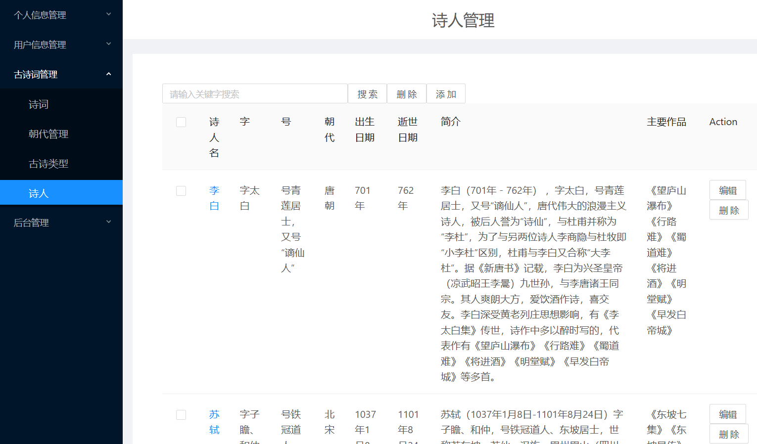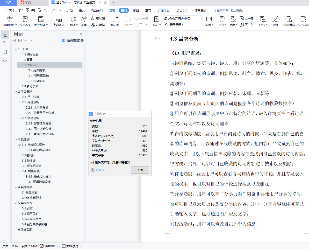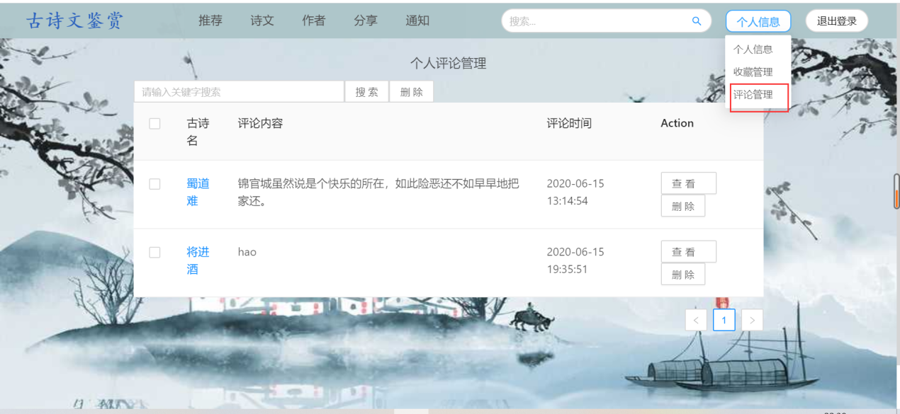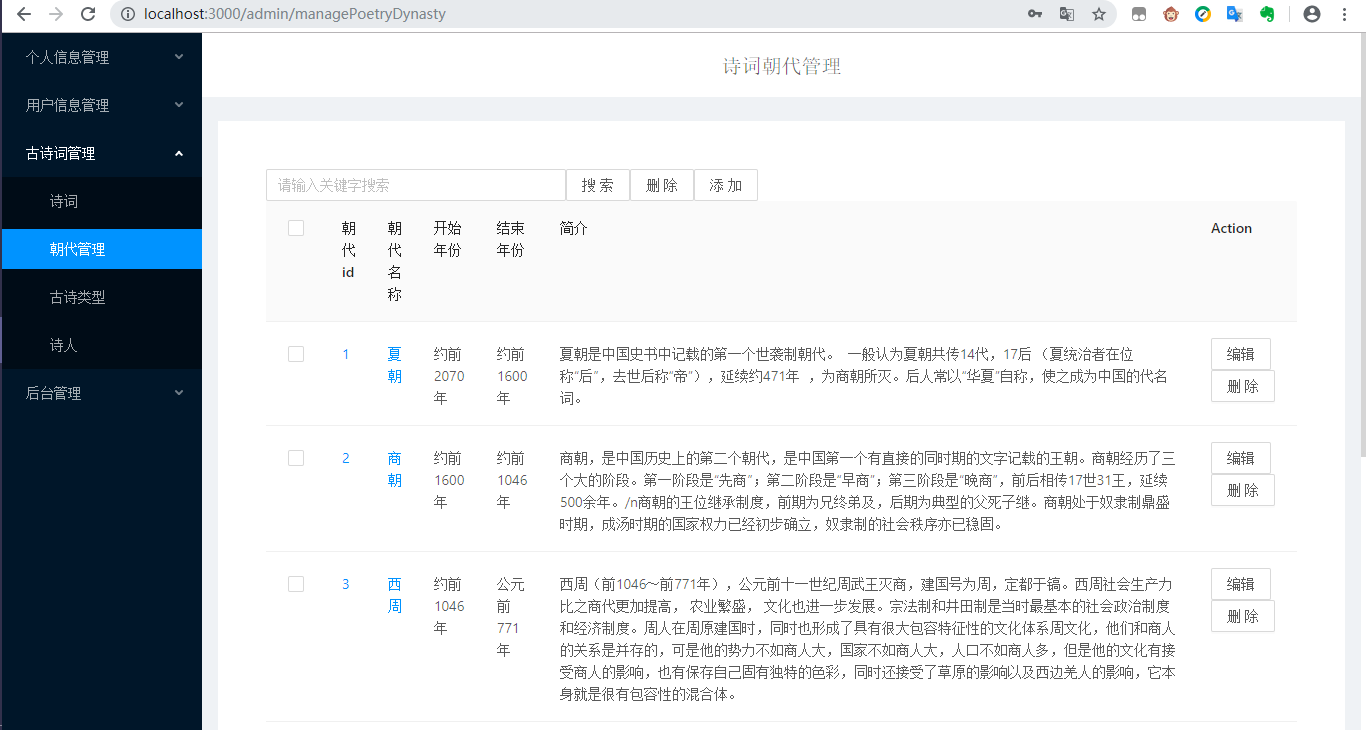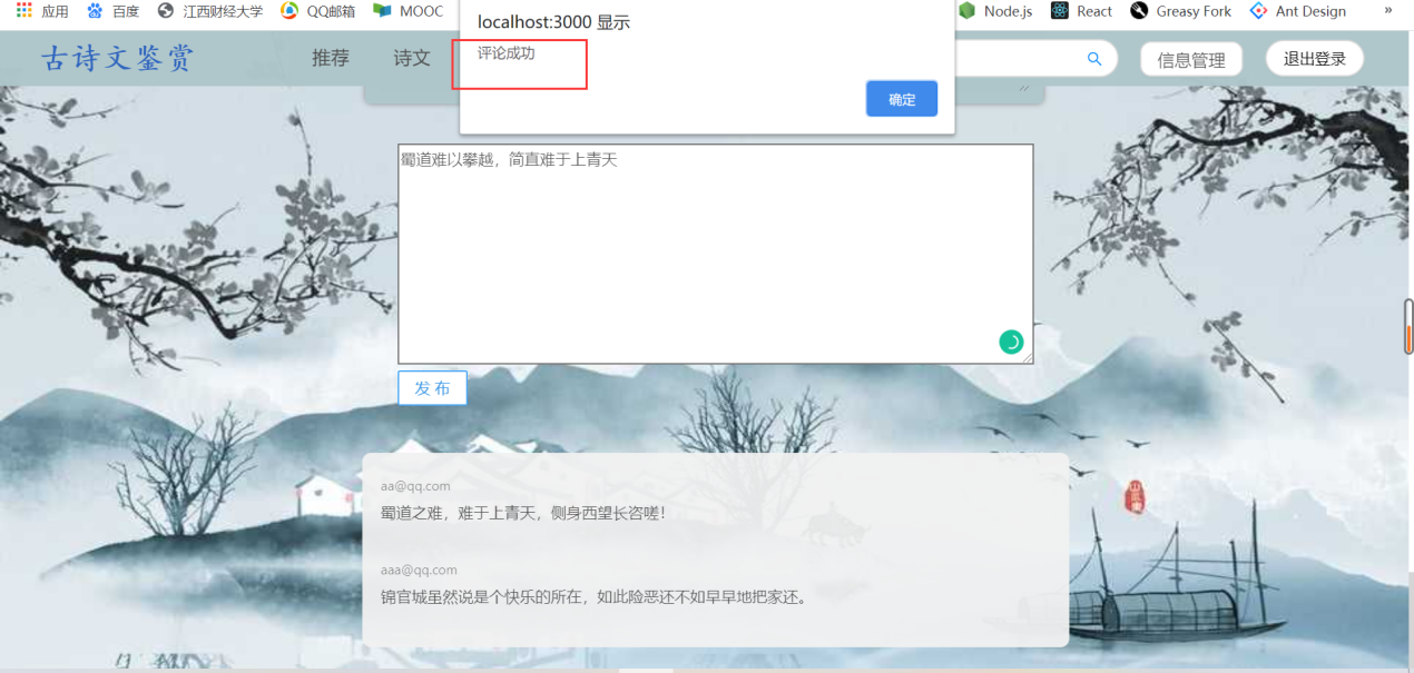 (1)用户需求:古诗词系统,浏览古诗、诗人、用户分享的资源等,具体如下:①浏览不同类别的诗词,例如思闺、战争、悼亡、思乡、怀古、禅、离别等;②浏览不同朝代的诗词,例如唐朝、宋朝、元朝等;③浏览推荐页面(此页面的诗词是根据各个诗词的收藏数排序)④用户可以在诗词展示页中点击特定的诗词,进入详情页中查看诗词全文、诗词注释以及诗词翻译⑤在线收藏功能:登录用户在浏览诗词的时候,如果是看到自己的喜欢的诗词内容,可以通过在线收藏的方式,把内容产品收藏到自己的收藏夹中,可以下次直接在收藏的内容中查找到自己喜欢的诗词内容,很方便。另外,可以对自己收藏的诗词内容进行搜索以及删除;⑥评论功能:登录用户可以查看诗词详情页中的评论,并且有发表评论的权限,也可以对自己的评论进行搜索以及删除;⑦分享功能:用户可以在“分享页面”浏览ji其他用户分享的诗词。也可以自己登录后上传想要分享的内容,其中,分享内容框体可自己手动输入文字,也可通过图片识别文字。⑧修改功能:用户可以修改自己的个人信息⑨查看管理员发布的所有通知⑩在头部搜索栏输入关键字,搜索对应信息的诗词列表集⑪登录12、注册13、找回密码(2)管理员需求:①个人信息管理:对自己的个人信息进行修改,并且可以对用户信息进行增删改查;②收藏、评论管理:对用户收藏的诗词以及发表的评论进行增删改查;③诗词管理:对数据库中存在的诗词、诗人、朝代信息、诗词类别信息等进行增删改查;④发布通知,并且对通知进行增删改查⑤对用户上传的资源进行审核,也可以增删查改(3)安全需求①直接将密码写入数据库中是极不安全的,因为任何可以打开数据库的人,都将可以直接看到这些密码,所以我们系统使用SHA-1将密码加密后再存储进数据库。