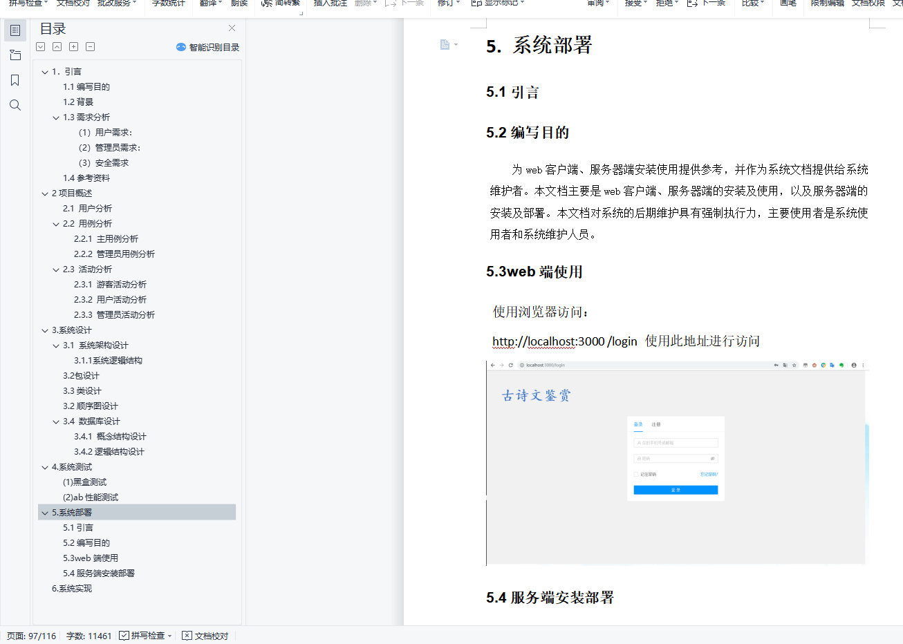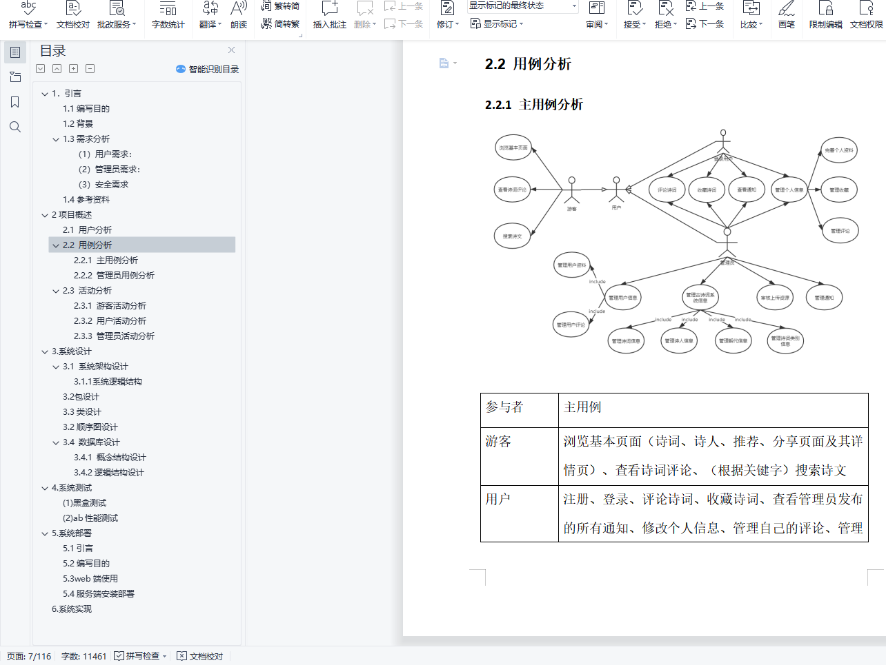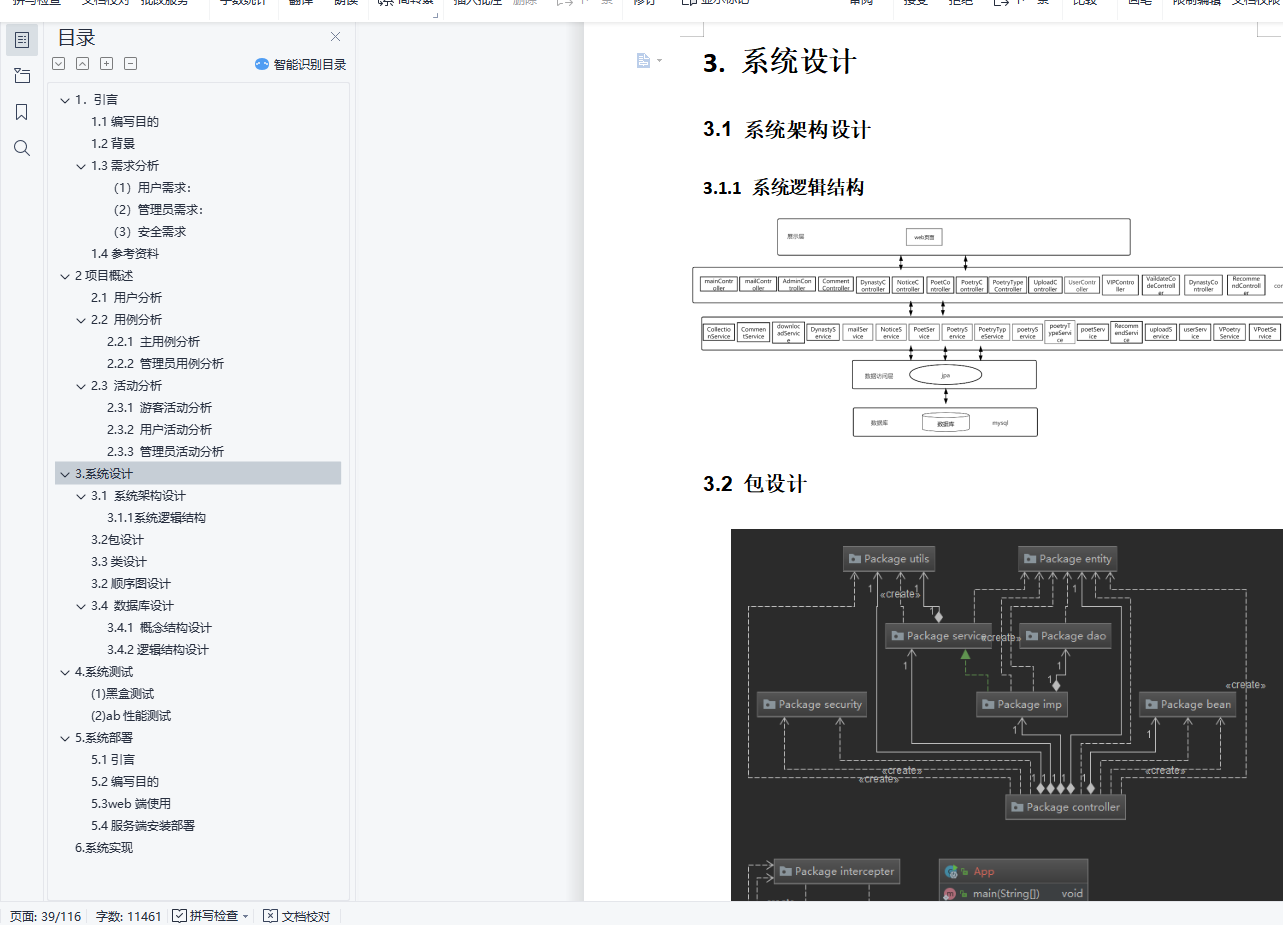目录1.引言 21.1编写目的 21.2 背景 21.3需求分析 3(1)用户需求: 3(2)管理员需求: 4(3) 安全需求 41.4参考资料 42项目概述 52.1 用户分析 72.2 用例分析 72.2.1 主用例分析 72.2.2 管理员用例分析 172.3 活动分析 242.3.1 游客活动分析 242.3.2 用户活动分析 272.3.3 管理员活动分析 303. 系统设计 393.1 系统架构设计 393.1.1 系统逻辑结构 393.2 包设计 393.3类设计 403.2顺序图设计 573.4 数据库设计 883.4.1 概念结构设计 883.4.2逻辑结构设计 884. 系统测试 91(1)黑盒测试 91(2) ab性能测试 965. 系统部署 975.1引言 975.2编写目的 975.3web端使用 975.4服务端安装部署 976. 系统实现 102