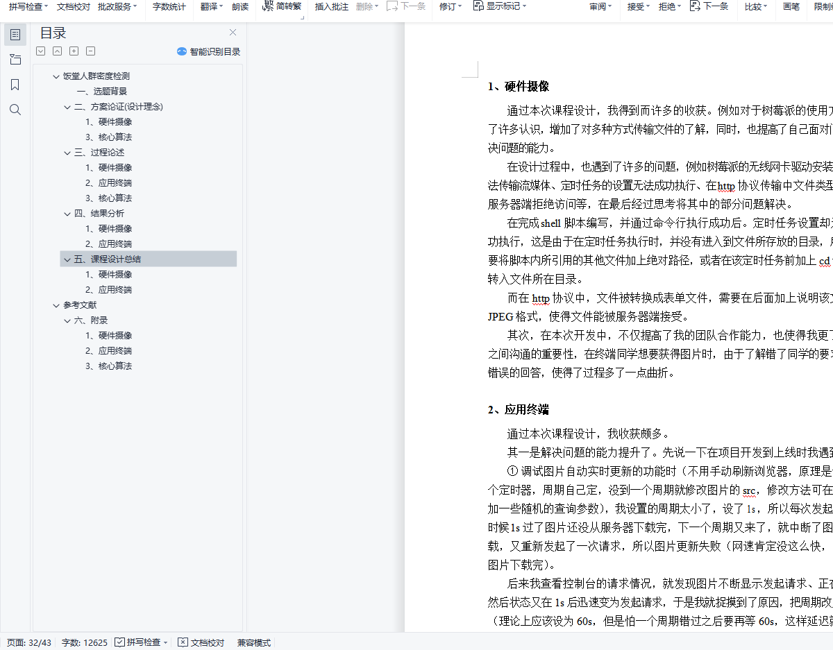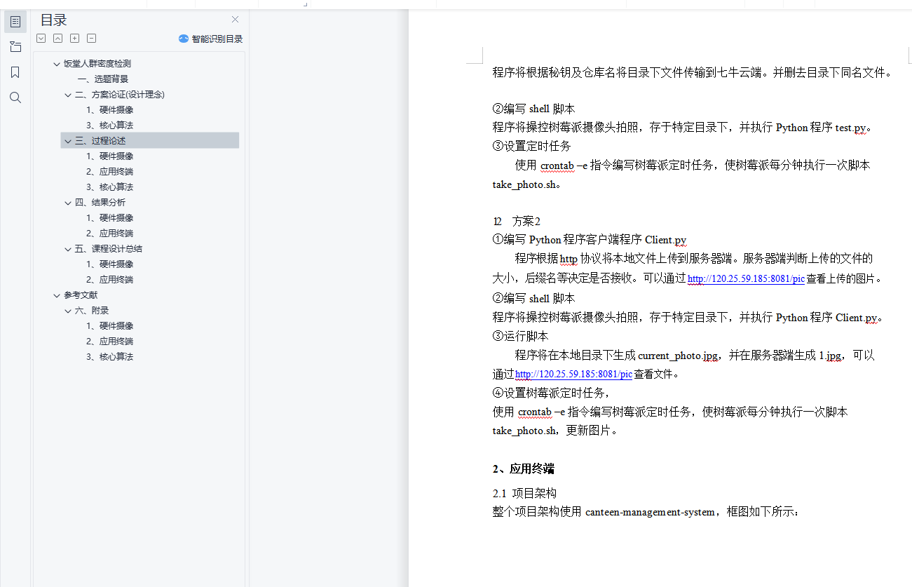 目录饭堂人群密度检测 4一、选题背景 4二、方案论证(设计理念) 41、硬件摄像 41.1 方案 1 51.2 方案 2 51.3 方案优劣选择 52、网页终端 52.1设计原理 52.2方案选择 52.3实现的功能 62.4系统的安全性 62.5数据的完整性 62.6应用的运行环境 72.7性能 73、核心算法 73.1设计要求 73.2手动提取特征回归人数 73.3深度卷积神经网络 8三、过程论述 101、硬件摄像 111.1 方案 1 111.2 方案 2 122、应用终端 122.1项目架构 122.2组件结构 142.3页面切换与路由跳转 163、核心算法 183.1手动提取特征 183.2MSCNN 19四、结果分析 241、硬件摄像 241.1 方案 1 241.2 方案 2 252、应用终端 263、核心算法 29手动提取特征 29MSCNN 30五、课程设计总结 321、硬件摄像 332、应用终端 333、核心算法 34手动提取特征 34MSCNN 34参考文献 36六、附录 371、硬件摄像 371.1 方案 1 371.2 方案 2 372、应用终端 383、核心算法 38手动提取特征应用代码 38MSCNN 应用代码 39饭堂人群密度检测一、选题背景在这个人工智能快速发展的时代,智能交通、智能机器人等人工智能化产品不断出现。作为人工智能的重要分支,计算机视觉起到了重要作用。它通过一系列的图像处理与模式识别手段,模拟现实世界中的生物视觉系统,并对捕捉到的图像进一步处理以满足不同领域的需求。本项目从生活细节出发,将计算机视觉应用在饭堂人数检测上,结合软硬件设施:算法基于深度卷积神经网络模型,硬件基于树莓派 RaspberryPi3 Model B, 终端为Web APP 或者公众号平台,学生可以通过终端获取饭堂人数密度热力图。一方面有助于师生根据饭堂人数避开就餐高峰期,另一方面将人群密度分布数据提供给饭堂设计人员,方便做出更好的设计。此外,本项目运用计算机视觉、模式识别领域的相关理论同样对火车站、地铁站、广场等人群容易集中的场所进行人群密度估计和人数统计。