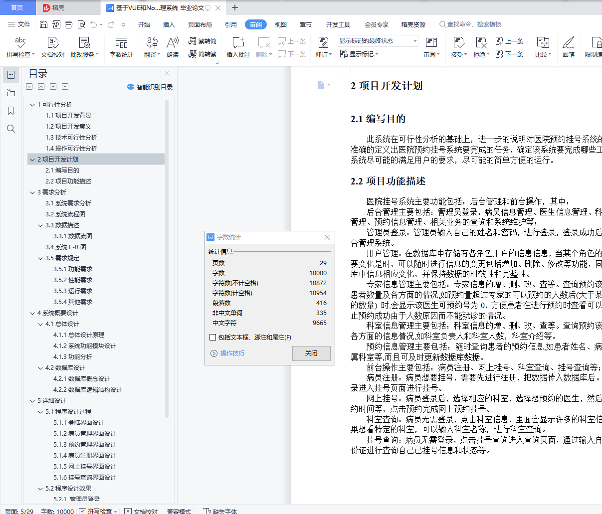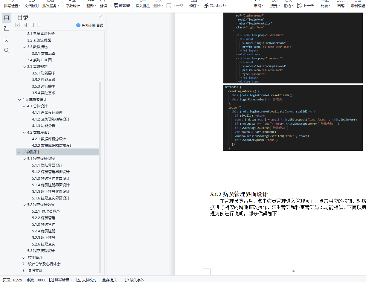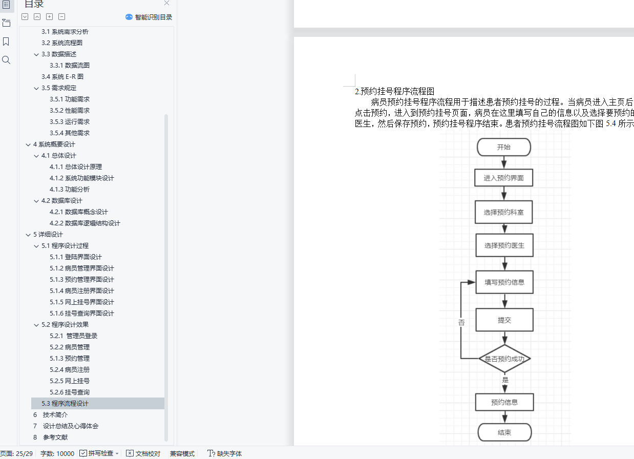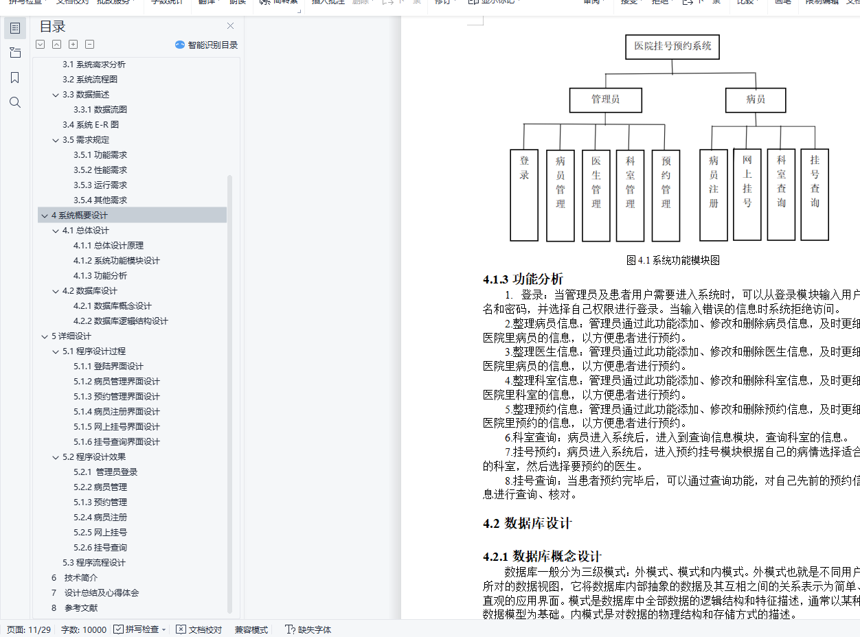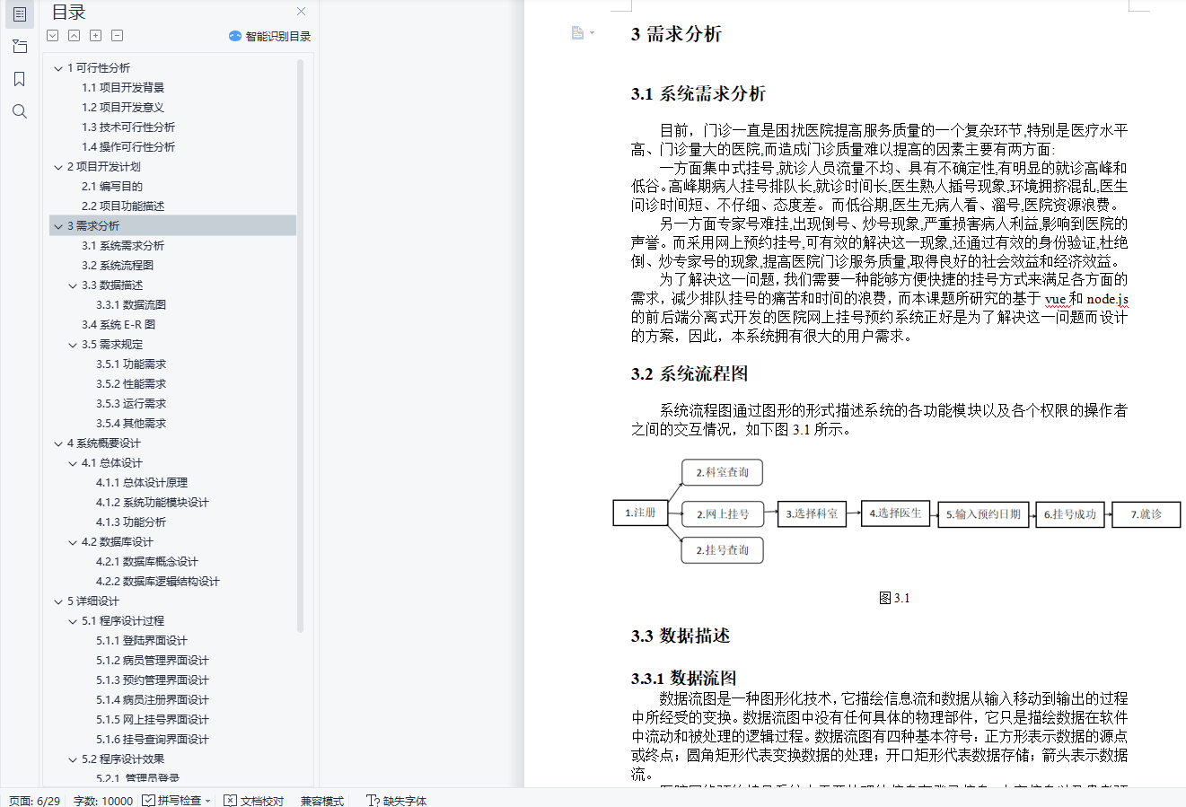 目 录1可行性分析 31.1项目开发背景 31.2项目开发意义 31.3技术可行性分析 31.4操作可行性分析 32项目开发计划 52.1编写目的 52.2项目功能描述 53需求分析 63.1系统需求分析 63.2系统流程图 63.3数据描述 63.3.1数据流图 63.4系统E-R图 73.5需求规定 83.5.1功能需求 83.5.2性能需求 93.5.3运行需求 93.5.4其他需求 94系统概要设计 104.1总体设计 104.1.1总体设计原理 104.1.2系统功能模块设计 104.1.3功能分析 114.2数据库设计 114.2.1数据库概念设计 114.2.2数据库逻辑结构设计 125详细设计 155.1程序设计过程 155.1.1登陆界面设计 155.1.2病员管理界面设计 165.1.3预约管理界面设计 175.1.4病员注册界面设计 185.1.5网上挂号界面设计 195.1.6挂号查询界面设计 205.2程序设计效果 205.2.1 管理员登录 205.2.2病员管理 215.1.3预约管理 225.2.4病员注册 235.2.5网上挂号 245.2.6挂号查询 255.3程序流程设计 256 技术简介 277 设计总结及心得体会 288 参考文献 291可行性分析1.1项目开发背景随着计算机技术的飞速发展,计算机在系统管理中的应用越来越普及,利用计算机实现各个系统的管理显得越来越重要。我国由于人口多,进而带来医院看病难的问题,由于人口众多,需要排队进行挂号,这样会浪费患者的时间,而且医院的效率也不高。患者挂号一项繁琐的过程,患者数量庞大,工作人员难免会出现错误,患者排队等候时间长,辗转过程多,影响了医疗的秩序。如何利用现代信息技术使企业拥有快速、高效的市场反映能力和高效率,是医院比较关心的问题。尽快建立一个医院预约挂号系统,完善现代医院的信息化管理机制,已成为医院生存发展的当务之急。所以,建立网上预约挂号系统势在必行。本系统以医院为背景,在认真调研和分析了医院的现状之后,根据用户的需求和各个功能的关系,作出了积极的设计方案。在新的管理资源和管理模式上,一定能使工作质量、工作效率等得到提高,推动医院发展的步伐。1.2项目开发意义开发医院预约挂号系统,使患者就诊系统化,规范化,自动化,从而达到提高管理效率的目的。本系统开发设计思想是实现患者预约挂号的数字化。尽量采用现有软硬件环境,及先进的管理系统开发方案,提高系统开发水平和应用效果的目的;系统应符合医院管理的规定,满足日常管理的需要,并达到操作过程中的直观,方便,实用,安全等要求;系统采用模块化程序设计方法,这样既便于系统功能的各种组合,又便于未参与开发的技术维护人员补充,维护;系统应具备数据库维护功能,及时根据用户需求进行数据的添加,删除,修改等操作。