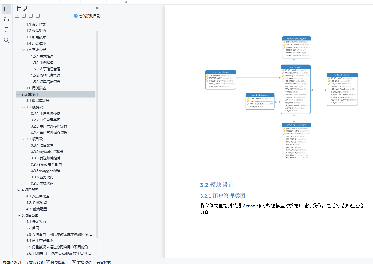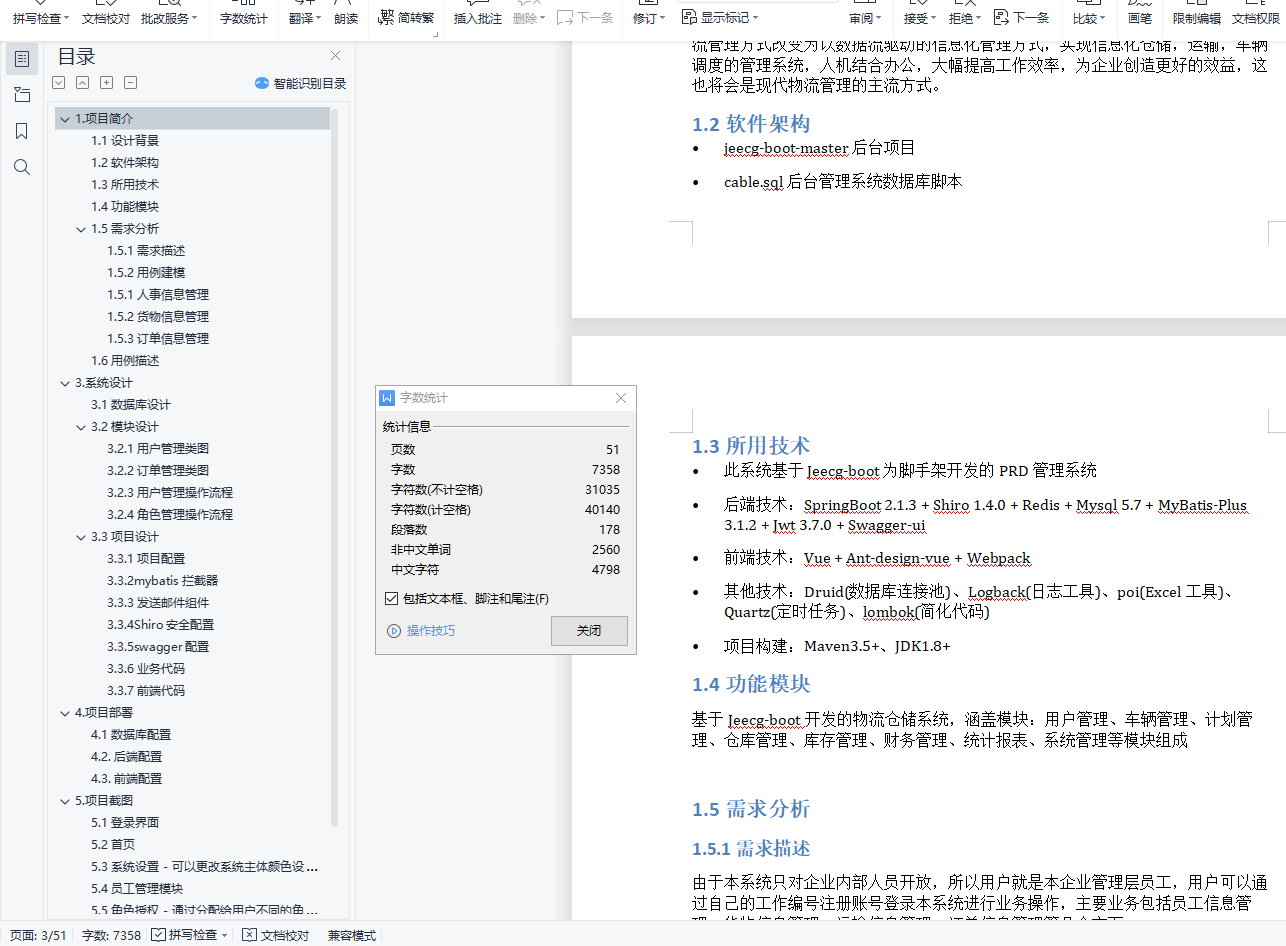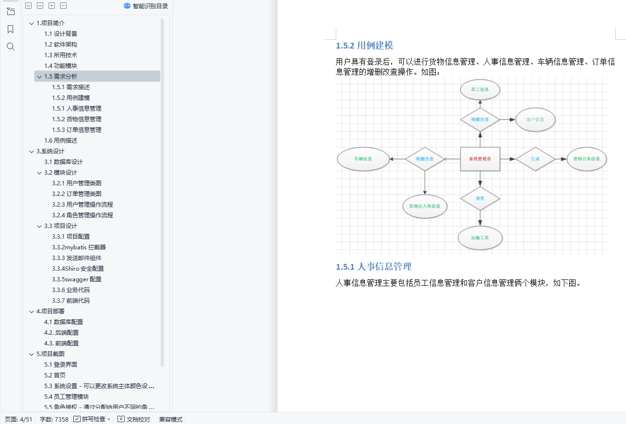 物流管理系统目录1.项目简介 21.1设计背景 31.2软件架构 31.3所用技术 31.4功能模块 41.5需求分析 41.5.1 需求描述 41.5.2 用例建模 41.5.1人事信息管理 41.5.2货物信息管理 51.5.3订单信息管理 61.6用例描述 73.系统设计 83.1数据库设计 83.2模块设计 93.2.1用户管理类图 93.2.2订单管理类图 103.2.3用户管理操作流程 103.2.4 角色管理操作流程 133.3项目设计 133.3.1项目配置 133.3.2mybatis拦截器 183.3.3发送邮件组件 213.3.4Shiro安全配置 233.3.5swagger配置 273.3.6业务代码 283.3.7前端代码 314.项目部署 384.1 数据库配置 384.2. 后端配置 404.3. 前端配置 435.项目截图 455.1 登录界面 455.2 首页 465.3 系统设置 - 可以更改系统主体颜色设置等等 465.4 员工管理模块 475.5 角色授权 - 通过分配给用户不同的角色,可访问不同的菜单列表 475.6. 计划导出 - 通过 excelPoi 技术实现信息导出功能 485.7车辆管理 485.8数据统计 496.总结 501.项目简介物流作为中国经济发展迅速的代表行业之一,在当今时代,它在我们身边无处不在,我们几乎可以随时随地看到它们的身影,为什么我们能在网上买的东西能在几天时间里送到我们手中,都是因为有许许多多的物流企业存在,然而随着社会经济的发展,我们的购买能力的提升,物流企业信息管理面临着巨大的压力,如果还是照以前采用纸笔管理信息的方式,企业信息管理通常比较繁杂,企业工作的效率实在是太低,此时采用计算机来管理企业信息成为了一种趋势,计算机相比人为操作有更高的效率,更安全,也给企业工作人员降低了工作压力,工作管理人员只需要通过操作电脑,就可以管理企业的信息,但是我们如何通过计算机来管理企业信息呢,这时开发一个物流管系统成为了众多中小型物流企业的第一任务,它对于很多企业是发展中必不可少的一部。在本文中,我将介绍用Java语言实现物流管理系统的基本过程,以及各种使用的技术。在物流管理系统中,主要任务是简化企业信息的增删改查操作,通过一系列的开发,本系统基本实现了物流企业所需要的功能,基本达到了数据的一致性和安全性,为了达到企业内部管理的要求,本系统对人事信息和客户信息进行管理,使物流管理系统更加完善