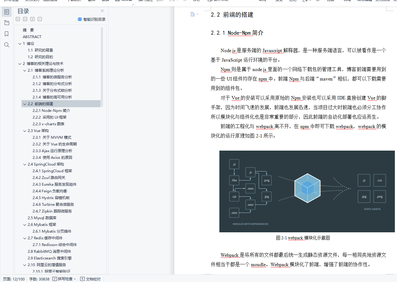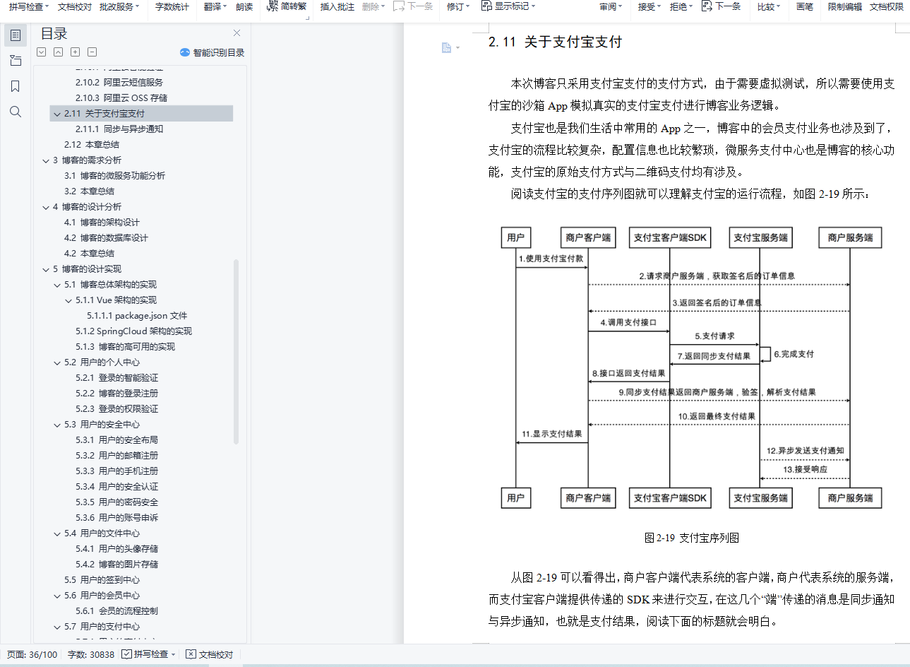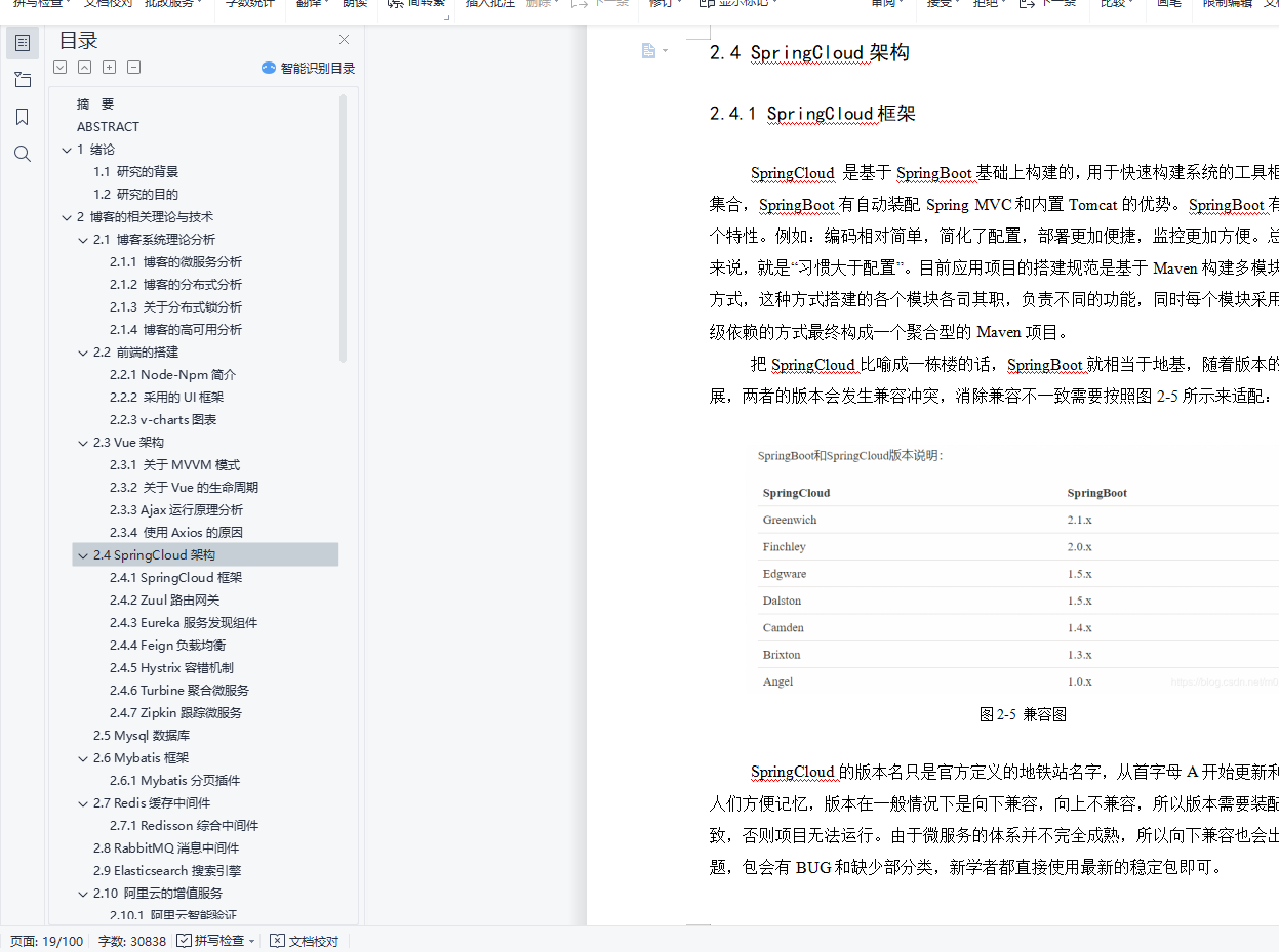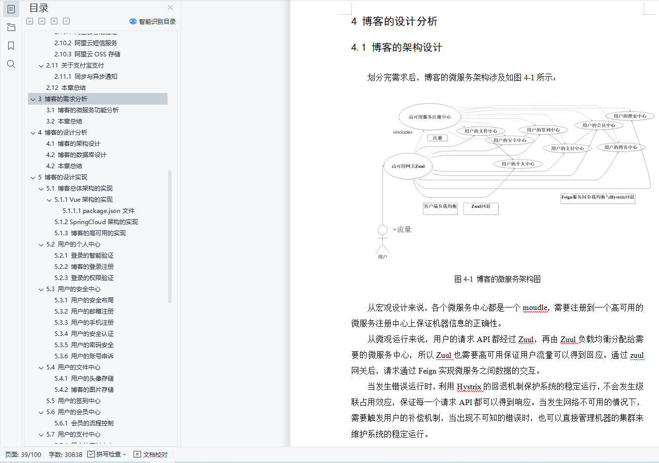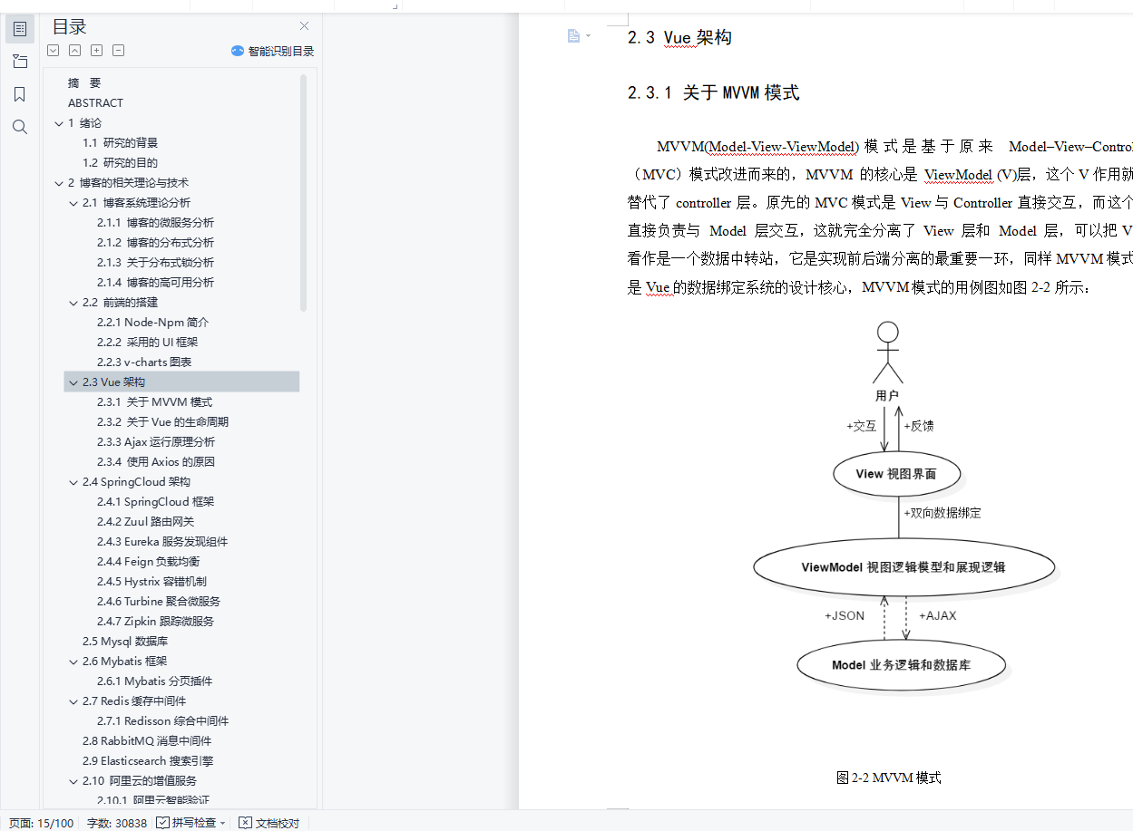 摘 要博客是用来分享自己的心情和动态拉近人与人之间的距离,它改变了人们的在网上的交流方式,也增强了互联网的趣味性。 “微服务”是最近两年开始流行起来,但是其实早在20年前都有专家提出过,只不过当时的用户量并不像现在那么高。例如:一个系统的功能越丰富就会导致技术债务越多,但是基于单体应用(一个war包)开发的代码库越来越臃肿,可维护性差,代码“不坏不修”。为此,引入“微服务”架构的方式可以改善这个状况,每个微服务中心均在独立的进程中负责每种功能的业务,由一系列独立运行的微服务中心共同构建整个系统。现在web的前后端分离是企业的一种趋势,前后端分离同样也是技术创新的一种体现。得益于开发分离的趋势,Vue与SpringCloud的组合方式在如今的Web网站开发中占据重要的位置。关键字: 微服务,Vue,SpringCloud.ABSTRACTBlog is used to share their feelings and dynamically close the distance between people. It changes the way people communicate on the Internet, and also enhances the interest of the Internet. "Micro service" has become popular in the past two years, but in fact, it was proposed by experts as early as 20 years ago, but the user volume at that time was not as high as it is now. For example, the more functions a system has, the more technical debts it will incur. However, the code base developed based on single application (a war package) is becoming more and more bloated, with poor maintainability and "no damage, no repair" of the code. Therefore, the introduction of "micro service" architecture can improve this situation. Each micro service center is responsible for the business of each function in an independent process, and a series of independent micro service centers jointly build the whole system. Nowadays, the separation of front end and back end of web is a trend of enterprises, and the separation of front end and back end is also a reflection of technological innovation. Thanks to the trend of development separation, the combination of Vue and spring cloud occupies an important position in today's Web site development.KEY WORDS: Micro service,Vue,SpringCloud.目 录摘 要 IABSTRACT II1 绪论 11.1 研究的背景 11.2 研究的目的 12 博客的相关理论与技术 22.1 博客系统理论分析 22.1.1 博客的微服务分析 22.1.2 博客的分布式分析 32.1.3 关于分布式锁分析 42.1.4 博客的高可用分析 52.2 前端的搭建 62.2.1 Node-Npm简介 62.2.2 采用的UI框架 72.2.3 v-charts图表 82.3 Vue架构 92.3.1 关于MVVM模式 92.3.2 关于Vue的生命周期 102.3.3 Ajax运行原理分析 112.3.4 使用Axios的原因 122.4 SpringCloud架构 132.4.1 SpringCloud框架 132.4.2 Zuul路由网关 142.4.3 Eureka服务发现组件 152.4.4 Feign负载均衡 162.4.5 Hystrix容错机制 172.4.6 Turbine聚合微服务 182.4.7 Zipkin跟踪微服务 192.5 Mysql数据库 202.6 Mybatis框架 212.6.1 Mybatis分页插件 222.7 Redis缓存中间件 232.7.1 Redisson综合中间件 242.8 RabbitMQ消息中间件 252.9 Elasticsearch搜索引擎 262.10 阿里云的增值服务 262.10.1 阿里云智能验证 262.10.2 阿里云短信服务 282.10.3 阿里云OSS存储 292.11 关于支付宝支付 302.11.1 同步与异步通知 312.12 本章总结 313 博客的需求分析 323.1 博客的微服务功能分析 323.2 本章总结 324 博客的设计分析 334.1 博客的架构设计 334.2 博客的数据库设计 344.2 本章总结 345 博客的设计实现 355.1 博客总体架构的实现 355.1.1 Vue架构的实现 355.1.2 SpringCloud架构的实现 375.1.3 博客的高可用的实现 385.2 用户的个人中心 395.2.1 登录的智能验证 395.2.2 博客的登录注册 415.2.3 登录的权限验证 425.3 用户的安全中心 455.3.1 用户的安全布局 455.3.2 用户的邮箱注册 465.3.3 用户的手机注册 495.3.4 用户的安全认证 515.3.5 用户的密码安全 525.3.6 用户的账号申诉 535.4 用户的文件中心 545.4.1 用户的头像存储 545.4.2 博客的图片存储 555.5 用户的签到中心 565.6 用户的会员中心 585.6.1 会员的流程控制 585.7 用户的支付中心 595.7.1 用户的支付中心 595.7.2 用户的账户钱包 605.7.3 用户的会员支付 635.7.4 用户的支付账单 675.8 用户的博客中心 695.8.1 用户的访问主页 695.8.2 用户的文章中心 705.8.3 用户的文章布局 755.8.4 点赞用户的文章 765.8.5 收藏用户的文章 785.8.6 评论用户的文章 795.8.7 博客的文章排行榜 805.9 博客的搜索中心 825.9.1 搜索引擎的应用 825.9.2 博客的分类搜索 835.9.3 博客的分类主页 855.10 本章总结 856 博客的测试分析 866.1 博客的请求抗压性分析 866.2 博客的功能扩展性分析 877 博客的注意事项 887.1 博客整合Hystrix后首次请求失败问题 887.2 SpringCloud中Turbine 1.X版本BUG 887.3 关于前后分离的CORS跨域问题 897.3.1 前后端分离的跨域 897.3.2 Nginx反向代理 908 结束语 91致 谢 92参考文献 93