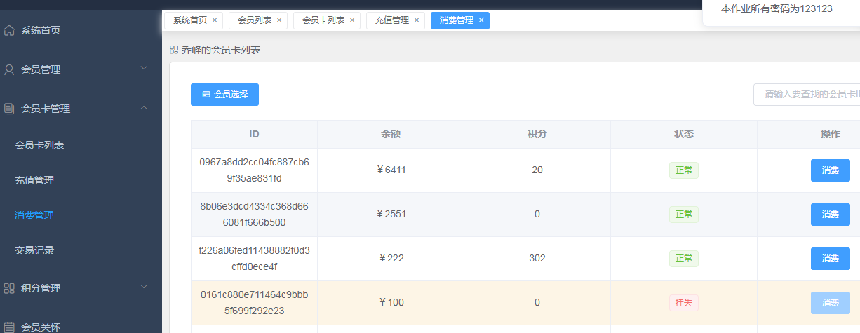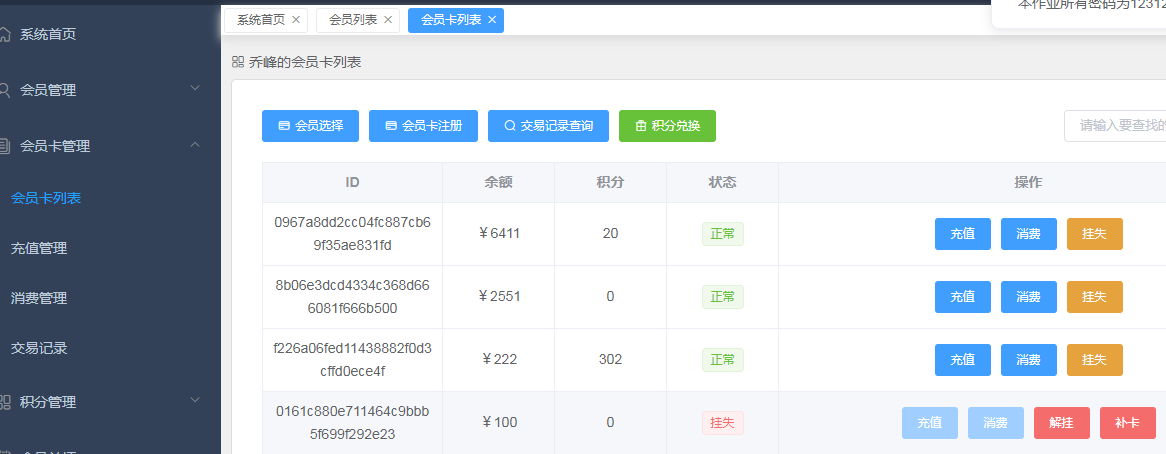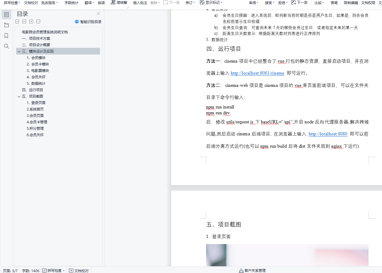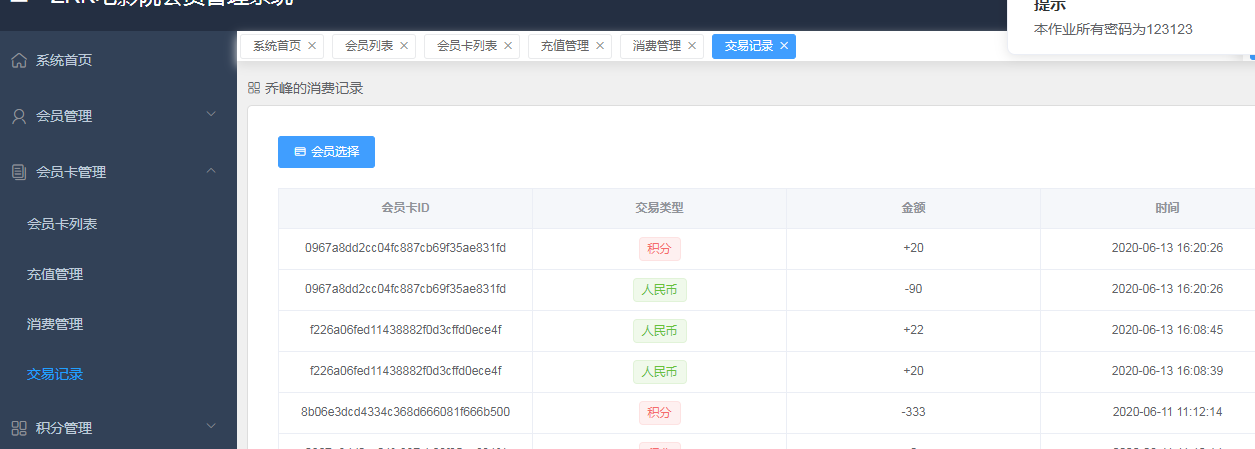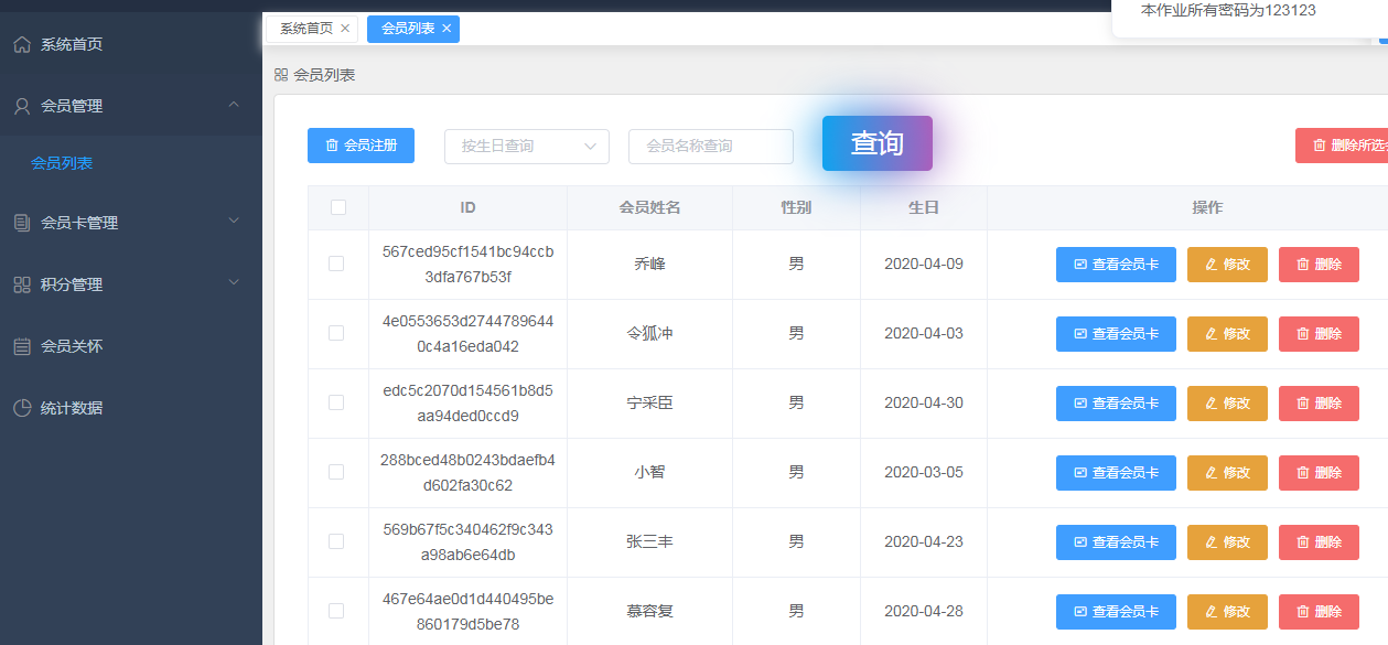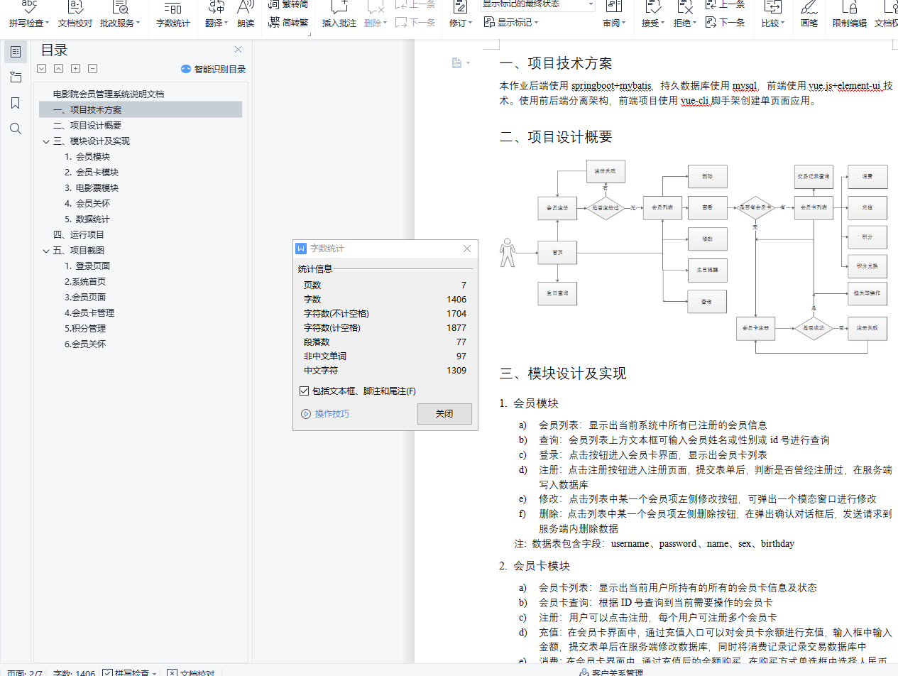 电影院会员管理系统说明文档目录电影院会员管理系统说明文档 1一、项目技术方案 1二、项目设计概要 1三、模块设计及实现 11. 会员模块 22. 会员卡模块 23. 电影票模块 24. 会员关怀 25. 数据统计 3四、运行项目 3五、项目截图 31. 登录页面 32. 系统首页 43. 会员页面 44. 会员卡管理 55. 积分管理 66. 会员关怀 6一、项目技术方案本作业后端使用springboot+mybatis,持久数据库使用mysql,前端使用vue.js+element-ui技术。使用前后端分离架构,前端项目使用vue-cli脚手架创建单页面应用。
