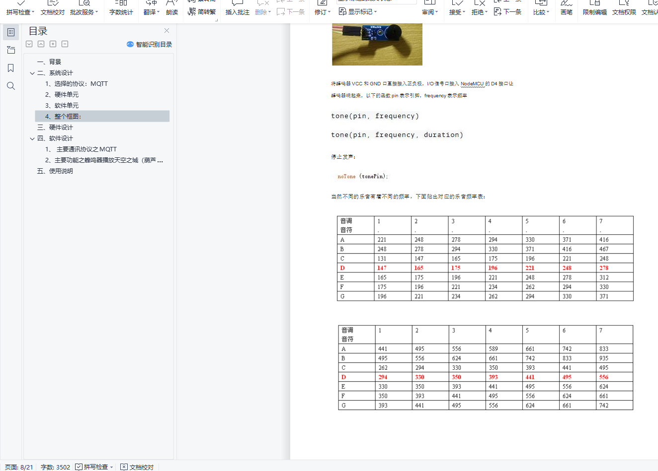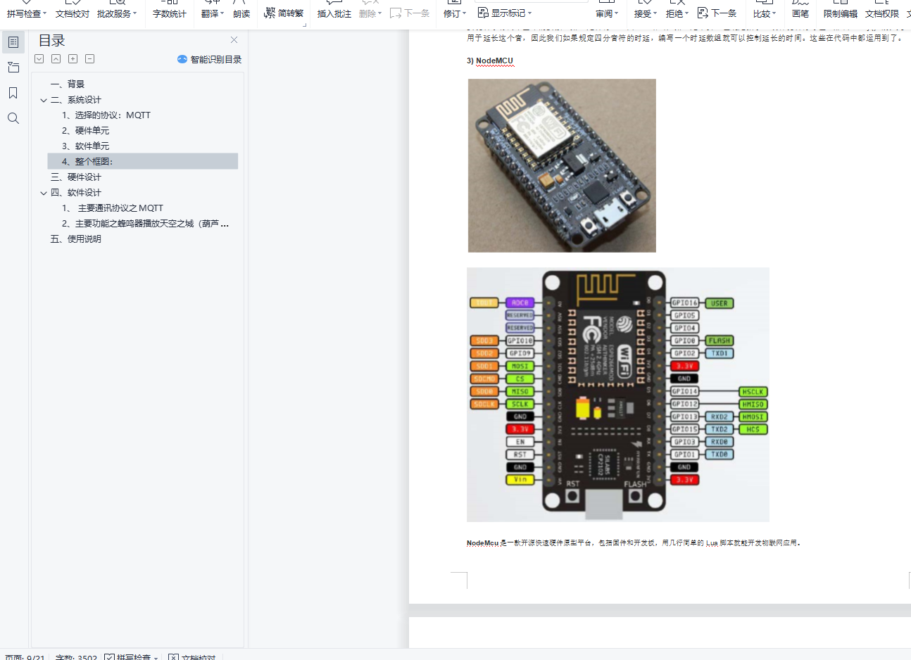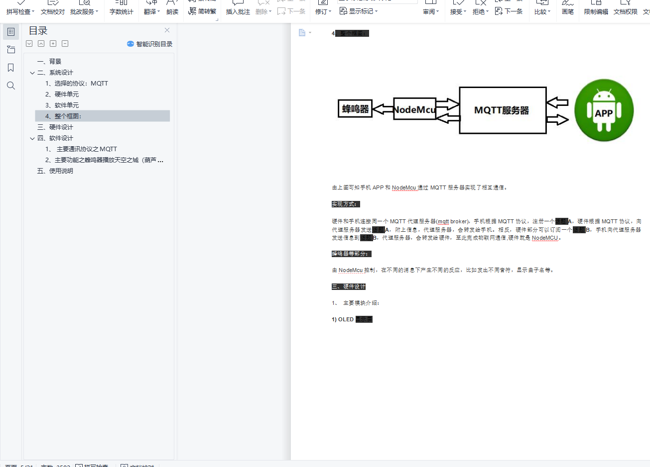 目录一、背景 1二、系统设计 11、选择的协议:MQTT 32、硬件单元 33、软件单元 34、整个框图: 4三、硬件设计 4四、软件设计 121、 主要通讯协议之MQTT 122、主要功能之蜂鸣器播放天空之城(葫芦娃) 16五、使用说明 18一、背景智能家居行业经过了十几年的发展,就现在而言,还称得上是方兴未艾。在互联网巨头的介入下后得到快速提升,智能家居概念在市场中得到广泛普及,而多项辅助技术也借此机会发展起来。在许多行业都将目光投向智能化产业转型的时候,不能忽视的是,相关的技术必定是取得一定突破,才使智能化成为可能。物联网,指利用各种信息传感设备,如射频识别装置、红外传感器、光扫描等种种装置与互联网结合起来而形成的一个巨大网络。它可以利用信息传感设备将家居生活有关的各种子系统有机地结合在一起,并与互联网连接起来,进行监控、管理信息交换和通讯,实现家居智能化。一个最常见的物联网场景:远在家里的硬件,要发一个信息给我的手机。 实现方案是,硬件和手机连接同一个MQTT 代理服务器(mqtt broker),手机根据MQTT协议,注册一个话题A,硬件根据MQTT协议,向代理服务器发送话题A,附上信息。代理服务器,会转发给手机,至此完成物联网通信,硬件就是NodeMCU。