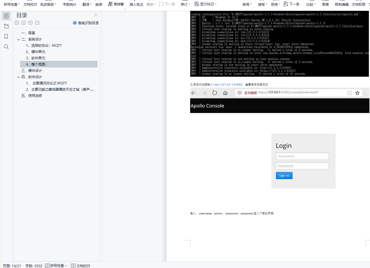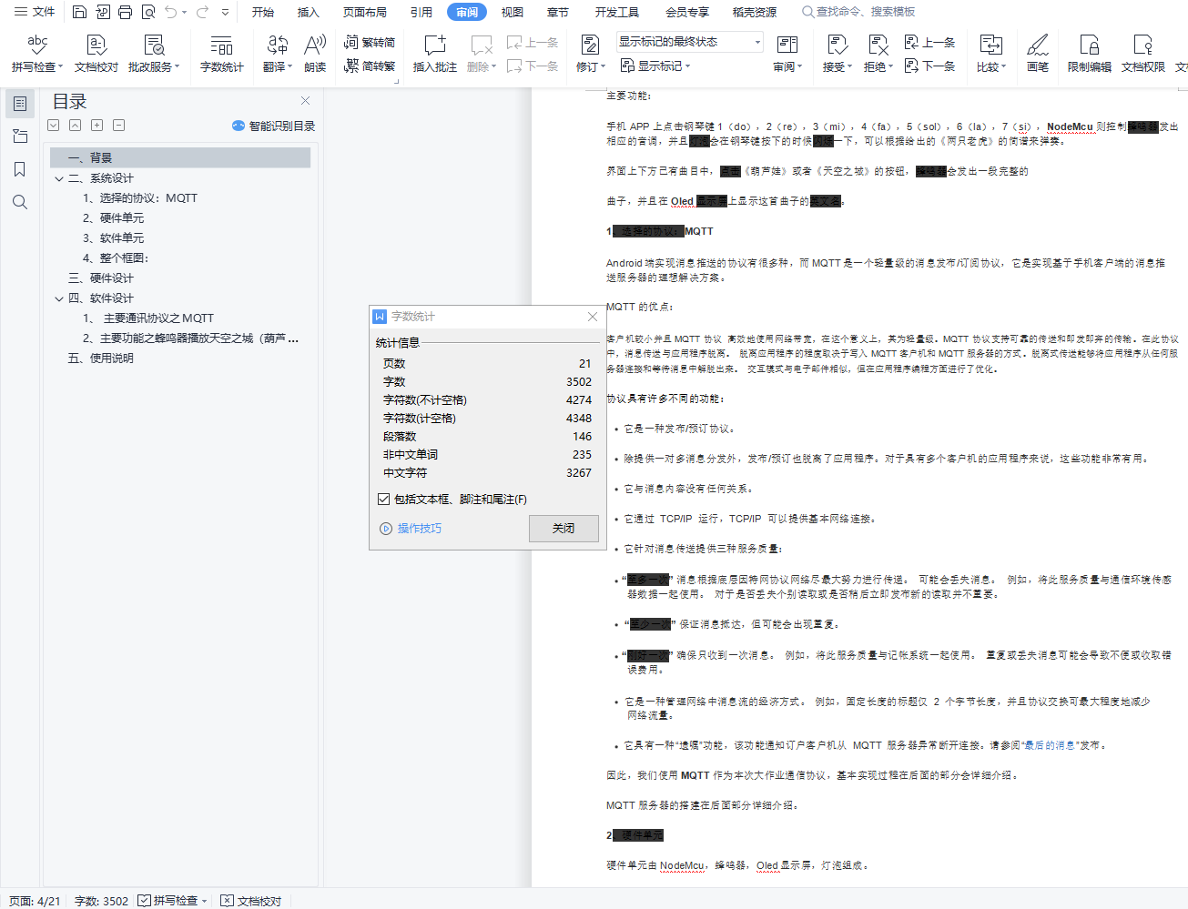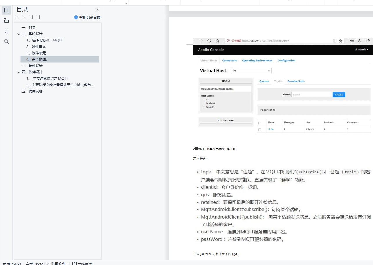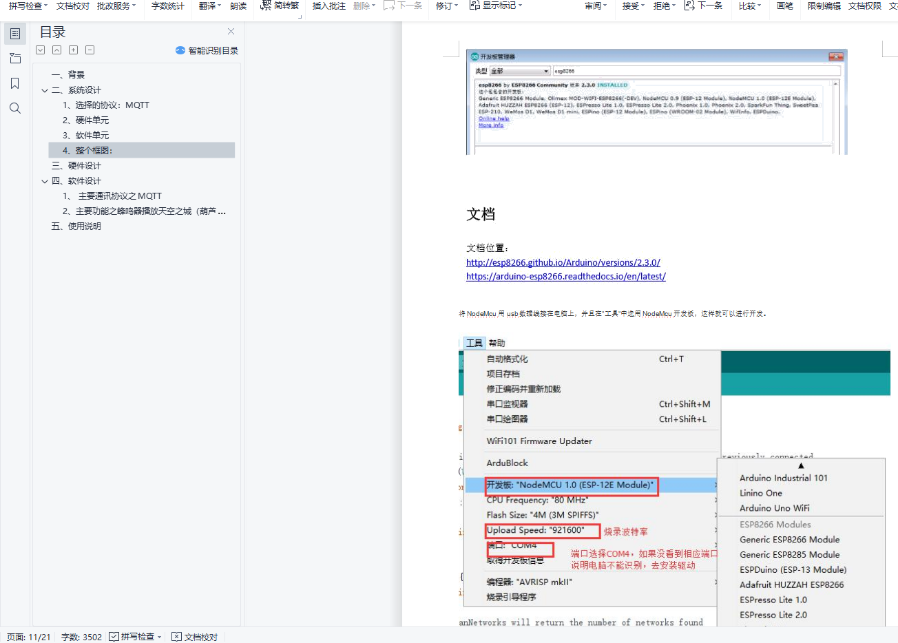 目录一、背景 1二、系统设计 11、选择的协议:MQTT 32、硬件单元 33、软件单元 34、整个框图: 4三、硬件设计 4四、软件设计 121、 主要通讯协议之MQTT 122、主要功能之蜂鸣器播放天空之城(葫芦娃) 16五、使用说明 18一、背景智能家居行业经过了十几年的发展,就现在而言,还称得上是方兴未艾。在互联网巨头的介入下后得到快速提升,智能家居概念在市场中得到广泛普及,而多项辅助技术也借此机会发展起来。在许多行业都将目光投向智能化产业转型的时候,不能忽视的是,相关的技术必定是取得一定突破,才使智能化成为可能。物联网,指利用各种信息传感设备,如射频识别装置、红外传感器、光扫描等种种装置与互联网结合起来而形成的一个巨大网络。它可以利用信息传感设备将家居生活有关的各种子系统有机地结合在一起,并与互联网连接起来,进行监控、管理信息交换和通讯,实现家居智能化。一个最常见的物联网场景:远在家里的硬件,要发一个信息给我的手机。 实现方案是,硬件和手机连接同一个MQTT 代理服务器(mqtt broker),手机根据MQTT协议,注册一个话题A,硬件根据MQTT协议,向代理服务器发送话题A,附上信息。代理服务器,会转发给手机,至此完成物联网通信,硬件就是NodeMCU。