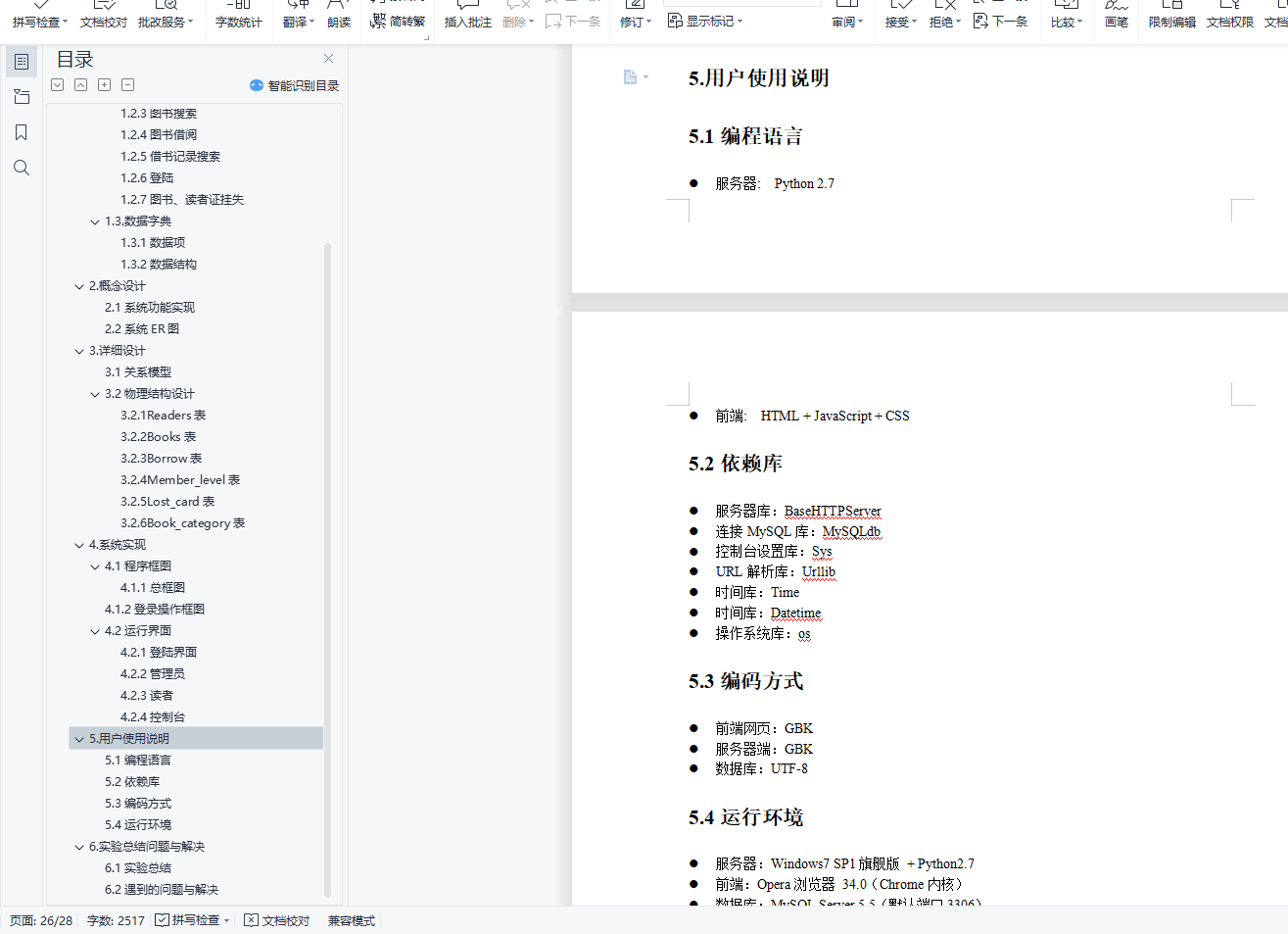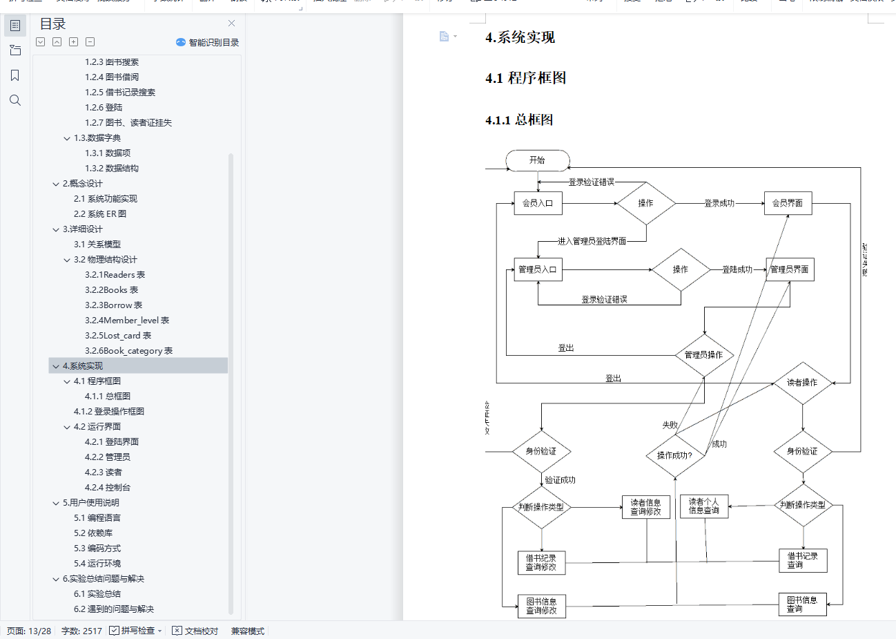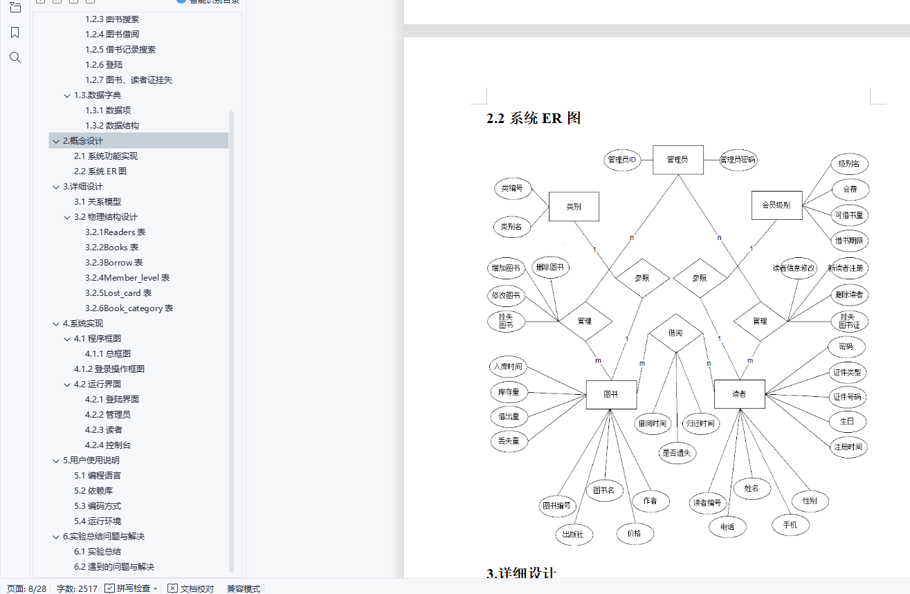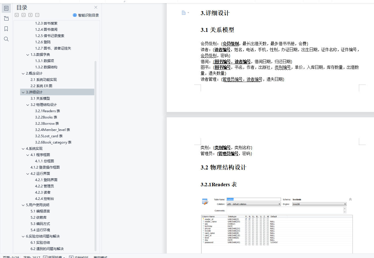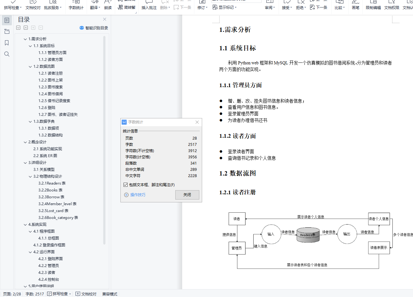 目录数据库系统原理实验报告 11.需求分析 31.1系统目标 31.2数据流图 31.3.数据字典 72.概念设计 92.1系统功能实现 92.2系统ER图 93.详细设计 103.1关系模型 103.2物理结构设计 114.系统实现 134.1程序框图 144.2运行界面 185.用户使用说明 275.1编程语言 275.2依赖库 285.3编码方式 285.4运行环境 286.实验总结问题与解决 286.1实验总结 286.2遇到的问题与解决 281.需求分析1.1系统目标利用Python web框架和MySQL开发一个仿真模拟的图书借阅系统。分为管理员和读者两个方面的功能实现。1.1.1管理员方面增、删、改、挂失图书信息和读者信息;查看用户信息和图书信息。登录管理员界面为读者办理借书还书1.1.2读者方面登录读者界面查询借书记录和个人信息