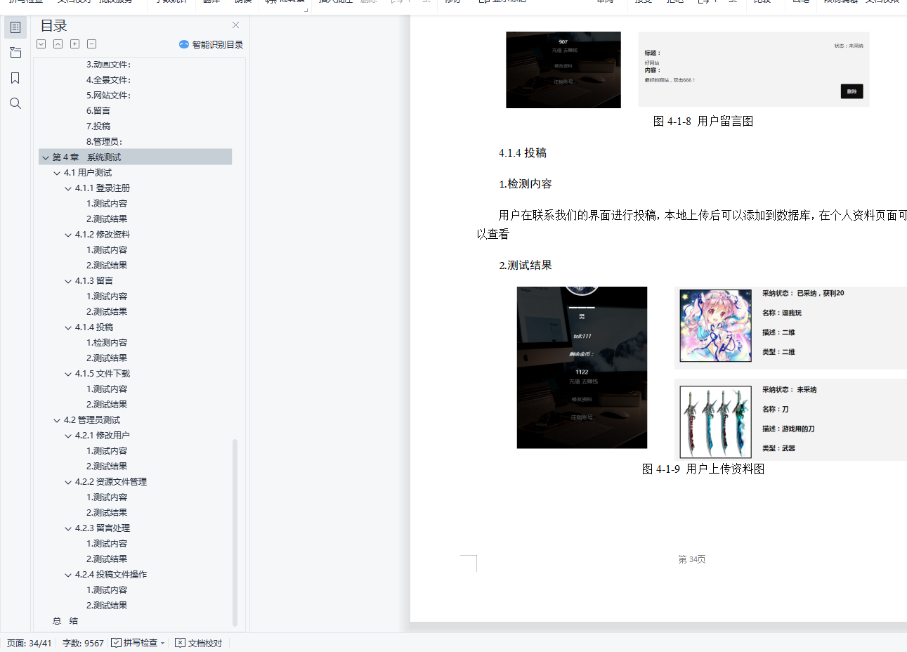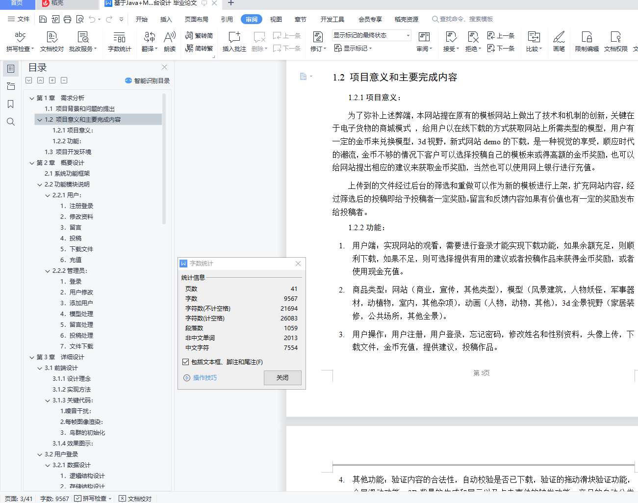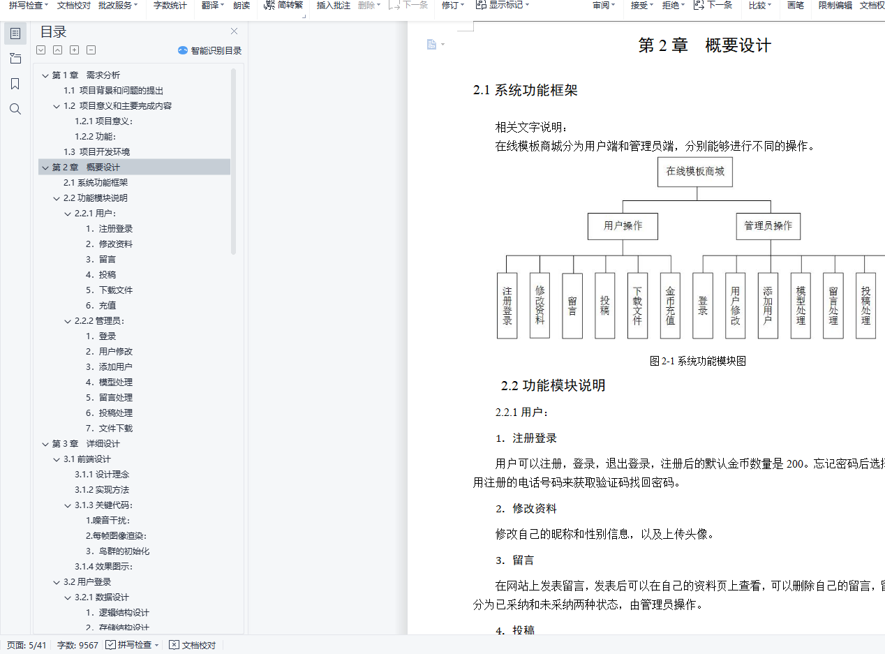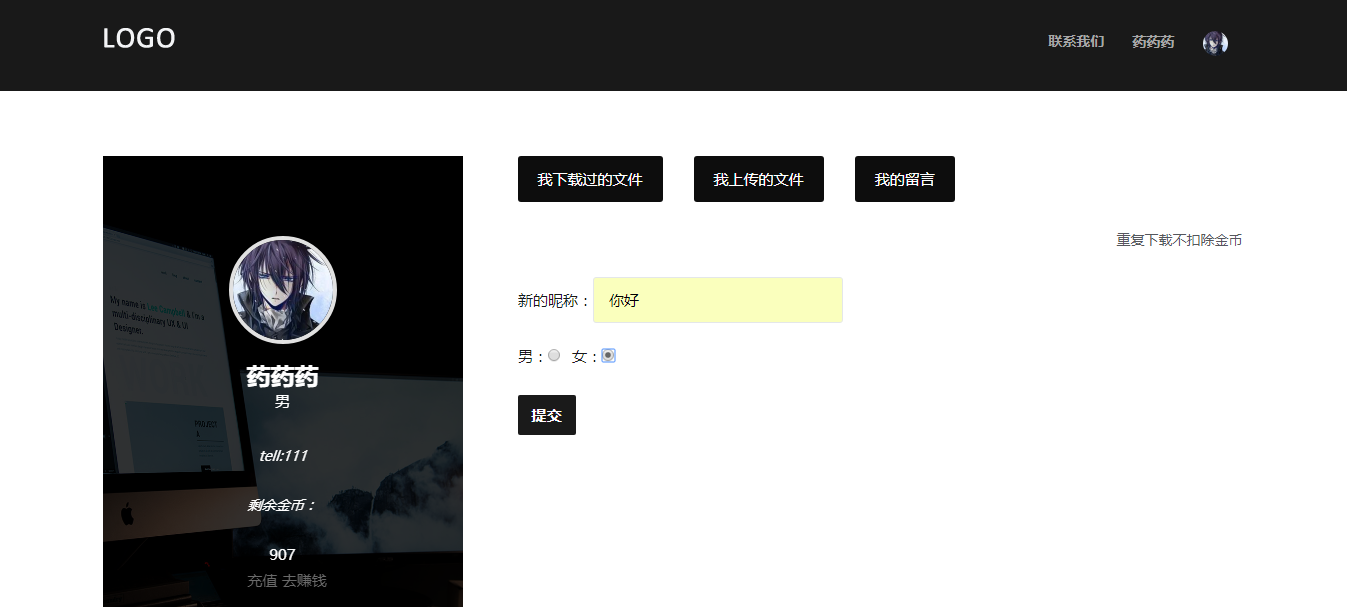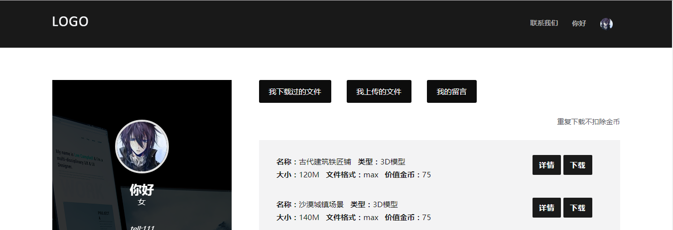 目 录第1章 需求分析 31.1 项目背景和问题的提出 31.2 项目意义和主要完成内容 31.2.1项目意义: 31.2.2功能: 31.3 项目开发环境 4第2章 概要设计 42.1系统功能框架 42.2功能模块说明 42.2.1用户: 42.2.2管理员: 5第3章 详细设计 73.1前端设计 73.1.1设计理念 73.1.2实现方法 73.1.3关键代码: 73.1.4效果图示: 103.2用户登录 113.2.1数据设计 113.2.2相关ajax实现 123.1.3流程图 143.3资源文件 143.1.1数据设计 143.1.2代码描述 153.1.3流程图 193.4留言 193.1.1数据设计 193.1.2相关代码 203.1.3流程图 213.5投稿 213.1.1数据设计 213.1.2算法描述 223.1.3流程图 243.7 数据库设计 243.7.1数据设计 243.7.2物理设计表汇总 26第4章 系统测试 304.1用户测试 304.1.1登录注册 304.1.2修改资料 314.1.3留言 334.1.4投稿 334.1.5文件下载 344.2管理员测试 354.2.1修改用户 354.2.2资源文件管理 364.2.3留言处理 384.2.4投稿文件操作 38总 结 40第1章 需求分析1.1 项目背景和问题的提出时代的变化,导致日新月异的网站表达方式,3D网站和3D游戏的火热,也促进了开发,学习人员对一些3D模型,全景视图等方面的需求,在初学者需要调用一定的模型文件来完成具体场景的搭建或者在项目的完成过程中建模师需要适量地减少工作量的时候,都需要在网上下载相对的模型来进行项目完善。但是在使用现在的一些现有的模板网站的时候,许多网站的安排的有一些不合理性,或者是一些网站的模型过少以及模板质量的不合格性。1.2 项目意义和主要完成内容1.2.1项目意义:为了弥补上述弊端,本网站提在原有的模板网站上做出了技术和机制的创新,关键在于电子货物的商城模式 ,给用户以在线下载的方式获取网站上所需类型的模型,用户有一定的金币来兑换模型,3d视野,新式网站demo的下载,是一种视觉的享受,顺应时代的潮流,金币不够的情况下客户可以选择投稿自己的模板来或得高额的金币奖励,也可以给网站提出相应的建议来获取金币奖励,当然也可以使用网上银行进行充值。上传到的文件经过后台的筛选和重做可以作为新的模板进行上架,扩充网站内容,经过筛选后的投稿即给予投稿者一定奖励。留言和反馈内容如果有价值也有一定的奖励发布给投稿者。