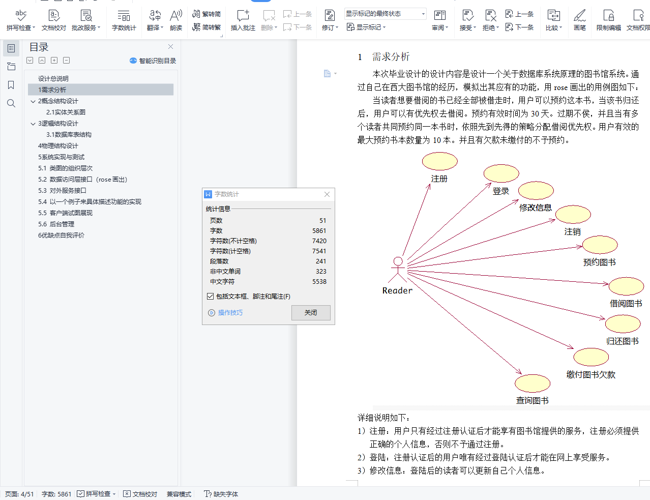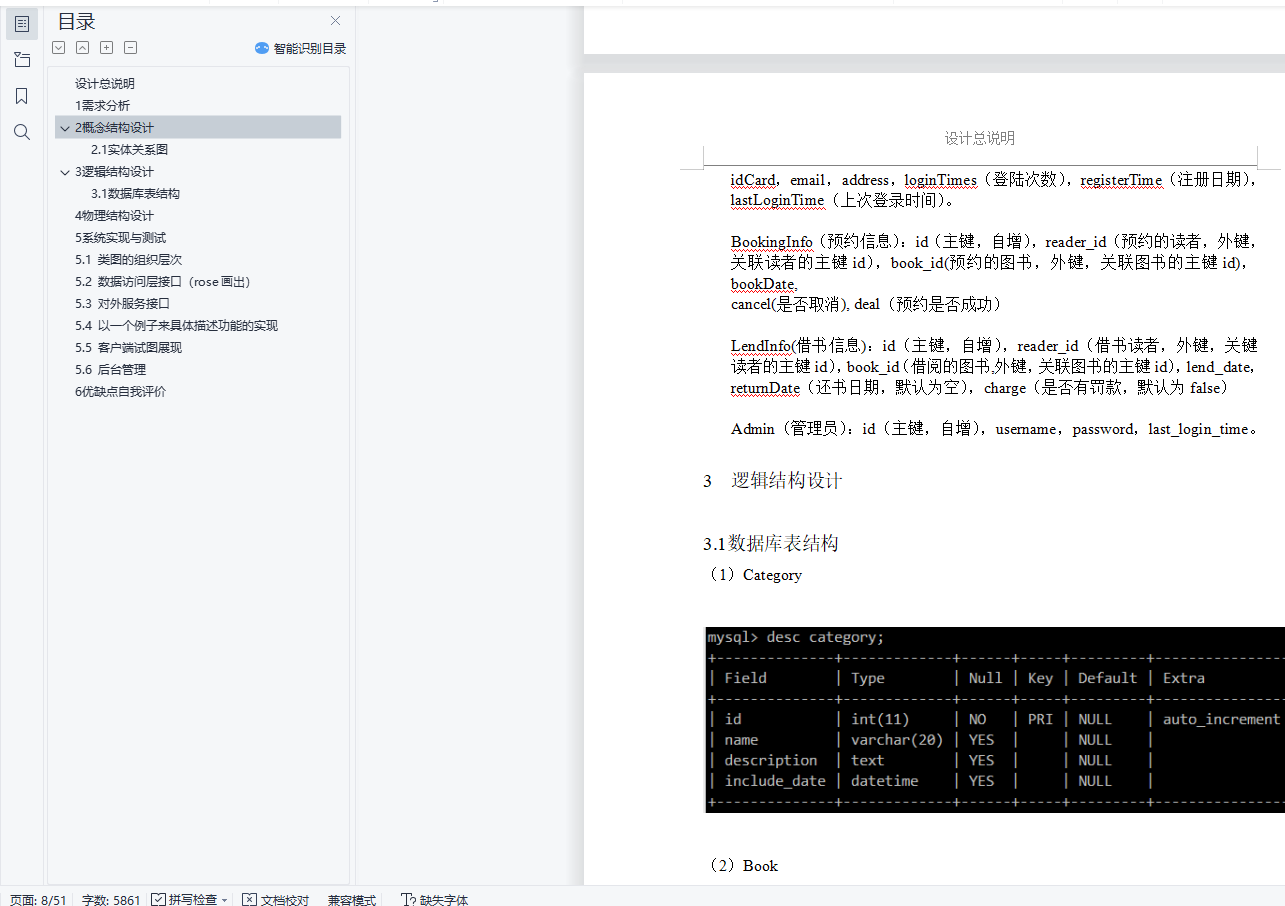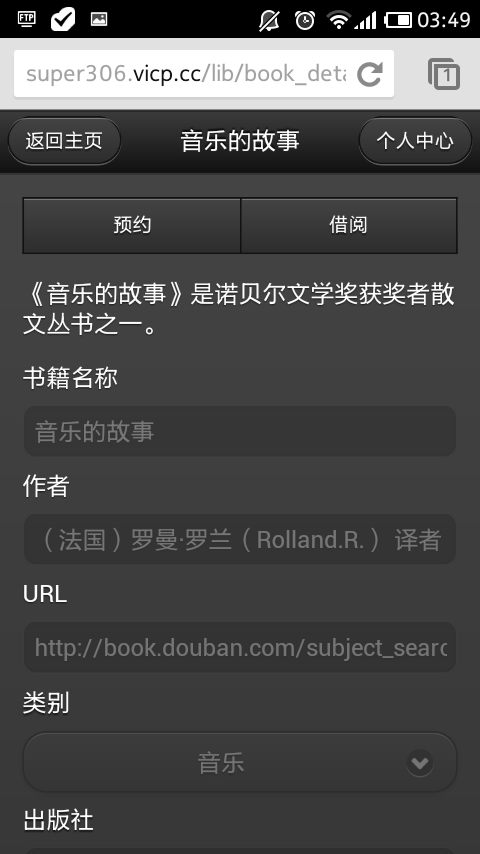 目 录设计总说明 I1 需求分析 32 概念结构设计 52.1 实体关系图 53 逻辑结构设计 83.1 数据库表结构 84 物理结构设计 115 系统实现与测试 145.1 类图的组织层次 155.2 数据访问层接口(rose画出) 175.3 对外服务接口 255.4 以一个例子来具体描述功能的实现 305.5 客户端试图展现 335.6 后台管理 456 优缺点自我评价 487 参考(都来自互联网的文档) 49设计总说明一、系统开发目的几年前的web2.0时代给我们带来的冲击还在扩大。紧接着的iPhone,Android平板电脑的日益流行,使得我们可以用一种很轻松的手势,触摸,语言等方式与互联网交互。根据调查显示,移动设备的占有率会在几年后超过传统pc,Windows在2012年9月推出的最新Windows8系统也第一次把触控功能带到了Windows系统,这不可谓是一种趋势:互联网已经逐渐靠着移动终端发展。此外,HTML5的日益规范化,其在各种平台上都得到了较好的支持。这些现象,构成了本次系统的开发目的:打造一个移动客户端。二、设计内容设计一个模仿大学图书馆的移动客户端与一个使用MySQL数据库的服务端。三、设计要求要求本客户端实现的基本功能如下:1:读者的登陆,注册。2:读者的查询图书。3:读者的预约图书。4:读者的借阅图书。5:读者的还书。6:读者的借阅图书超期的罚款。7:有合理的异常处理机制将出错友善的告诉读者出错在哪。8:管理员对图书,用户的基本管理。四、设计平台客户端使用HTML5,JavaScript,css3加上jQuery Mobile搭建,除了可以在web浏览器上访问外,也可以转换为Android,ios,Windows phone等平台上的原生app应用。服务端使用Java平台开发,使用MySQL作为底层数据库。除此之外,还应用了多种技术开发,所有的技术都是目前工业界成熟的,流行的,稳定的。开发环境为Windows8,jdk1.7_10,MySQL_5.5.29,eclipse_3.7