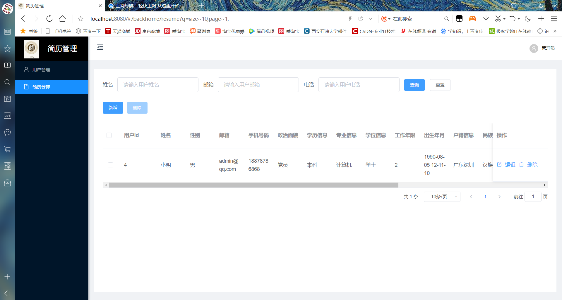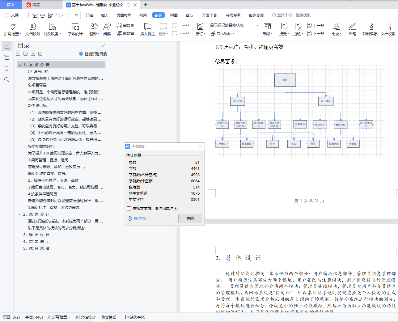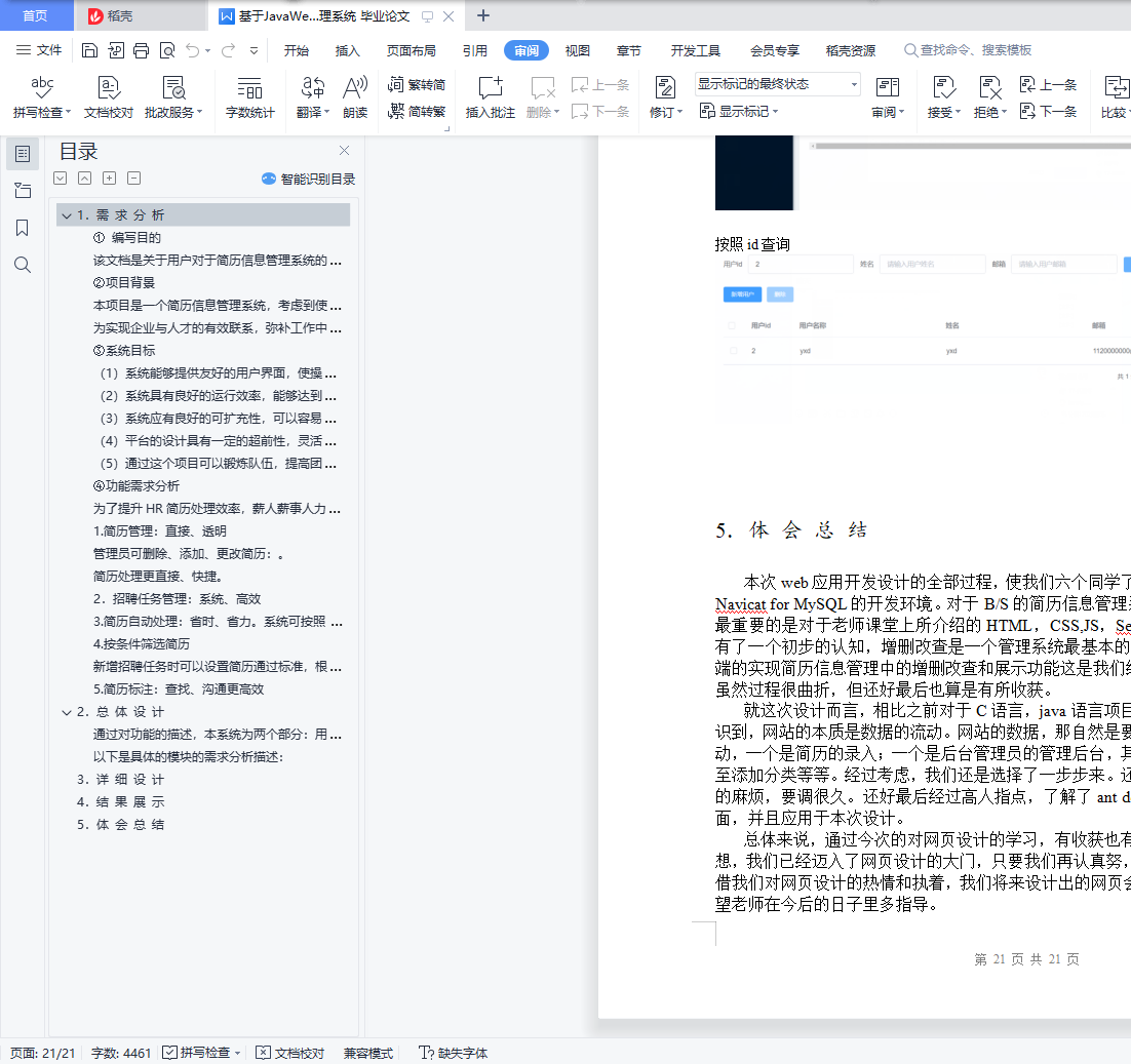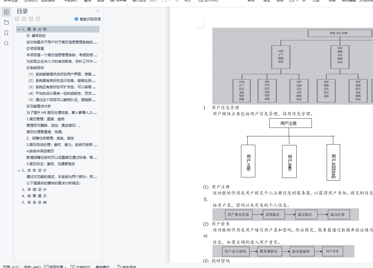 目 录1. 需 求 分 析 3① 编写目的 3②项目背景 3③系统目标 3(1)系统能够提供友好的用户界面,使操作人员的工作量最大限度的减少; 3(2)系统具有良好的运行效率,能够达到提高生产率的目的; 3(3)系统应有良好的可扩充性,可以容易地加入其他系统的应用; 3(4)平台的设计具有一定的超前性,灵活性,能够适应企业生产配置的变化; 3(5)通过这个项目可以锻炼队伍,提高团队的开发能力和项目管理能力。 3④功能需求分析 31.简历管理:直接、透明 42.招聘任务管理:系统、高效 43.简历自动处理:省时、省力。系统可按照HR自行设定的条件,自动处理简历,节省更多时间,效率翻倍。 44.按条件筛选简历 45.简历标注:查找、沟通更高效 42. 总 体 设 计 53. 详 细 设 计 94. 结 果 展 示 195. 体 会 总 结 221.需 求 分 析① 编写目的该文档是关于用户对于简历信息管理系统的功能和性能的要求,重点描述了网上招聘系统的功能需求,是概要设计阶段的重要输入。②项目背景本项目是一个简历信息管理系统,考虑到使用该系统的公司可能规模比较大,需要管理的简历信息也很多,每次收集信息总能收到成千上万的简历,如何挑选合适的简历信息常常是公司比较棘手的事情,为人力资源部的工作人员带来很多的工作量。为此公司希望有一个自动化的简历信息管理系统能够给他们带来工作的便利,提高工作效率,同时能及时有效管理简历信息。为实现企业与人才的有效联系,弥补工作中存在的种种不足,我们开发了简历信息管理系统。公司人力资源部的工作人员通过这个招聘系统维护知识题库,编制问卷,发布职位和与这个职位相应的问卷;被收集简历表的人可以通过网上提交自己的简历并同时回答相应的问卷。人力资源部的工作人员通过这个简历信息管理系统可以统计整理这些简历,并根据应聘者的简历和问卷分数提取出需要面试的人员,然后按照一定的方式通知面试人员参加面试,在面试过程中,记录相应的面试结果。人力资源部的工作可以随时浏览人员简历和面试的相关信息。
