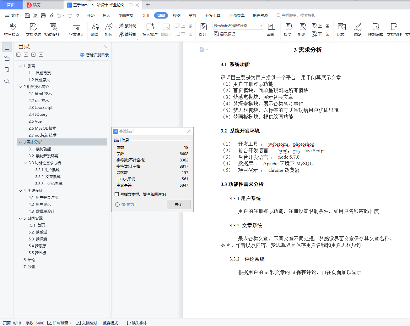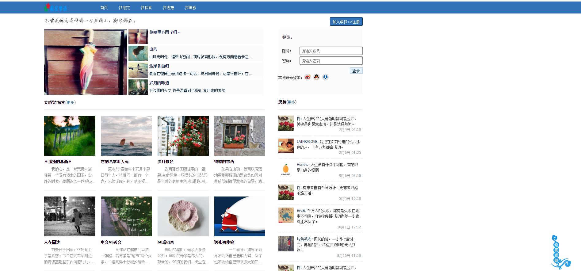 摘要中国文化源远流长,自古就有文人雅士作诗赋词,舞文弄墨,尽显风雅。现今则有歌手作家思想成文,心绪为曲,亦现儒雅。文化是传承的,是流传不息的,也是众多人所追求的。从各种各样的文化中,我们提升自己,丰富自己。而我现在所要做的就是给这类用户提供一个关于文化的平台,通过这个平台,用户可以查看各类诗词散文,各类优秀用户的奇思妙想,同时也可探索一些世界奥秘,从而提升自己的文学素养,文化底蕴以及文化知识。现在的社会趋向于数字化,信息化,越来越多的人通过互联网来获取信息,丰富自己。而这个平台也就迎合了社会的发展,符合了现在人的日常习惯。就技术方面说,现在社会发展迅速,农村人也几乎家家户户通上了网线,纷纷加入互联网大军。提到互联网,几乎每个人先接触到的事物应该是浏览器,而浏览器就是个网站显示的平台,有了它,用户才能访问不同的,各式各样的网站。自从h5现世,网站的发展更是一发不可收拾。页面元素从此不再是单一的文字,慢慢的也有了炫酷的动画效果和美好的色感,这也促使了更多的用户来访问网站。由于浏览器的良好兼容性,更是促进了它的发展。因此,我也选择了做网站来做我的毕业项目,目的是使更多人接触到我的网站,然后通过我这个平台提高文化素养。关键字:文化;思想;网站;浏览器AbstractChinese culture has a long history, Since ancient times, Literati make rhyme, show off literary skill, full of elegance. Today there are singer and writer make idea to article and Elegant, full of elegant. Culture is inherited and endless, Is also the pursuit of many people. From a variety of cultures, We raise and rich ourselves. All I have to do now is to provide a platform for this kind of culture, Through this platform, users can view all kinds of prose poetry, all kinds of excellent user ideas, explore the mysteries of the world. So as to enhance their literary quality, cultural heritage and cultural knowledge. The present society tends to be digitized and Informatization, More and more people have access to information through the Internet to raise themselves. And this platform will cater to the development of society, in line with the people's daily habits.Technical aspects said, Now the rapid development of society, almost every household in rural areas on the net, join the internet army. Mention Internet, almost everyone should first be exposed to the browser, the browser is a web site display platform, users can access different, various websites by this. Since the H5, the development of the website is more rapid.Page element is no longer a single text, slowly also has a cool and bright color animation, this also prompted more users to visit the site. Due to the good compatibility of the browser, but also to promote its development..So, I also chose to do the site to do my graduation project, the goal is to get more people into my website, and through this platform to improve cultural literacy.Key words: Culture, Idea, Website, Browser1 引言 41.1 课题背景 41.2课题意义 42相关技术简介 62.1 html技术 62.2 css技术 62.3 JavaScript 62.4 JQuery 62.5 Vue 72.6 MySQL技术 72.7 node.js技术 73需求分析 83.1 系统功能 83.2 系统开发环境 83.3功能性需求分析 83.3.1用户系统 83.3.2 文章系统 83.3.3 评论系统 84 系统设计 94.1 用户登录注册 94.2 用户评论 104.3 数据库设计 115 系统实现 145.1 首页 145.2 梦感觉 155.3 梦探索 165.4梦思想 175.5梦画板 176 结论 187 致谢 19
