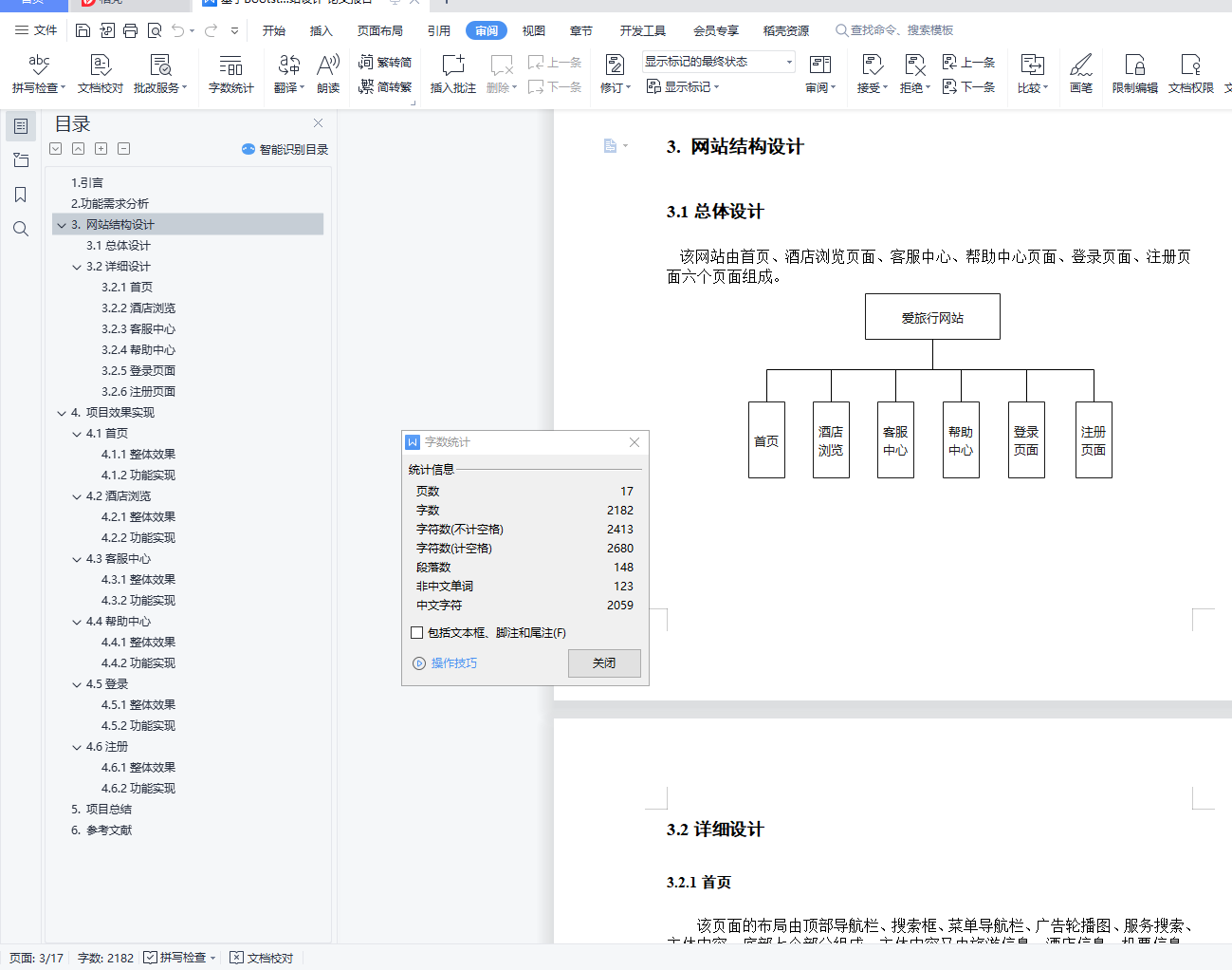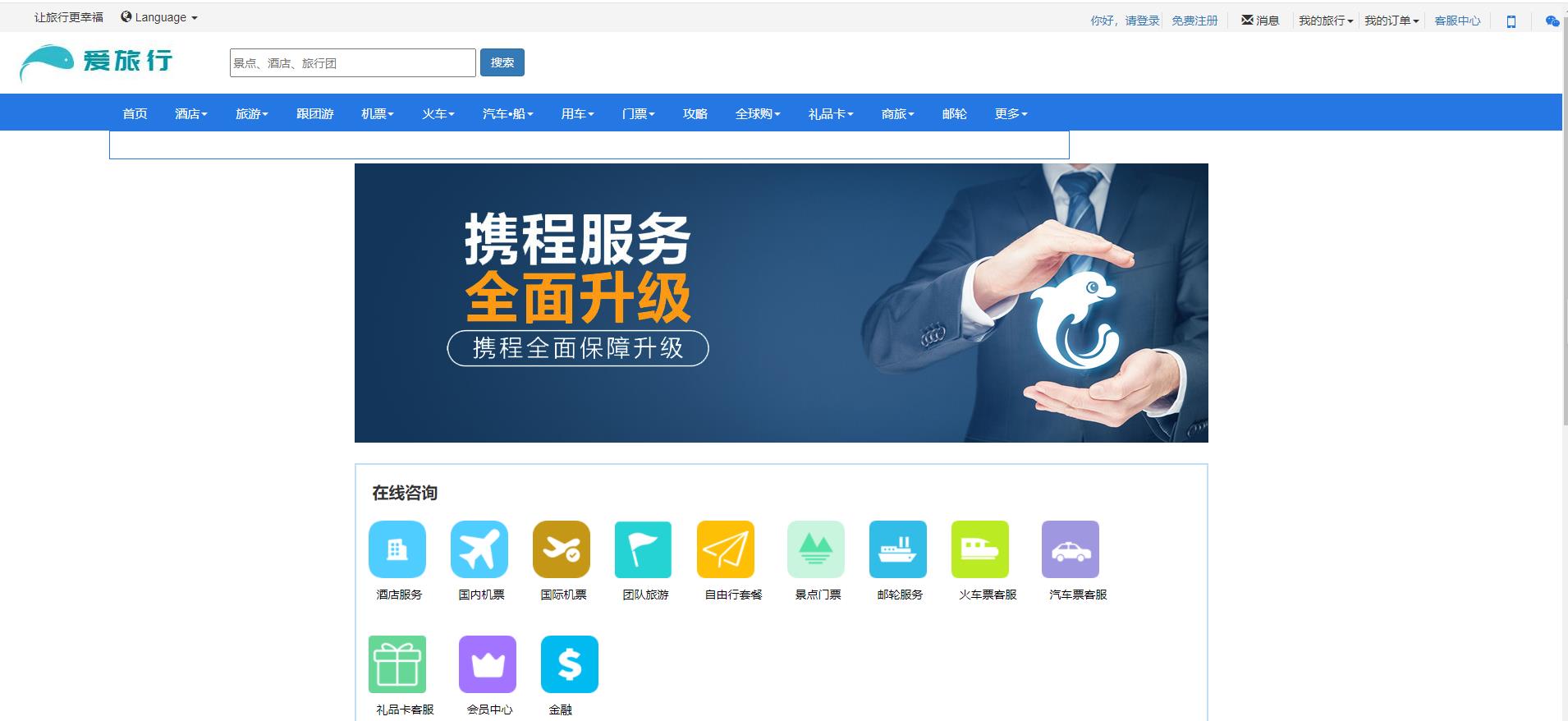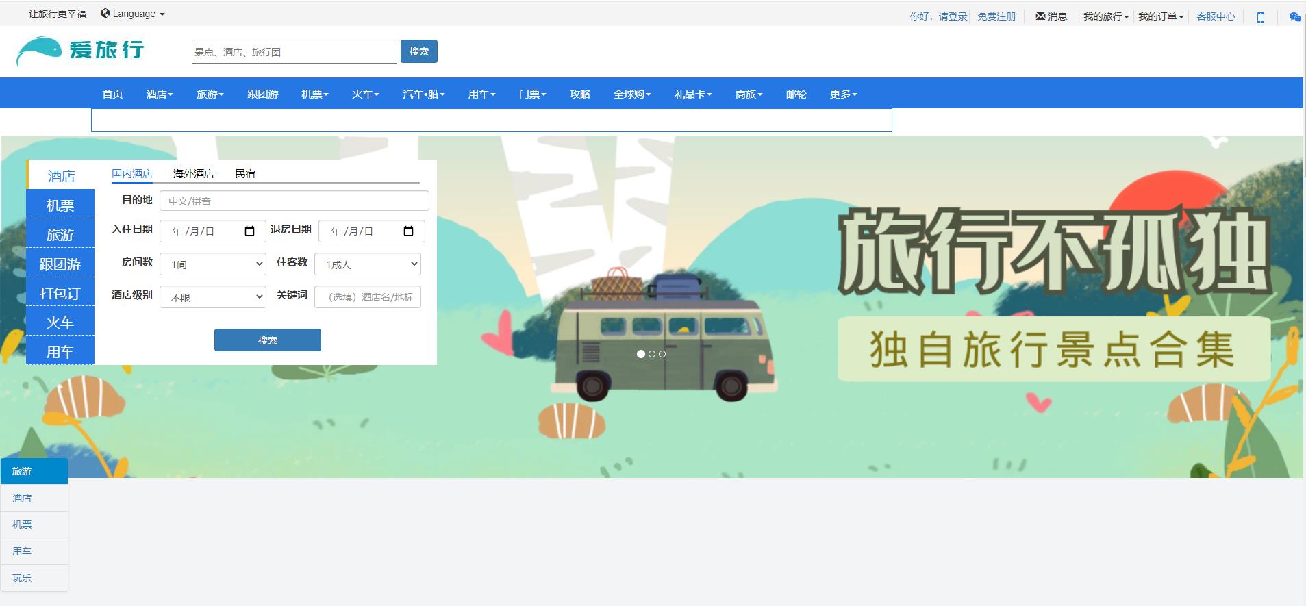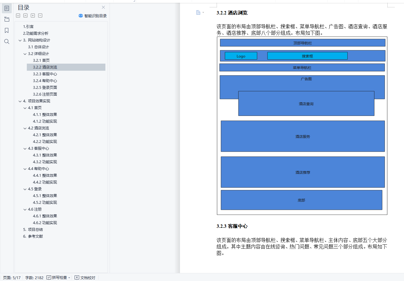 《H5应用与开发》项目设计题目: 爱旅行网站学 号:姓 名:专业班级:学 院: 大数据与计算机学院指导教师:分 数:2021年 11 月目录1.引言 22.功能需求分析 23. 网站结构设计 23.1总体设计 23.2详细设计 23.2.1首页 23.2.2酒店浏览 23.2.3客服中心 23.2.4帮助中心 23.2.5登录页面 23.2.6注册页面 24. 项目效果实现 34.1首页 34.1.1整体效果 34.1.2功能实现 34.2酒店浏览 34.2.1整体效果 34.2.2功能实现 34.3客服中心 34.3.1整体效果 34.3.2功能实现 34.4帮助中心 34.4.1整体效果 34.4.2功能实现 34.5登录 44.5.1整体效果 44.5.2功能实现 44.6注册 44.6.1整体效果 44.6.2功能实现 45. 项目总结 46. 参考文献 41.引言由于时下大多数人生活优越,交通工具方便快捷,信息获取方便,导致旅游业迅猛发展。为了方便旅游爱好者在网上获取信息,有效地掌握各大旅游景点的详细情况,我们开发出一套适合于旅游者在网络上快速获取信息的管理系统。通过本系统,出行者可以查看某个地区的全部景点列表,了解某个景点的详细情况,自驾车、公交线路,获取景区内的旅游地图等。该系统为游客提供全面的旅游服务.2.功能需求分析通过本系统,出行者可以查看某个地区的全部景点列表,了解某个景点的详细情况,自驾车、公交线路,获取景区内的旅游地图等。该系统为游客提供全面的旅游景点查询服务。本系统的功能主要包括:旅游查询、酒店查询、交通查询、景点查询、、用户管理。所用技术:Bootstarp、Html、Css