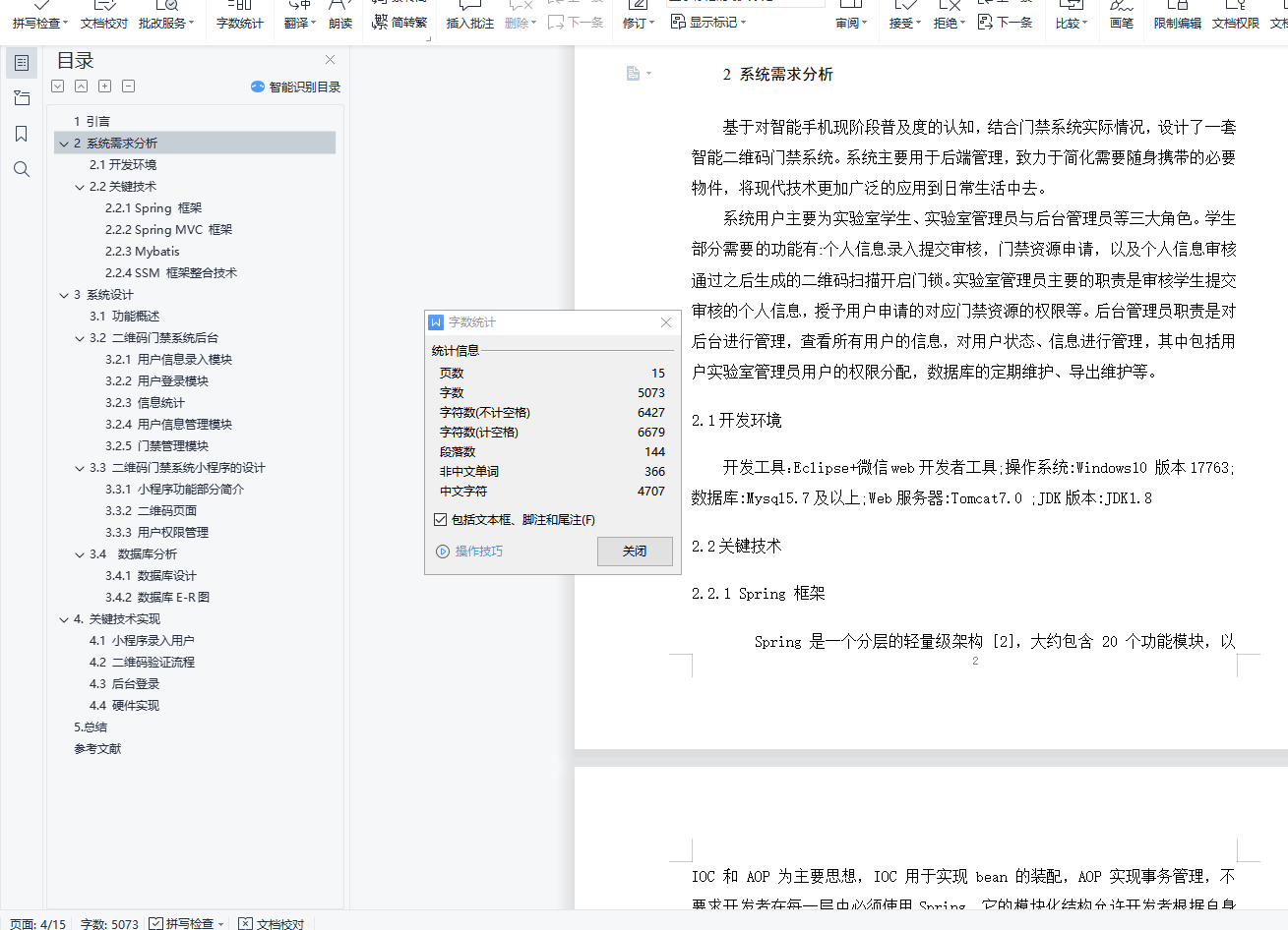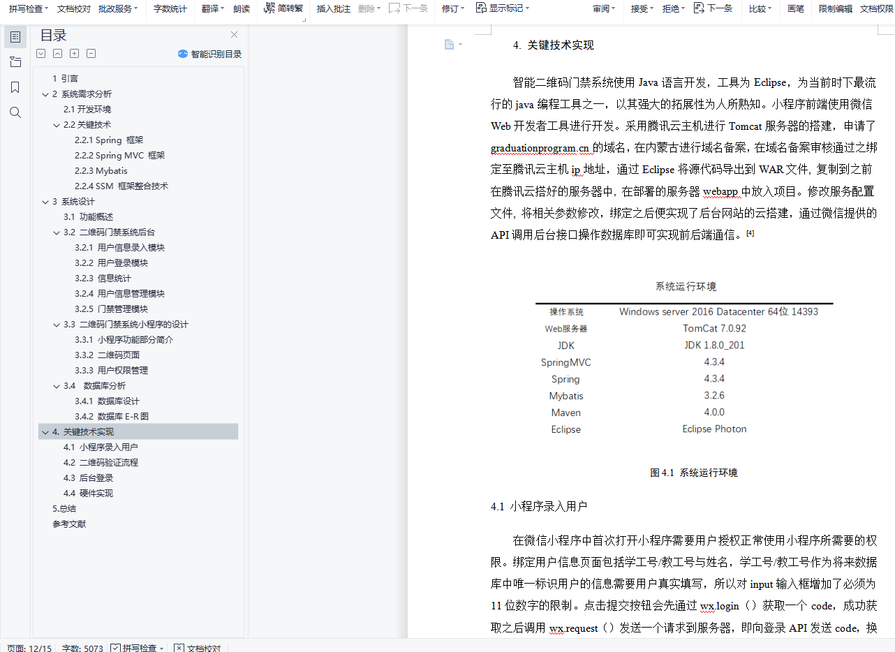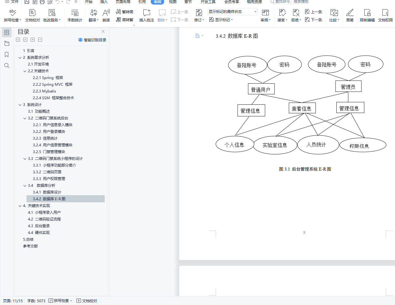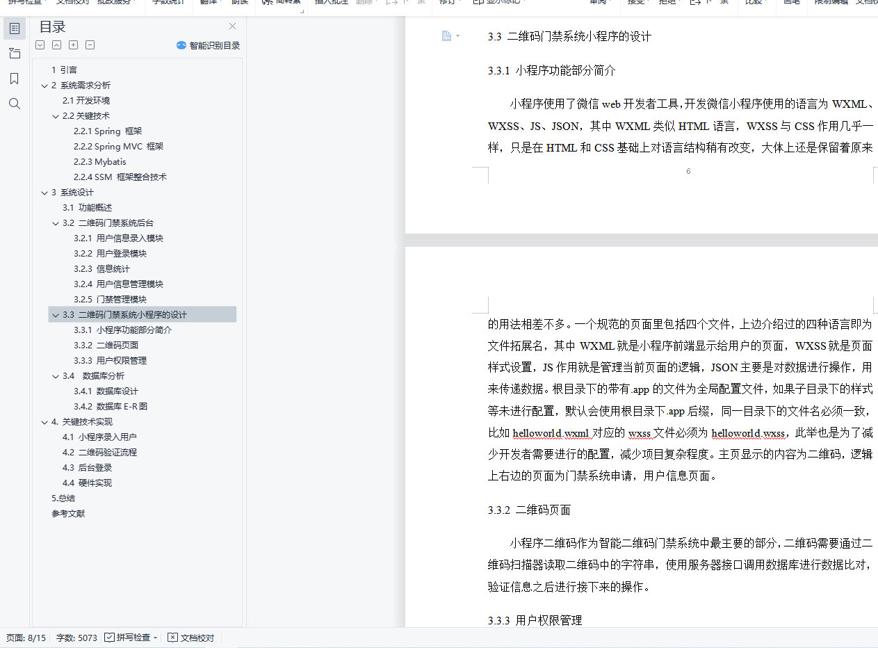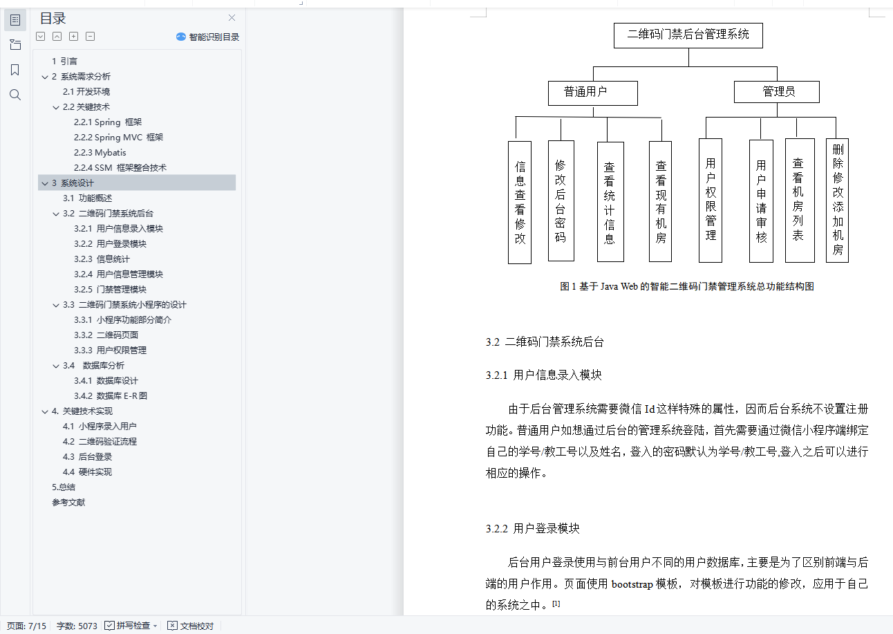 目录1 引言 22 系统需求分析 22.1开发环境 22.2关键技术 22.2.1 Spring 框架 22.2.2 Spring MVC 框架 32.2.3 Mybatis 32.2.4 SSM 框架整合技术 33 系统设计 43.1 功能概述 43.2 二维码门禁系统后台 53.2.1 用户信息录入模块 53.2.2 用户登录模块 53.2.3 信息统计 63.2.4 用户信息管理模块 63.2.5 门禁管理模块 63.3 二维码门禁系统小程序的设计 63.3.1 小程序功能部分简介 63.3.2 二维码页面 73.3.3 用户权限管理 83.4 数据库分析 83.4.1 数据库设计 83.4.2 数据库E-R图 114. 关键技术实现 114.1 小程序录入用户 124.2 二维码验证流程 124.3 后台登录 124.4 硬件实现 135.总结 13参考文献 1摘要 我们身边的很多事物都已悄然接入互联网,由此本文提出基于Java Web和微信小程序的一套门禁系统的设计。设计是由SSM(Spring-springMVC-Mybatis)框架构建成的n层架构二维码门禁管理系统,使用Mysql作为数据库,Eclipse平台进行后端开发,微信Web开发者工具对小程序页面进行开发。关键词 微信小程序;门禁系统;SSM框架;二维码Abstract With the advancement of computer science and technology.The things around us have also quietly connected to the Internet.This paper proposes the design of a set of access control system based on Java Web and WeChat Miniprogram. The design is an n-layer architecture two-dimensional code access control management system constructed by SSM (Spring-springMVC-Mybatis) framework. Use Mysql as the database and Eclipse platform for background development.KeyWords SSM Framework;MiniProgram;Two-dimension code; Intelligent Access Control System;