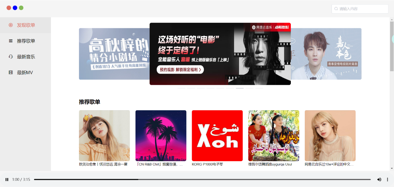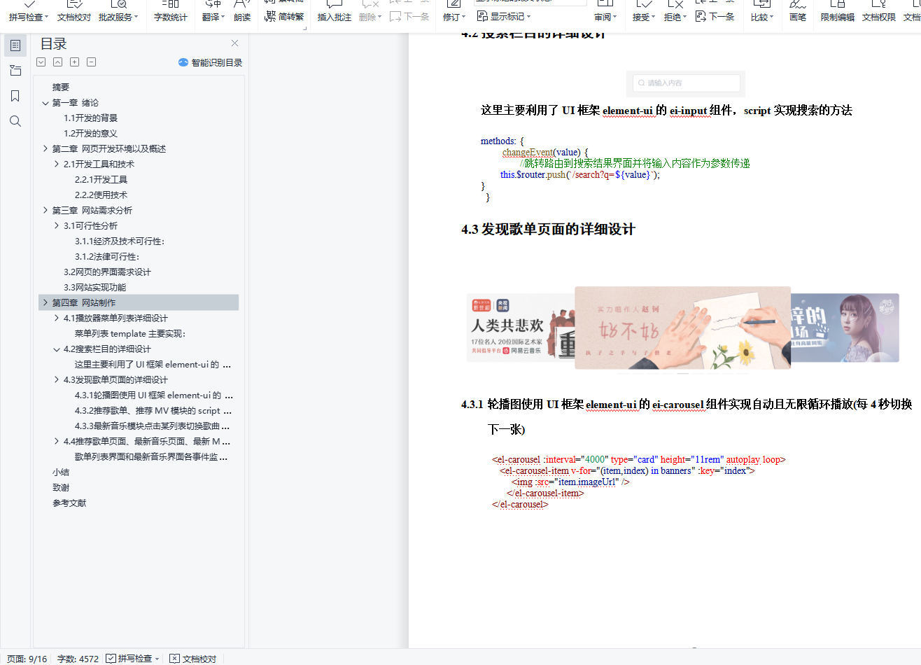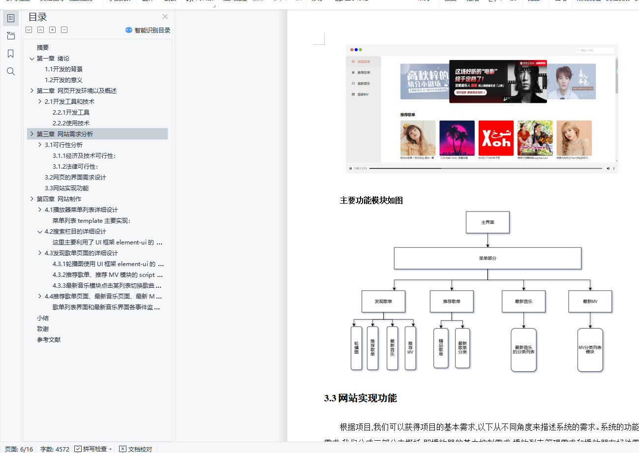 摘要在互联网高速发展的今天,网络已成为人们生活的一部分,多媒体技术也越来越受到人们的重视。本次设计对目前使用较多的音乐播放器作出较详细的比较,分析了一些音乐播放器的功能,怎样能满足使用者对播放器的需求。音乐是一种声音符号,表达人的思想感情。是人们思想的载体之一。音乐是有目的和内涵的,其中隐含了作者的生活体验,思想情怀。一款好的pc音乐播放器不仅,能够提供好的音乐播放效果,更能够为用户提供方便的操作。本文主要介绍一个基于vue+vue-cli+vue利用技术html+css+js、和visual studio Code编辑工具对网页版音乐播放器(PC)进行编写和设计。并对开发中涉及到的关键技术作了探讨,同时给出了详细的系统设计过程、部分界面图及主要功能运行流程图,最后说明实现的功能。本文还对开发过程中遇到的问题和解决方法进行了详细的讨论,该音乐播放器集播放、暂停、停止、快进、快退、下一曲、上一曲、音量调节等功能与一体,性能良好。第一阶段首先对项目进行全面、仔细的需求分析,并准确做出项目进度安排,明确每个阶段的任务;第二阶段是进行项目分模块编码;第三阶段对项目进行全面的测试。关键词:网页制作;模块化;音乐播放器; vue框架;目录摘要 2第一章 绪论 41.1 开发的背景 41.2 开发的意义 4第二章 网页开发环境以及概述 42.1 开发工具和技术 4第三章 网站需求分析 53.1 可行性分析 53.2 网页的界面需求设计 63.3 网站实现功能 7第四章 网站制作 94.1 播放器菜单列表详细设计 94.2 搜索栏目的详细设计 104.3 发现歌单页面的详细设计 104.4 推荐歌单页面、最新音乐页面、最新MV页面代码详细设计 13小结 15致谢 16参考文献 17