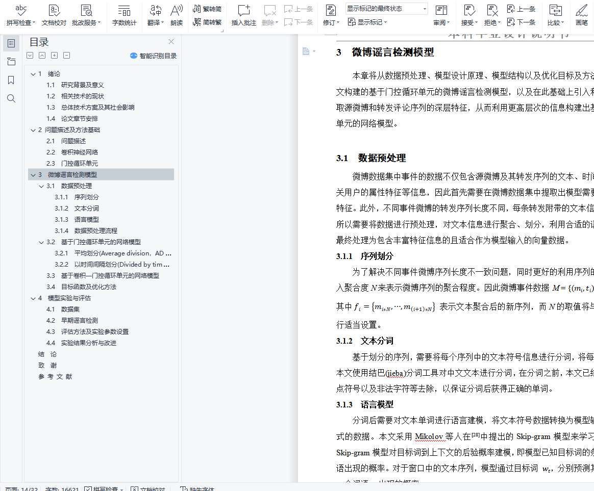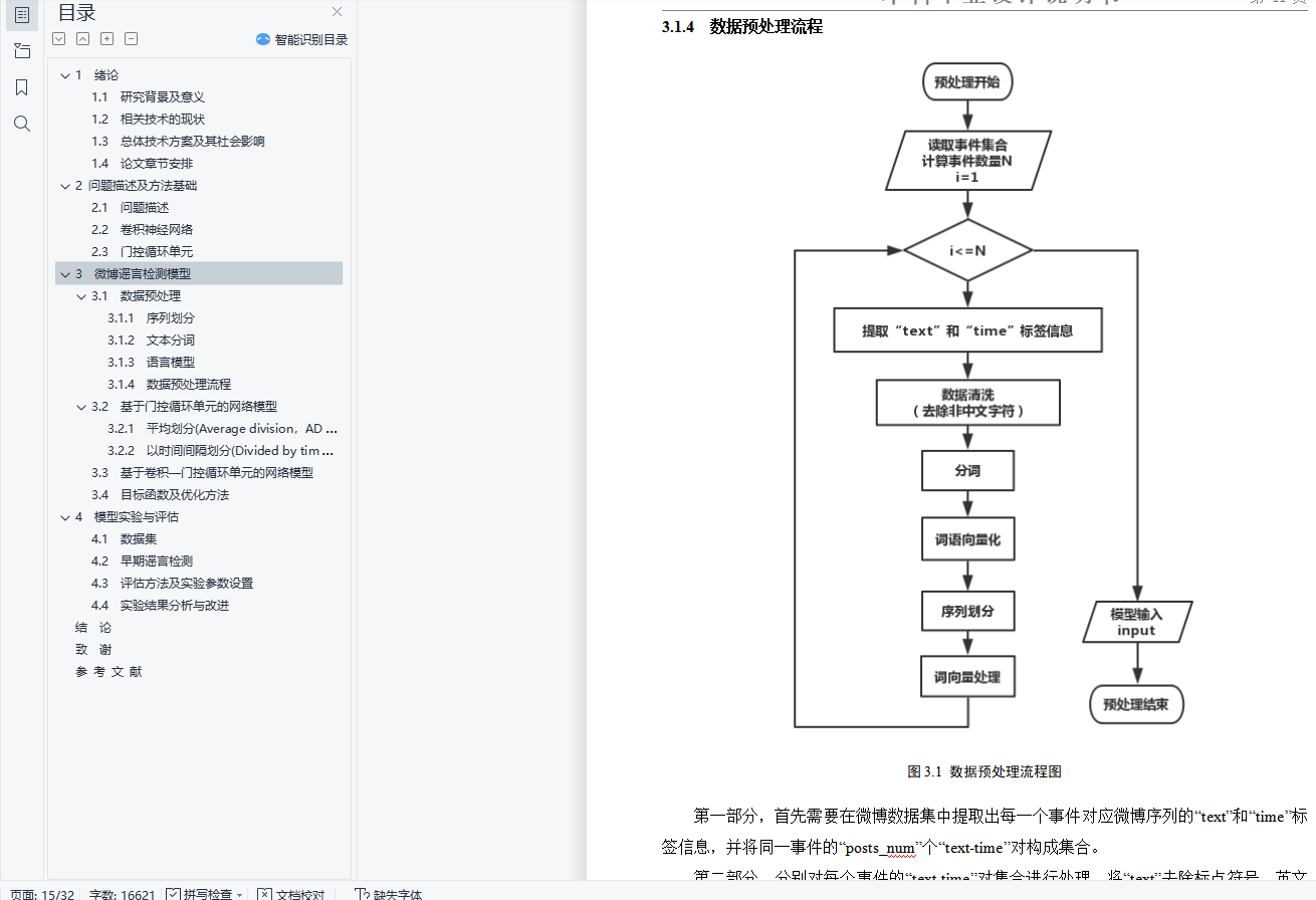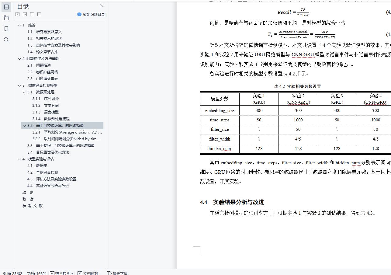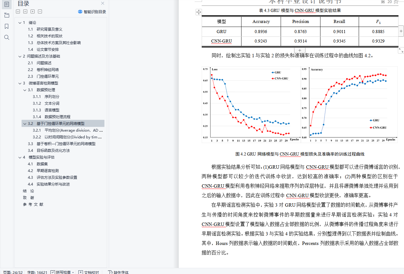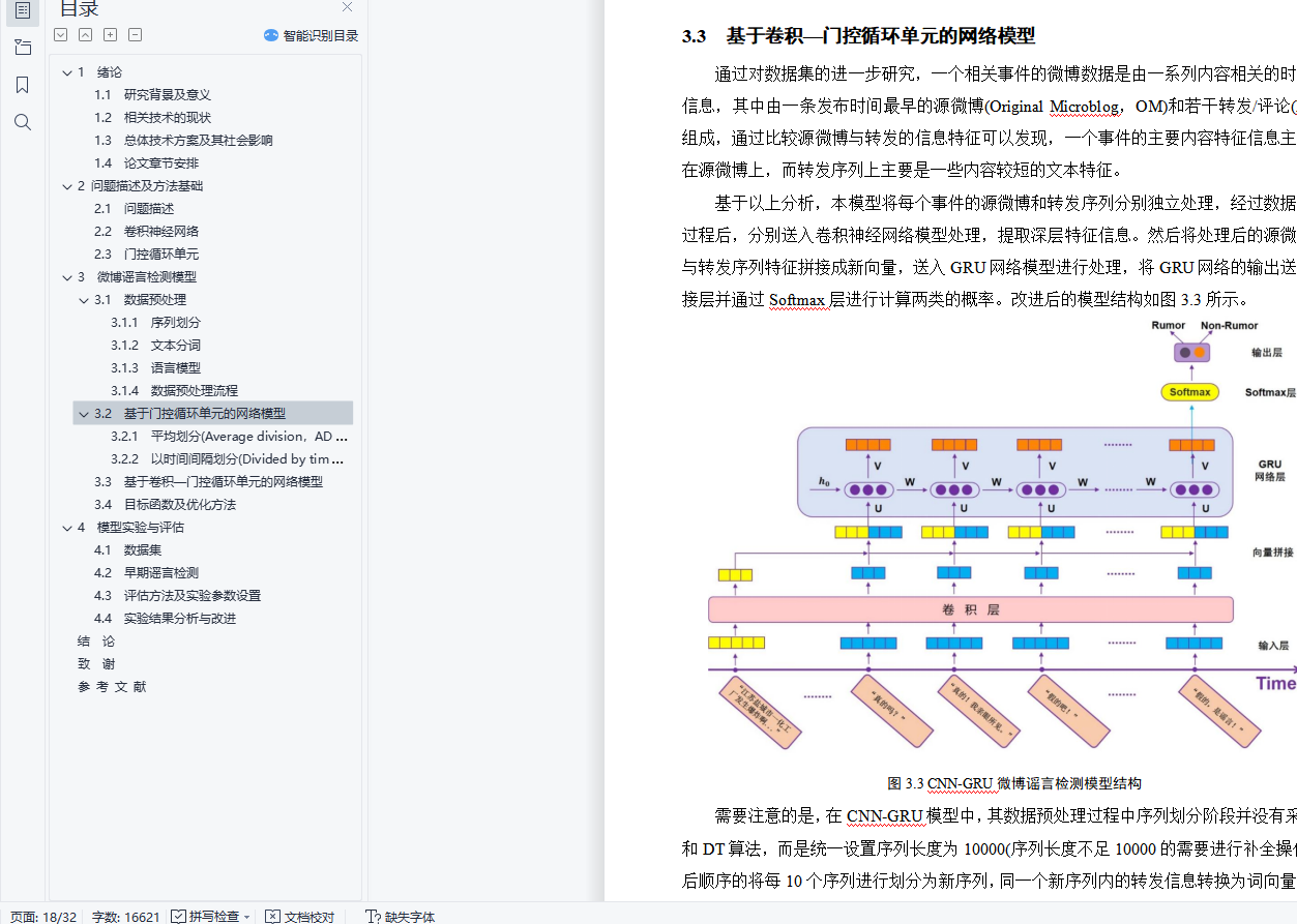 毕业设计说明书中文摘要随着微博平台的流行,微博平台上产生了大量难于验证的谣言信息,并在用户之间快速传播,对平台的发展和社会稳定带来巨大危害。如何自动检测并识别谣言对于制止谣言传播、减小谣言危害具有极其重要的意义。基于以上背景,开展了谣言检测的相关研究。本文对来源于新浪微博的谣言数据集的4664条标注数据进行研究,利用谣言数据中的文本信息以及时间信息进行建模,构建出门控循环单元网络(GRU)模型实现了基于序列模型的微博谣言检测算法,在测试集上达到了89.36%的准确率。在此基础上,利用卷积神经网络(CNN)来提取文本的深层特征,构建出CNN-GRU复合网络模型并获得了测试集上92.43%的准确率。基于上述实验结果,本文进一步对两种谣言检测模型进行早期谣言检测实验,取得了不错的效果。关键词 微博谣言 早期检测 机器学习 深度神经网络毕业设计说明书外文摘要AbstractWith the popularity of the Weibo platform, a large number of rumor messages that are difficult to verify are generated on the Weibo, and spread rapidly among users, which brings great harm to the development of the Weibo platform and social stability. How to automatically detect and identify rumors is of great significance for stopping the spread of rumors and reducing the harm of rumors. Based on the above background, relevant research on rumor detection was carried out.This paper studies the 4664 annotation data from the rumor dataset of Sina Weibo, and uses the text information and time information in the rumor data to model and construct a Gated Recurrent Unit(GRU) model to detect rumors. This rumor detection algorithm achieved 89.36% accuracy on the test set. On this basis, the Convolutional Neural Network(CNN) is used to extract the deep features of the text, and the CNN-GRU composite network model is constructed and the accuracy of 92.43% on the test set is obtained. Based on the above experimental results, this paper further conducts early rumor detection experiments on two rumor detection models, and has achieved great effects.Keywords Rumors Early Detection Machine Learning Deep Neural Network目 次1 绪论…………………………………………………………………………………….……..11.1 研究背景及意义……………………………………………………………….…....... 11.2 相关技术的现状…………………………………………………………………….... 21.3 总体技术方案及其社会影响………………………………………………………… 41.4 论文章节安排………………………………………………………………………… 42 问题描述及方法基础………………………………………………………………..……… 62.1 问题描述……………………………………………………………………………… 62.2 卷积神经网络........…………………………………………………………………… 62.3 门控循环单元………………………………………………………………………… 73 微博谣言检测模型…………………………………………………………………..…...… 103.1 数据预处理……………………………………………………………………………103.2 基于门控循环单元的网络模型…………………………………………………...… 123.3 基于卷积-门控循环单元的网络模型………..………………………………………143.4 目标函数及优化方法…………………………………………………………………154 模型实验与评估..…………………………………………………………………....………164.1 数据集…………………………………………………………………………………164.2 早期谣言检测…………………………………………………………………………184.3 评估方法及实验参数设置……………………………………………………………184.4 实验结果分析与改进………………………………………………….……………...19结论..…………………………………….………………………………………………...…..... 24致谢.………………………………………………………….……………………………….….25参考文献……………………………………………………………………………………....…26