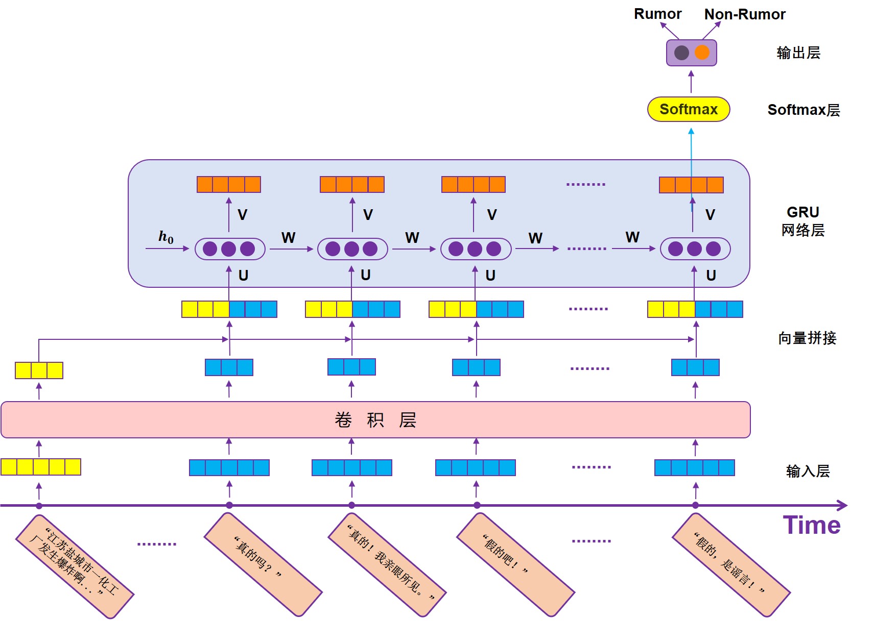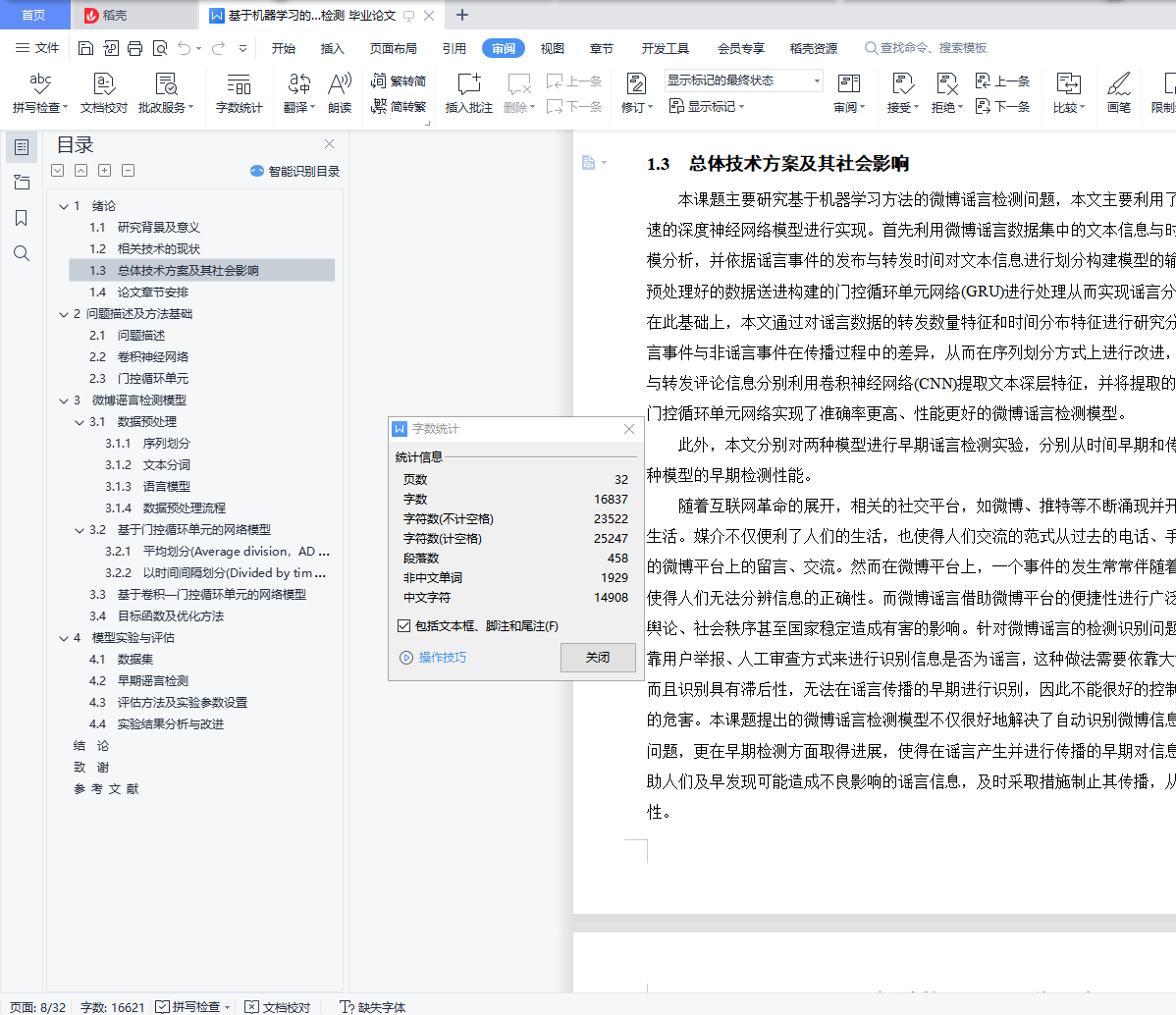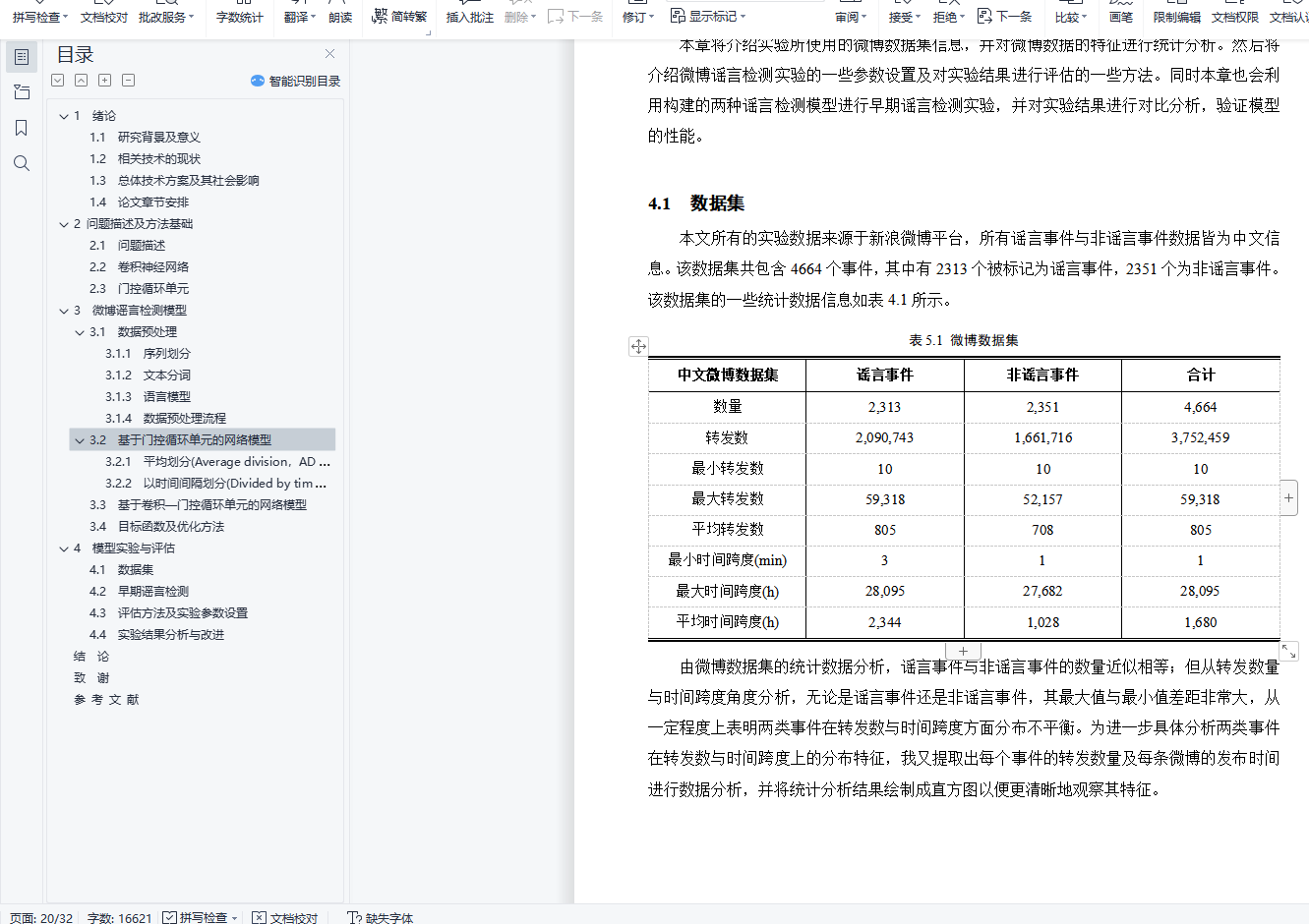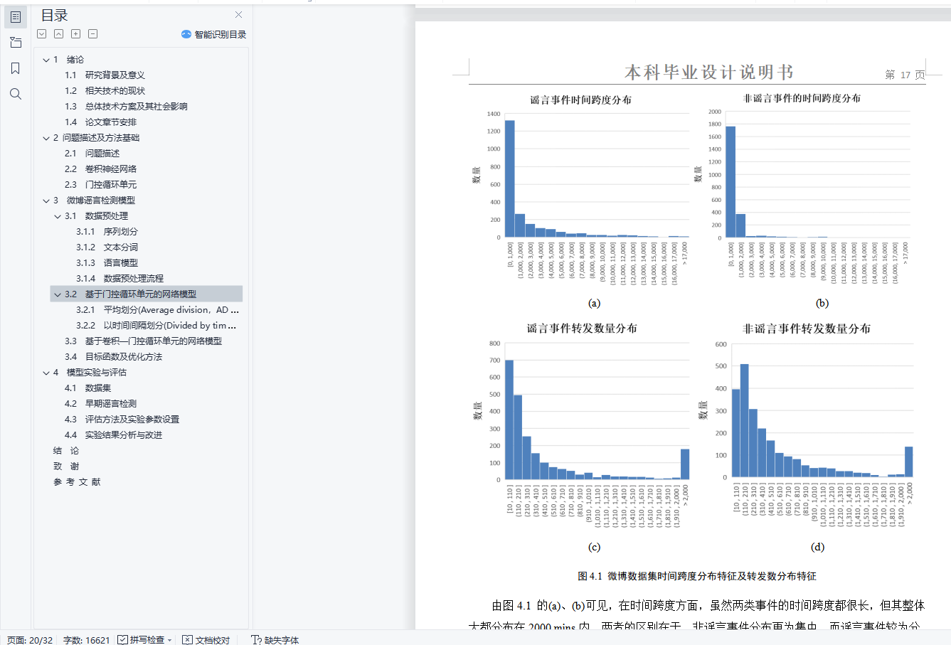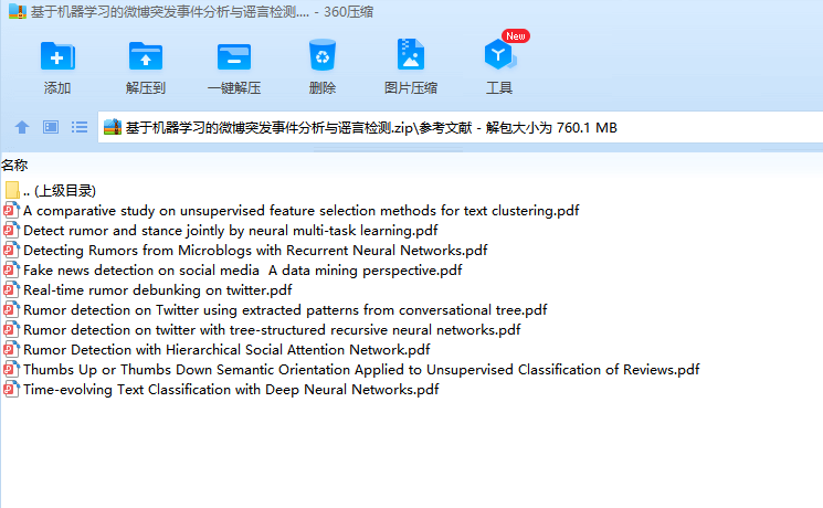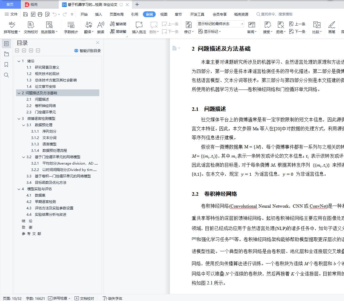 毕业设计说明书中文摘要随着微博平台的流行,微博平台上产生了大量难于验证的谣言信息,并在用户之间快速传播,对平台的发展和社会稳定带来巨大危害。如何自动检测并识别谣言对于制止谣言传播、减小谣言危害具有极其重要的意义。基于以上背景,开展了谣言检测的相关研究。本文对来源于新浪微博的谣言数据集的4664条标注数据进行研究,利用谣言数据中的文本信息以及时间信息进行建模,构建出门控循环单元网络(GRU)模型实现了基于序列模型的微博谣言检测算法,在测试集上达到了89.36%的准确率。在此基础上,利用卷积神经网络(CNN)来提取文本的深层特征,构建出CNN-GRU复合网络模型并获得了测试集上92.43%的准确率。基于上述实验结果,本文进一步对两种谣言检测模型进行早期谣言检测实验,取得了不错的效果。关键词 微博谣言 早期检测 机器学习 深度神经网络毕业设计说明书外文摘要AbstractWith the popularity of the Weibo platform, a large number of rumor messages that are difficult to verify are generated on the Weibo, and spread rapidly among users, which brings great harm to the development of the Weibo platform and social stability. How to automatically detect and identify rumors is of great significance for stopping the spread of rumors and reducing the harm of rumors. Based on the above background, relevant research on rumor detection was carried out.This paper studies the 4664 annotation data from the rumor dataset of Sina Weibo, and uses the text information and time information in the rumor data to model and construct a Gated Recurrent Unit(GRU) model to detect rumors. This rumor detection algorithm achieved 89.36% accuracy on the test set. On this basis, the Convolutional Neural Network(CNN) is used to extract the deep features of the text, and the CNN-GRU composite network model is constructed and the accuracy of 92.43% on the test set is obtained. Based on the above experimental results, this paper further conducts early rumor detection experiments on two rumor detection models, and has achieved great effects.Keywords Rumors Early Detection Machine Learning Deep Neural Network目 次1 绪论…………………………………………………………………………………….……..11.1 研究背景及意义……………………………………………………………….…....... 11.2 相关技术的现状…………………………………………………………………….... 21.3 总体技术方案及其社会影响………………………………………………………… 41.4 论文章节安排………………………………………………………………………… 42 问题描述及方法基础………………………………………………………………..……… 62.1 问题描述……………………………………………………………………………… 62.2 卷积神经网络........…………………………………………………………………… 62.3 门控循环单元………………………………………………………………………… 73 微博谣言检测模型…………………………………………………………………..…...… 103.1 数据预处理……………………………………………………………………………103.2 基于门控循环单元的网络模型…………………………………………………...… 123.3 基于卷积-门控循环单元的网络模型………..………………………………………143.4 目标函数及优化方法…………………………………………………………………154 模型实验与评估..…………………………………………………………………....………164.1 数据集…………………………………………………………………………………164.2 早期谣言检测…………………………………………………………………………184.3 评估方法及实验参数设置……………………………………………………………184.4 实验结果分析与改进………………………………………………….……………...19结论..…………………………………….………………………………………………...…..... 24致谢.………………………………………………………….……………………………….….25参考文献……………………………………………………………………………………....…26