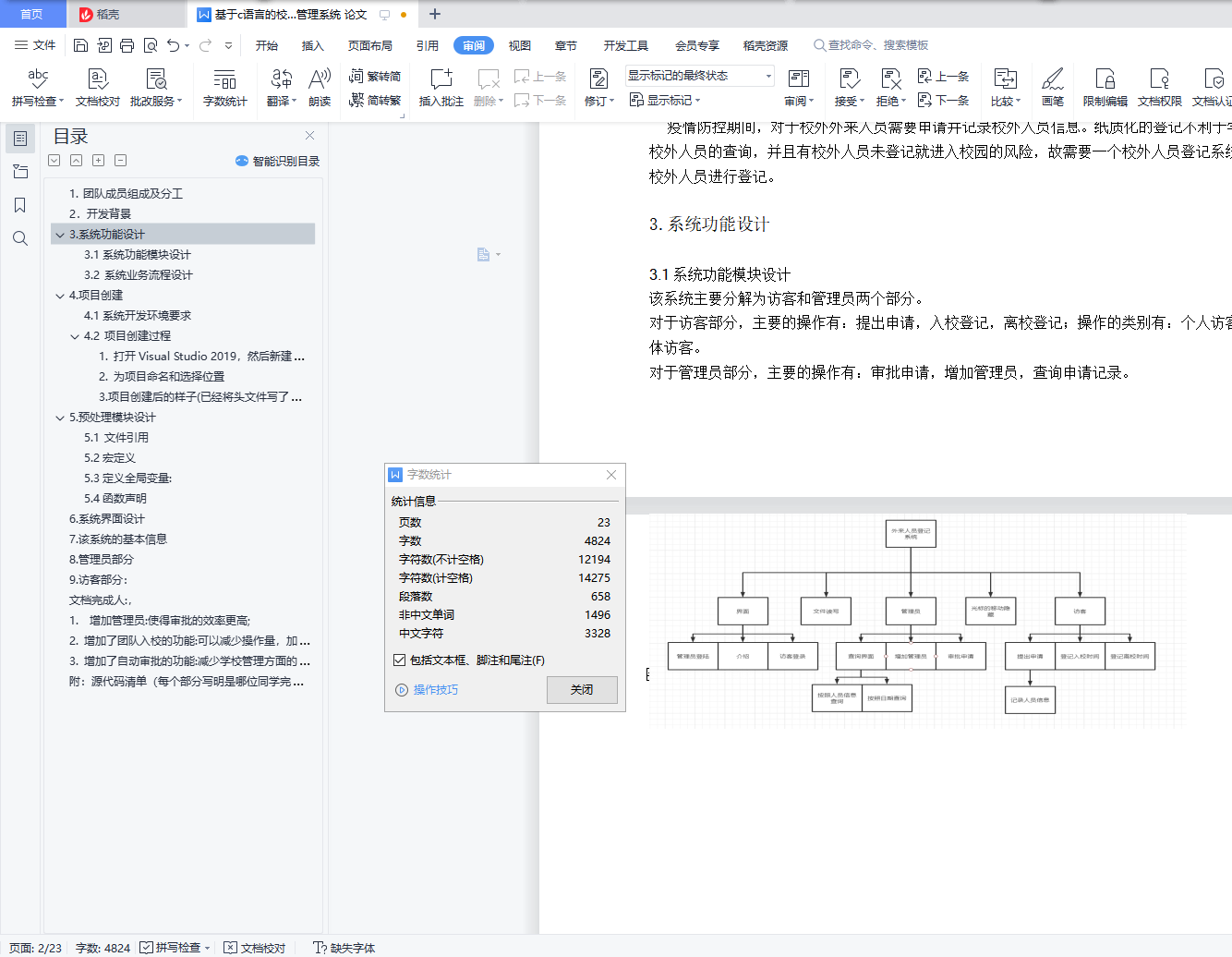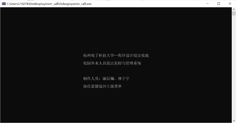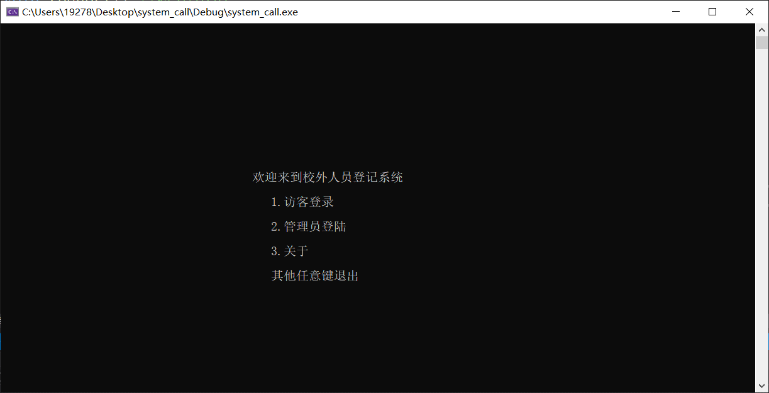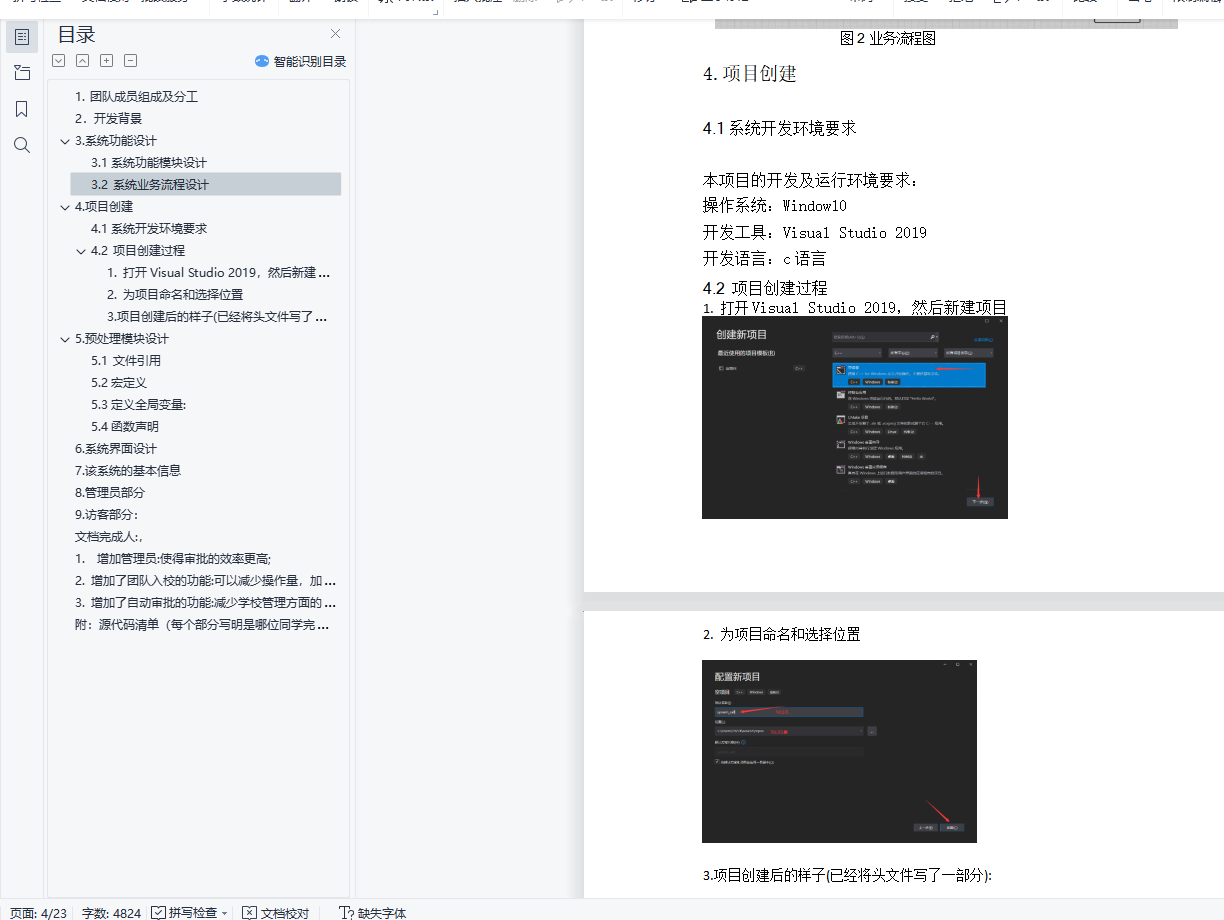 校园外来人员进出监控与管理系统目录1. 团队成员组成及分工 12.开发背景 23.系统功能设计 23.1 系统功能模块设计 23.2 系统业务流程设计 34.项目创建 34.1 系统开发环境要求 34.2 项目创建过程 31. 打开Visual Studio 2019,然后新建项目 32. 为项目命名和选择位置 43.项目创建后的样子(已经将头文件写了一部分): 45.预处理模块设计 45.1 文件引用 45.2 宏定义 45.3 定义全局变量: 45.4 函数声明 56.系统界面设计 67.该系统的基本信息 78.管理员部分 79.访客部分: 20文档完成人:, 211. 增加管理员:使得审批的效率更高; 212. 增加了团队入校的功能:可以减少操作量,加快团队入校效率; 213. 增加了自动审批的功能:减少学校管理方面的工作量; 21附:源代码清单(每个部分写明是哪位同学完成) 22