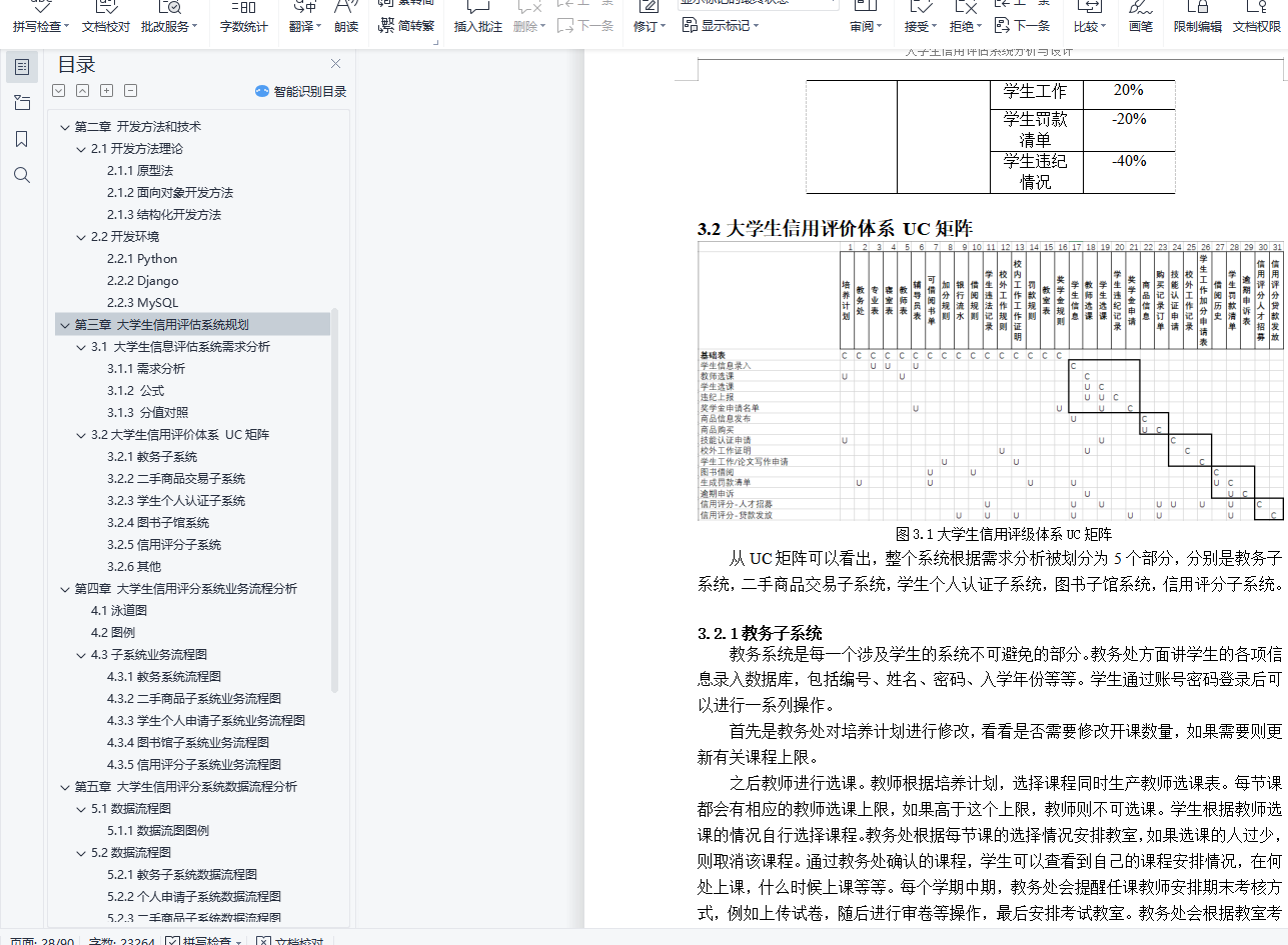 摘 要在国内,有很大一部分人,如果不涉及贷款买房买车,很多时候不会认识到信用的重要性。大学生,作为即将步入社会的一大社会群体,往往对征信缺乏科学的认识。本文将整合一些易于得到的信息,借鉴Fico系统的思想,开发一套在大学校园内较为可行的征信系统,以供用人单位了解大学毕业生,便于大学生走向社会,接触真正的征信系统。本文主要介绍大学生信用评估信息系统的开发环境,需求分析和整体思路。本文采用结构化的系统法系统与设计方法,通过业务流程,数据流程,E-R图等等展现系统的基本数据及数据流动关系。关键词:大学生 征信 Fico 系统分析与设计ABSTRACTIn China, a large number of people rarely recognize the importance of credit, if they do not involve loans to buy a house to buy a car. College students, as a large social group that is about to enter the society, often lack scientific understanding of credit reporting. This article will integrate some easy-to-obtain information, draw on the ideas of the Fico system, and develop a more feasible credit information system on the university campus for the employer to understand the university graduates, to facilitate the college students to go to the society, and to contact the real credit information system.This paper mainly introduces the development environment, demand analysis and overall thinking of college students' credit evaluation information system. This paper uses a structured system of systems and design methods to present the basic data and data flow relationships of the system through business processes, data flows, E-R diagrams, and so on.Key words: College students, credit, Fico, MIS目 录摘 要 5ABSTRACT 7目 录 i第一章 绪论 11.1系统开发背景 11.2 芝麻信用 11.2.1芝麻信用分 11.2.2芝麻信用分的局限性 31.3 FICO系统 41.3.1 Fico评分系统 41.3.2 Fico评分的模型 41.4 中国当前征信行业的机遇与挑战 41.4.1互联网金融的机遇和挑战 41.4.2大数据对人才市场的优势 51.5研究的目的和意义 51.5.1研究目的 51.5.2研究意义 51.6研究难点 5第二章 开发方法和技术 72.1开发方法理论 72.1.1原型法 82.1.2面向对象开发方法 82.1.3结构化开发方法 82.2开发环境 92.2.1 Python 92.2.2 Django 92.2.3 MySQL 11第三章 大学生信用评估系统规划 133.1 大学生信息评估系统需求分析 133.1.1需求分析 133.1.2 公式 143.1.3 分值对照 143.2大学生信用评价体系 UC矩阵 193.2.1教务子系统 193.2.2二手商品交易子系统 203.2.3学生个人认证子系统 203.2.4图书子馆系统 203.2.5信用评分子系统 213.2.6其他 21第四章 大学生信用评分系统业务流程分析 234.1泳道图 234.2图例 234.3子系统业务流程图 234.3.1教务系统流程图 234.3.2二手商品子系统业务流程图 254.3.3学生个人申请子系统业务流程图 264.3.4图书馆子系统业务流程图 274.3.5信用评分子系统业务流程图 28第五章 大学生信用评分系统数据流程分析 305.1数据流程图 305.1.1数据流图图例 305.2数据流程图 305.2.1教务子系统数据流程图 305.2.2个人申请子系统数据流程图 315.2.3二手商品子系统数据流程图 325.2.4图书馆子系统数据流程图 335.2.5信用评分子系统数据流程图 355.3第二层数据流程图 35第六章 大学生信用评估系统ER图 376.1 ER图 376.1.1教务系统 376.1.2二手商品交易 376.1.3个人申请子系统 386.1.4 图书馆子系统 396.1.5 信用评分子系统 39第七章 大学生信用评估系统实践 407.1基础界面 407.2教务子系统实操界面 437.3图书馆子系统界面实操 467.4 二手商品交易子系统 497.5个人申请子系统实操 527.6信用评级子系统实操 55第八章 总结与展望 61参考文献 63致谢 65附录 67