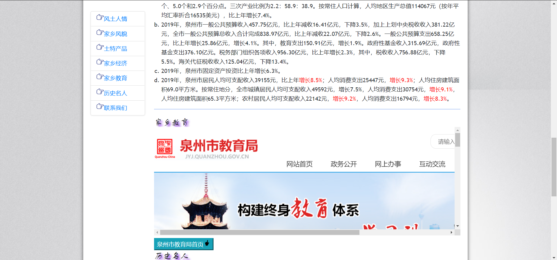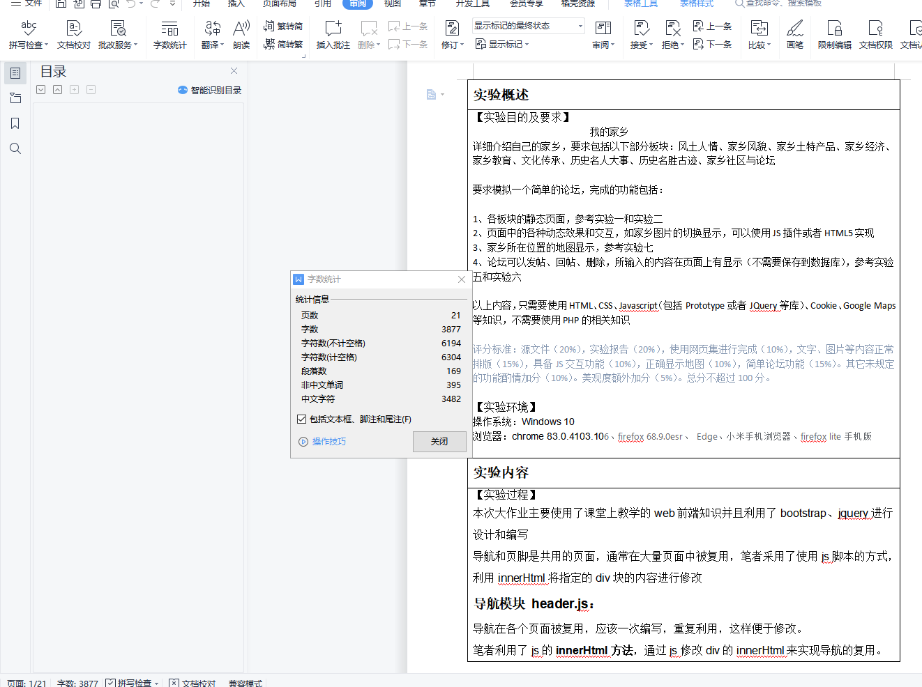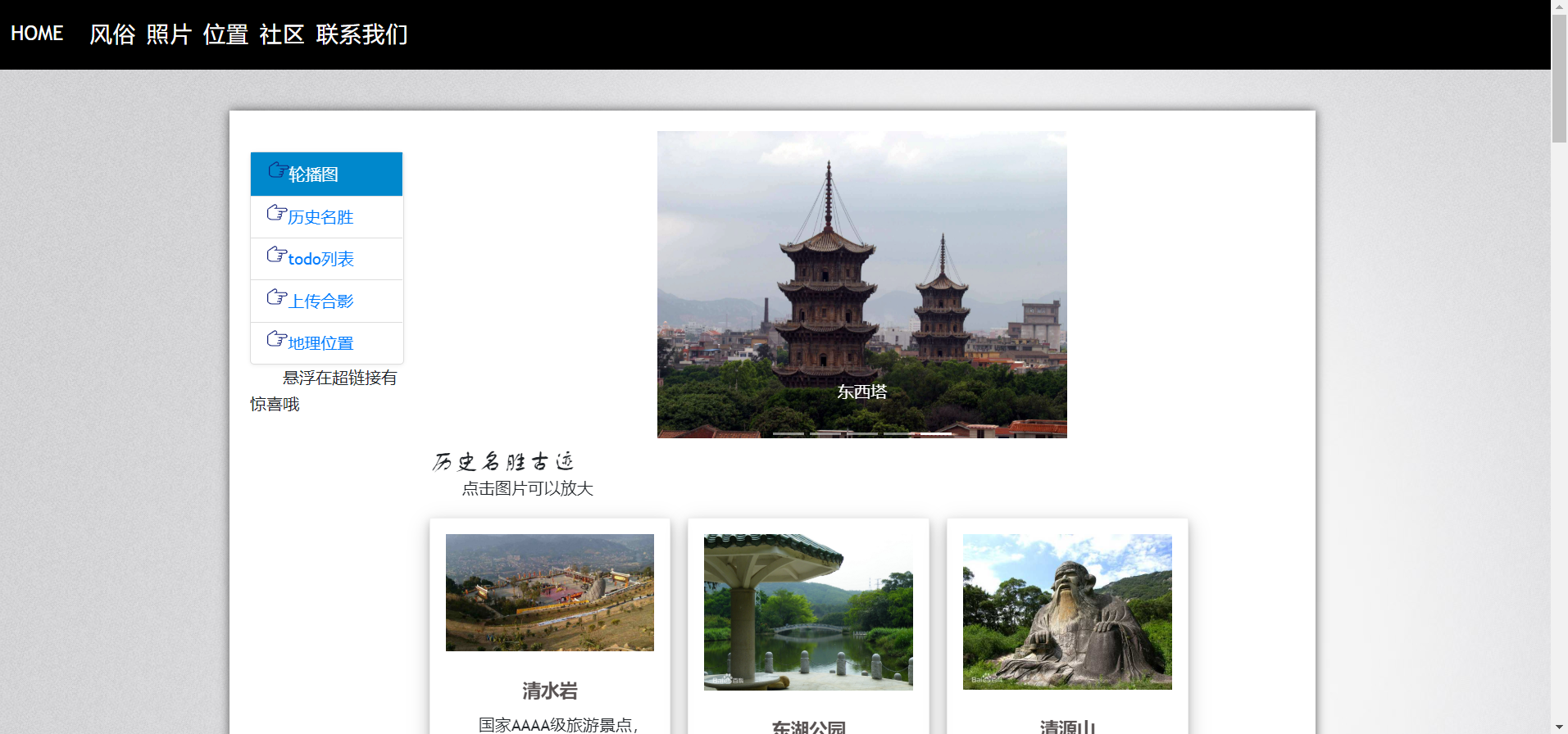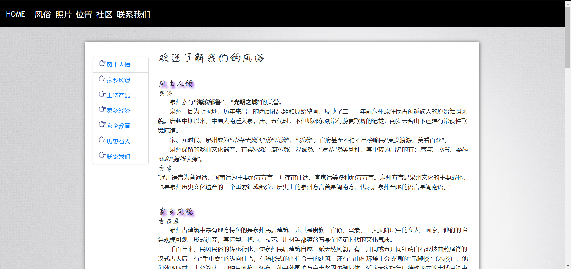 实验概述【实验目的及要求】我的家乡详细介绍自己的家乡,要求包括以下部分板块:风土人情、家乡风貌、家乡土特产品、家乡经济、家乡教育、文化传承、历史名人大事、历史名胜古迹、家乡社区与论坛要求模拟一个简单的论坛,完成的功能包括:1、各板块的静态页面,参考实验一和实验二2、页面中的各种动态效果和交互,如家乡图片的切换显示,可以使用JS插件或者HTML5实现3、家乡所在位置的地图显示,参考实验七4、论坛可以发帖、回帖、删除,所输入的内容在页面上有显示(不需要保存到数据库),参考实验五和实验六以上内容,只需要使用HTML、CSS、Javascript(包括Prototype或者JQuery等库)、Cookie、Google Maps等知识,不需要使用PHP的相关知识评分标准:源文件(20%),实验报告(20%),使用网页集进行完成(10%),文字、图片等内容正常排版(15%),具备JS交互功能(10%),正确显示地图(10%),简单论坛功能(15%)。其它未规定的功能酌情加分(10%)。美观度额外加分(5%)。总分不超过100分。【实验环境】操作系统:Windows 10浏览器:chrome 83.0.4103.106、firefox 68.9.0esr、 Edge、小米手机浏览器、firefox lite手机版