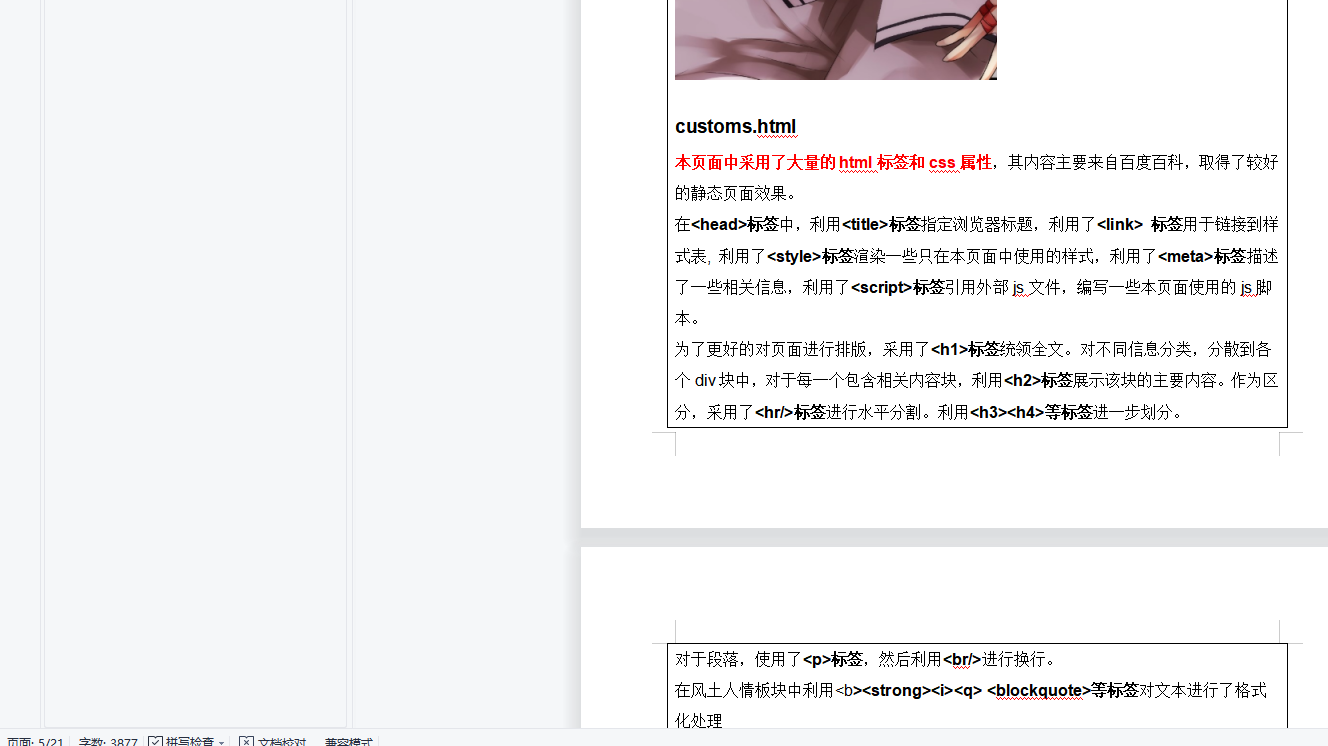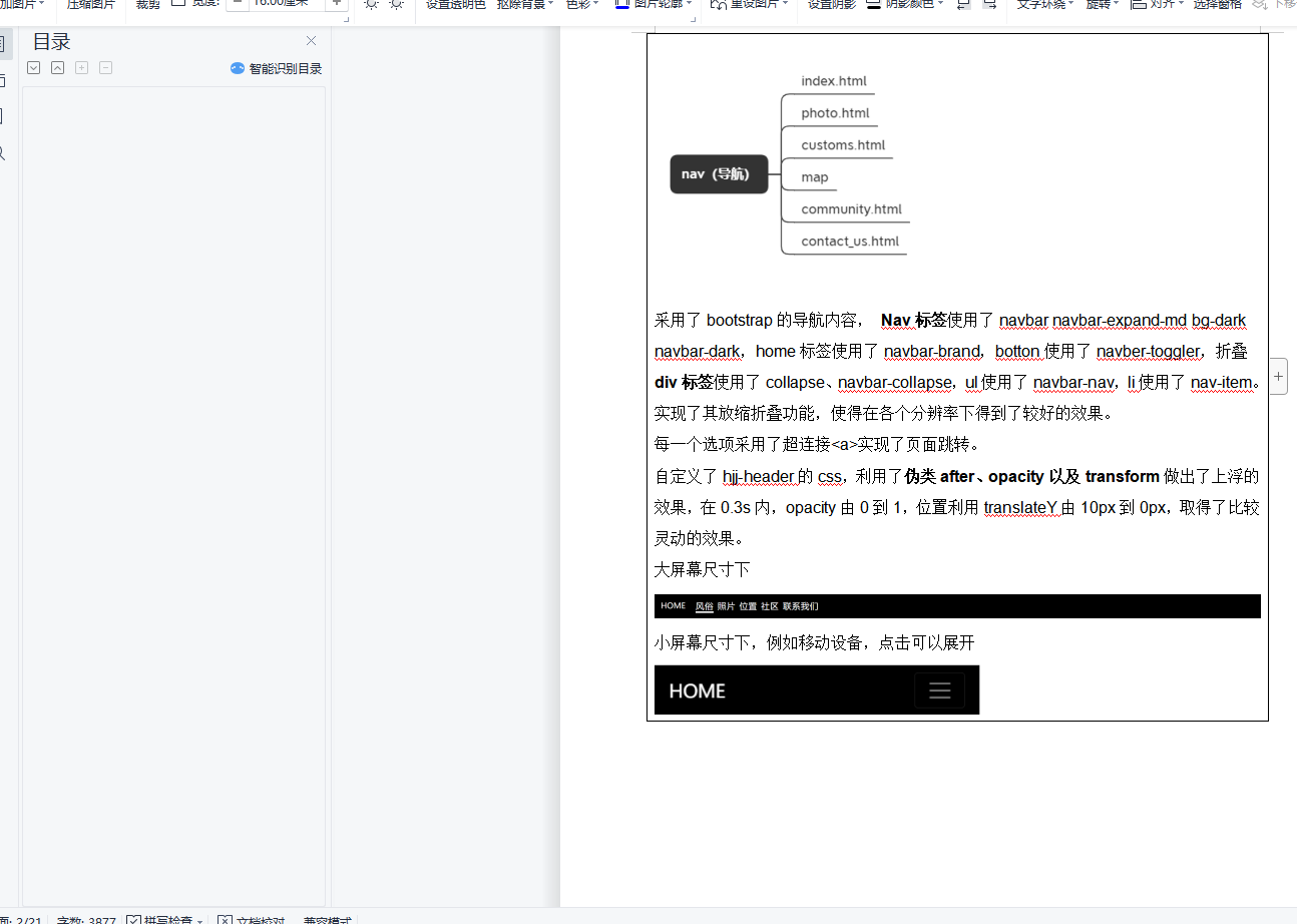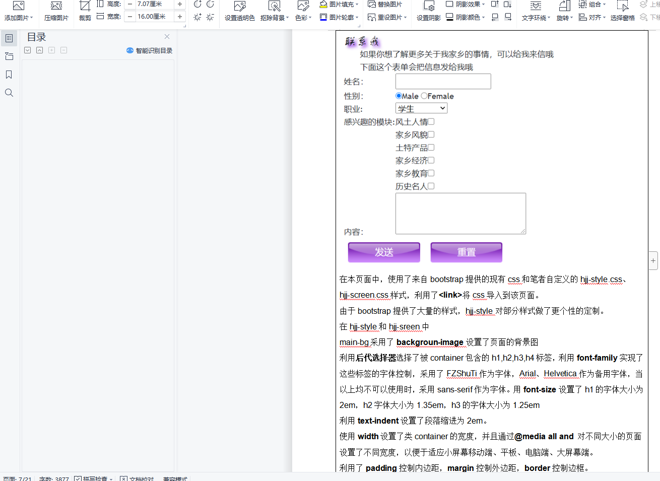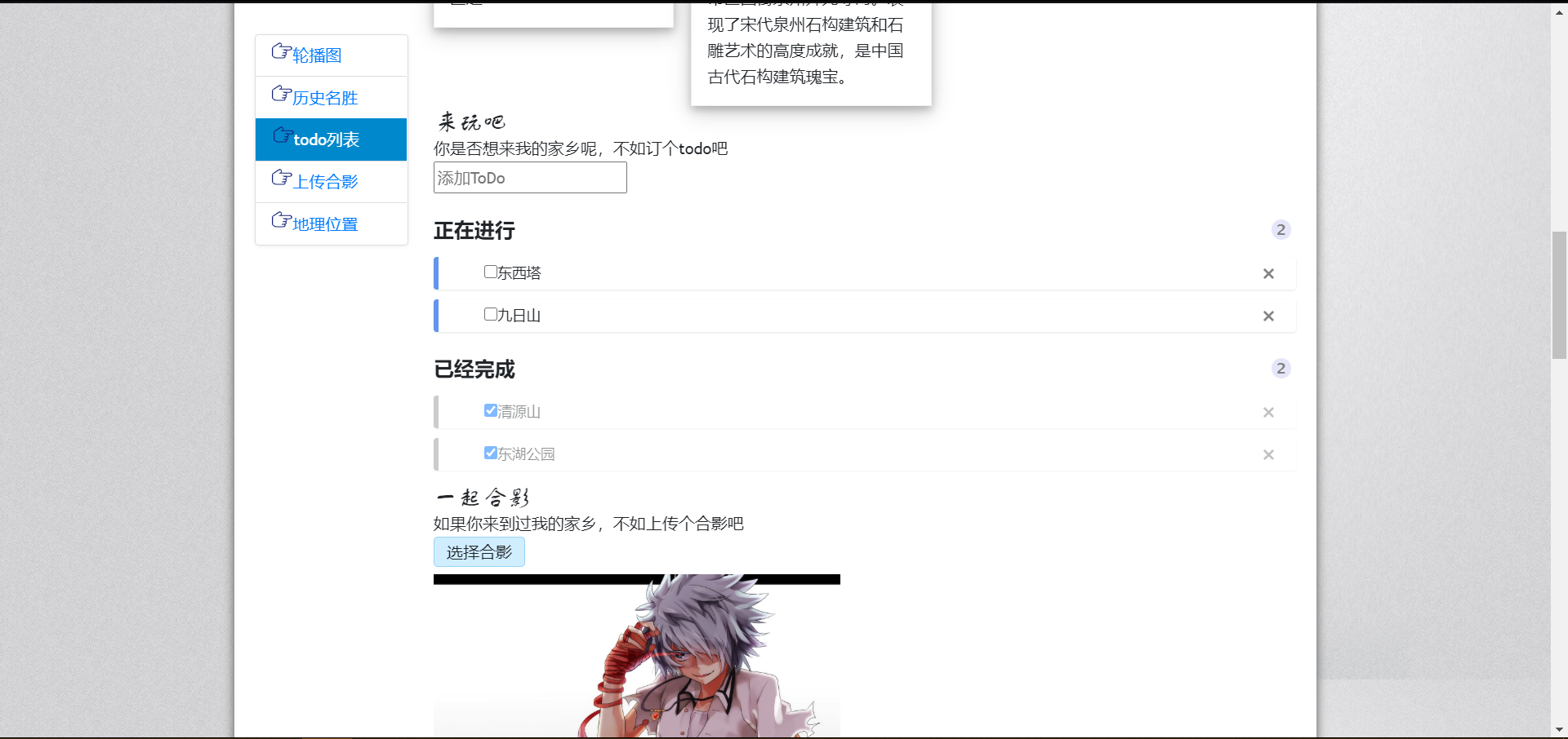 实验概述【实验目的及要求】我的家乡详细介绍自己的家乡,要求包括以下部分板块:风土人情、家乡风貌、家乡土特产品、家乡经济、家乡教育、文化传承、历史名人大事、历史名胜古迹、家乡社区与论坛要求模拟一个简单的论坛,完成的功能包括:1、各板块的静态页面,参考实验一和实验二2、页面中的各种动态效果和交互,如家乡图片的切换显示,可以使用JS插件或者HTML5实现3、家乡所在位置的地图显示,参考实验七4、论坛可以发帖、回帖、删除,所输入的内容在页面上有显示(不需要保存到数据库),参考实验五和实验六以上内容,只需要使用HTML、CSS、Javascript(包括Prototype或者JQuery等库)、Cookie、Google Maps等知识,不需要使用PHP的相关知识评分标准:源文件(20%),实验报告(20%),使用网页集进行完成(10%),文字、图片等内容正常排版(15%),具备JS交互功能(10%),正确显示地图(10%),简单论坛功能(15%)。其它未规定的功能酌情加分(10%)。美观度额外加分(5%)。总分不超过100分。【实验环境】操作系统:Windows 10浏览器:chrome 83.0.4103.106、firefox 68.9.0esr、 Edge、小米手机浏览器、firefox lite手机版