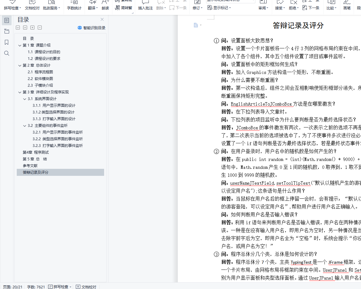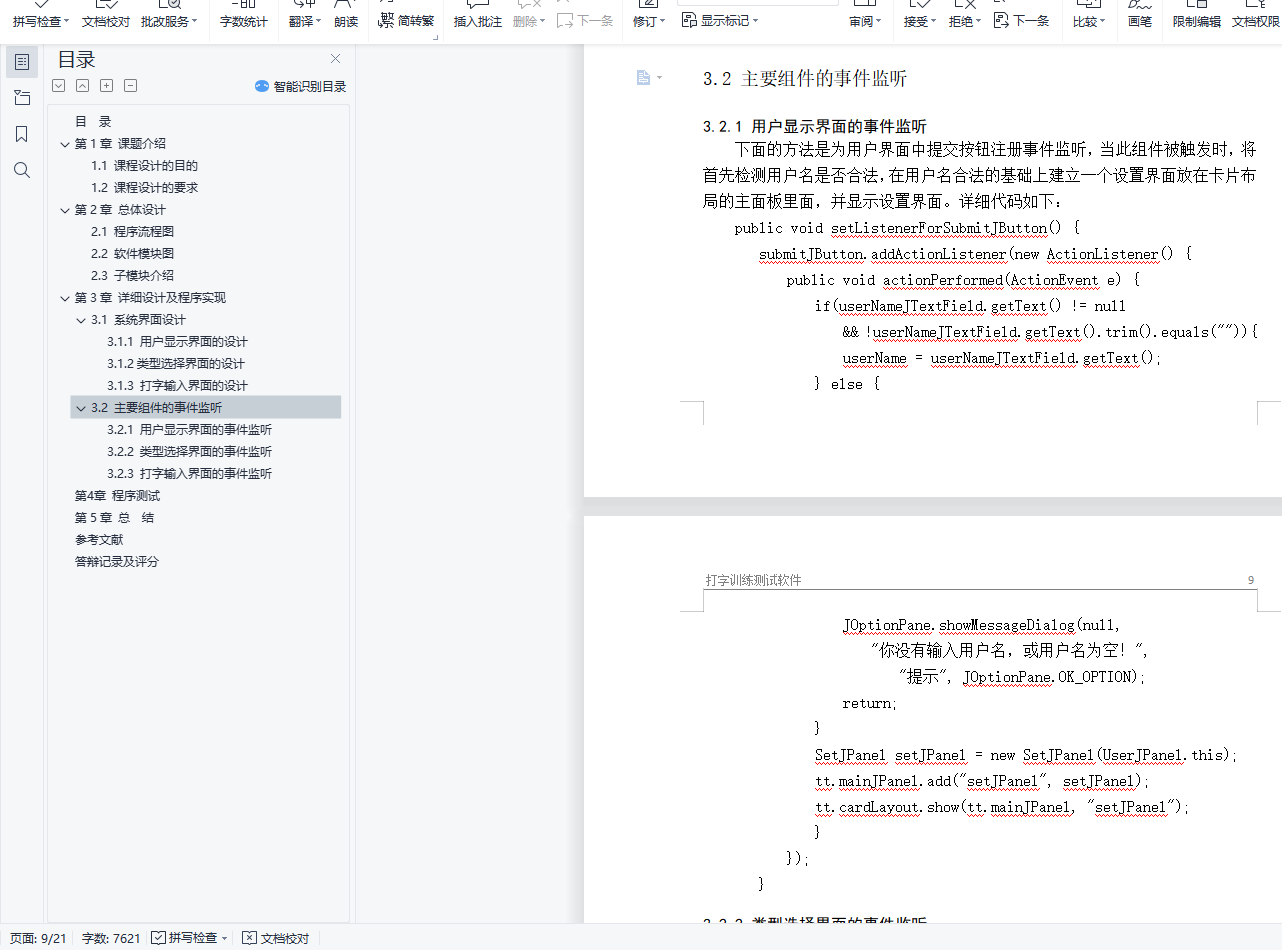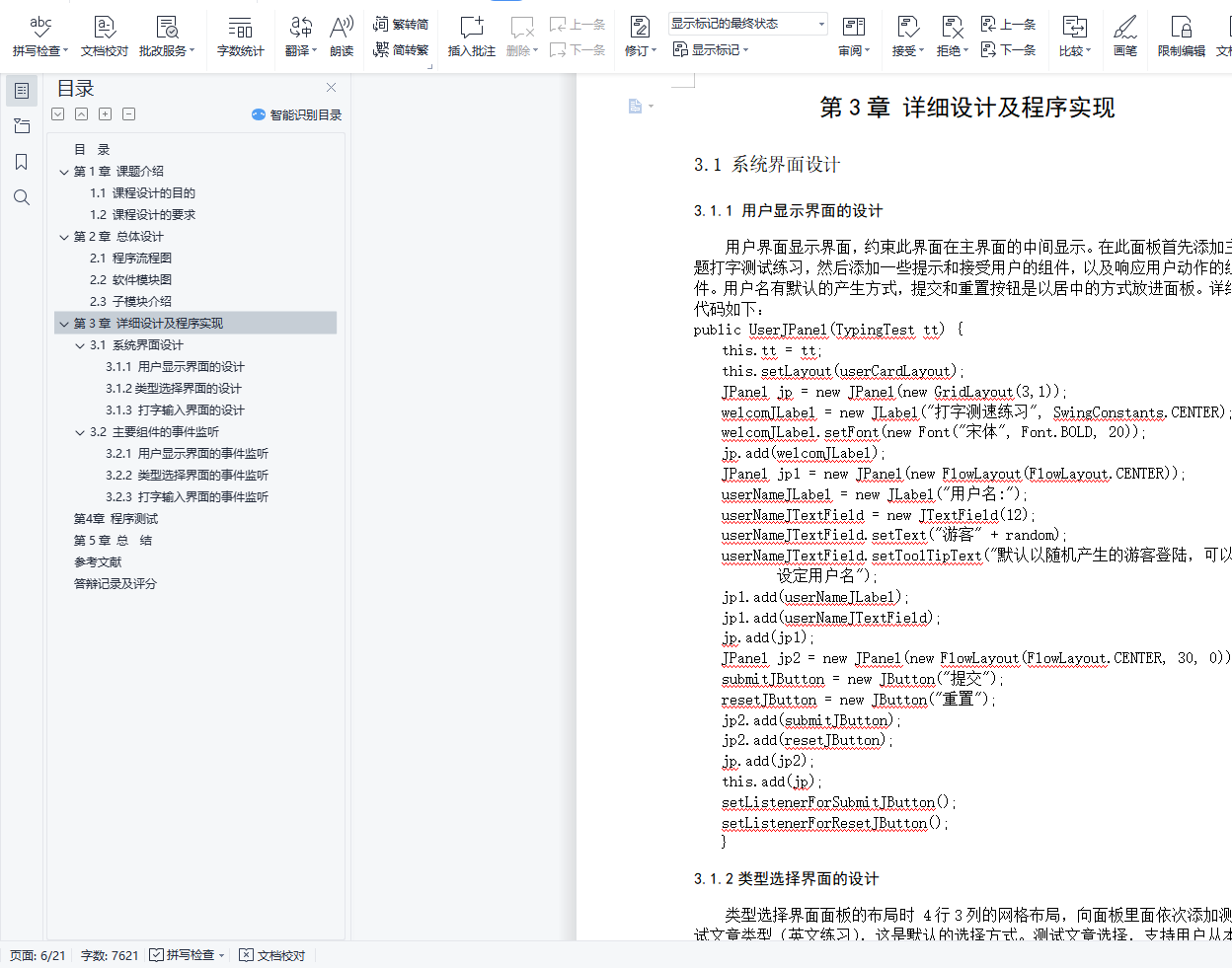 目 录课程设计情况概述 I目 录 II第1章 课题介绍 11.1 课程设计的目的 11.2 课程设计的要求 1第2章 总体设计 22.1 程序流程图 22.2 软件模块图 32.3 子模块介绍 3第3章 详细设计及程序实现 53.1 系统界面设计 53.1.1 用户显示界面的设计 53.1.2类型选择界面的设计 53.1.3 打字输入界面的设计 73.2 主要组件的事件监听 83.2.1 用户显示界面的事件监听 83.2.2 类型选择界面的事件监听 93.2.3 打字输入界面的事件监听 10第4章 程序测试 13第5章 总 结 16参考文献 18答辩记录及评分 19第1章 课题介绍1.1 课程设计的目的掌握java面向对象程序设计的概念,将所学的java知识用到实际的应用中,设计一个小型应用程序。此课题主要用到图形界面,多线程处理,输入输出流,容器及常用类的使用,熟悉基本组件及布局管理方式的应用,巩固java的基础知识。1.2 课程设计的要求1)可实现用户名的自定义设置或默认身份的进入 。2)可实现测试类型的选择、通过测试文章的下拉列表选择已导入目录的文章和用户本地导入、测试时间的自定义。3) 监听你的键盘录入,同时启动线程去判断用户输入的字符与模板上的字符是否一致,不正确的用红色标记,正确的显示为绿色。4) 启动测试时记录起始时间,结束时获得结束时间,通过时间差统计出错误率和平均录入的速度。5)可实现重新开始打字练习、暂停打字练习并随时可恢复练习功能的实现。6)可实现用户所有打字记录被保存并能查询。7)可实现能在界面之间切换。