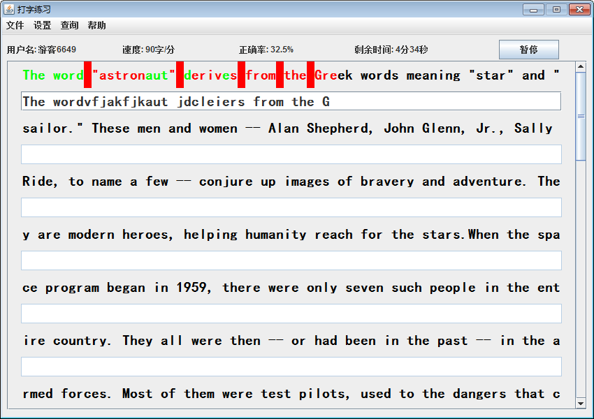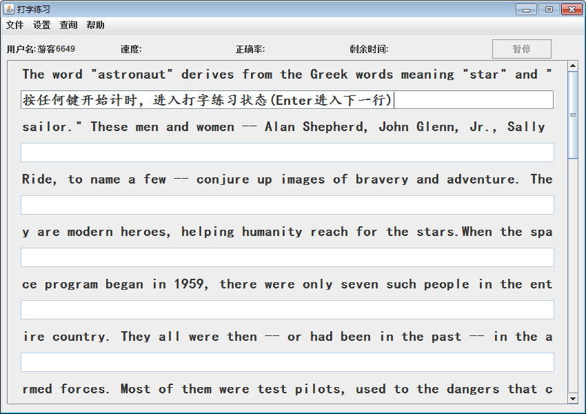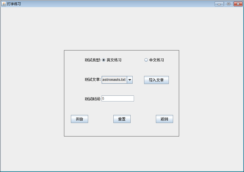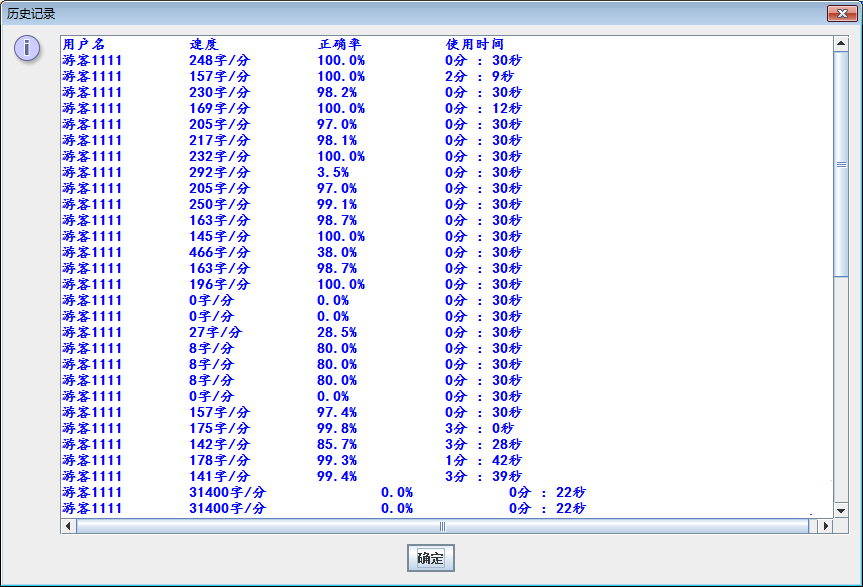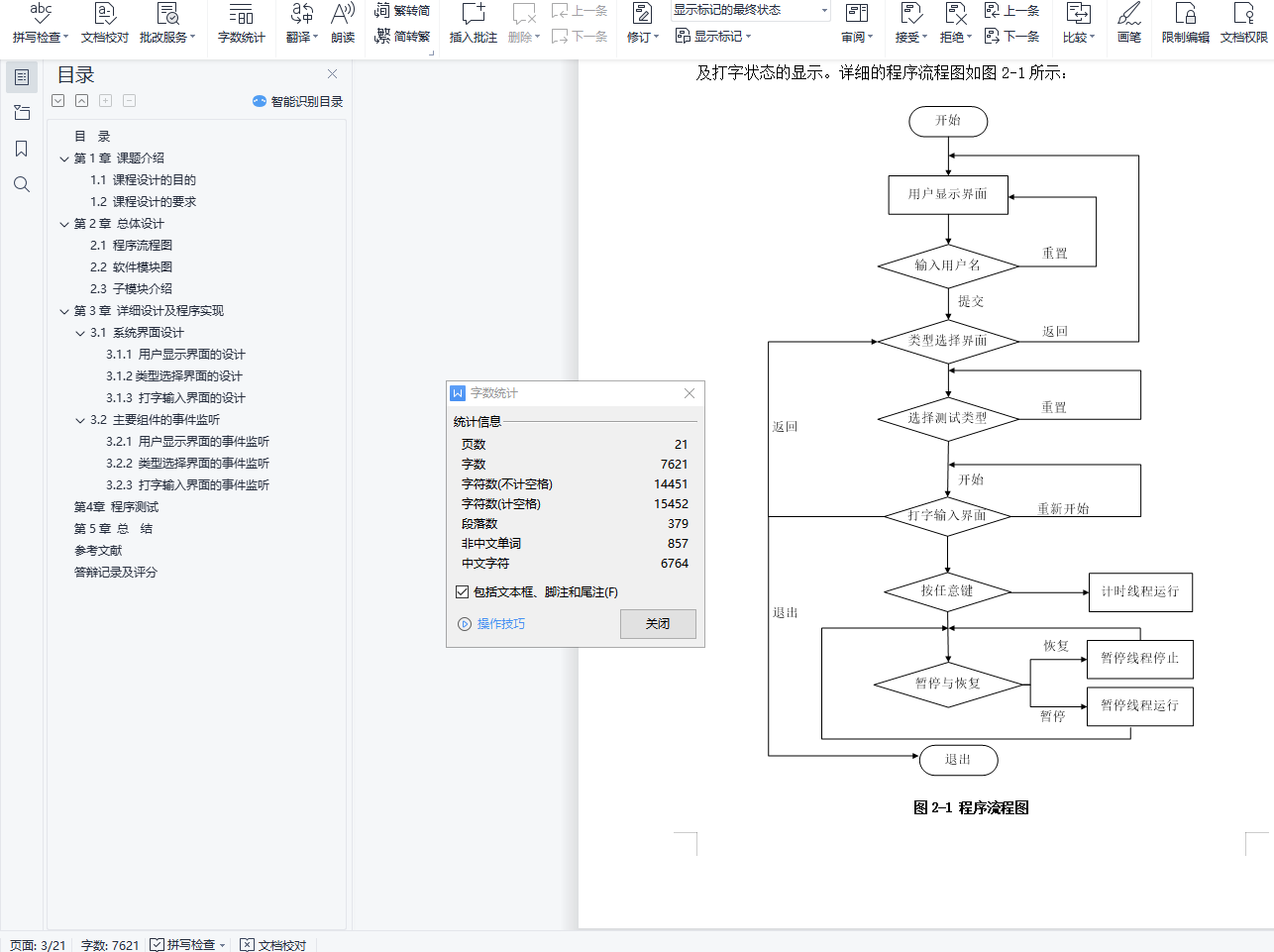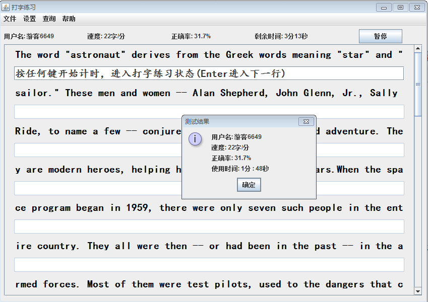 目 录课程设计情况概述 I目 录 II第1章 课题介绍 11.1 课程设计的目的 11.2 课程设计的要求 1第2章 总体设计 22.1 程序流程图 22.2 软件模块图 32.3 子模块介绍 3第3章 详细设计及程序实现 53.1 系统界面设计 53.1.1 用户显示界面的设计 53.1.2类型选择界面的设计 53.1.3 打字输入界面的设计 73.2 主要组件的事件监听 83.2.1 用户显示界面的事件监听 83.2.2 类型选择界面的事件监听 93.2.3 打字输入界面的事件监听 10第4章 程序测试 13第5章 总 结 16参考文献 18答辩记录及评分 19第1章 课题介绍1.1 课程设计的目的掌握java面向对象程序设计的概念,将所学的java知识用到实际的应用中,设计一个小型应用程序。此课题主要用到图形界面,多线程处理,输入输出流,容器及常用类的使用,熟悉基本组件及布局管理方式的应用,巩固java的基础知识。1.2 课程设计的要求1)可实现用户名的自定义设置或默认身份的进入 。2)可实现测试类型的选择、通过测试文章的下拉列表选择已导入目录的文章和用户本地导入、测试时间的自定义。3) 监听你的键盘录入,同时启动线程去判断用户输入的字符与模板上的字符是否一致,不正确的用红色标记,正确的显示为绿色。4) 启动测试时记录起始时间,结束时获得结束时间,通过时间差统计出错误率和平均录入的速度。5)可实现重新开始打字练习、暂停打字练习并随时可恢复练习功能的实现。6)可实现用户所有打字记录被保存并能查询。7)可实现能在界面之间切换。