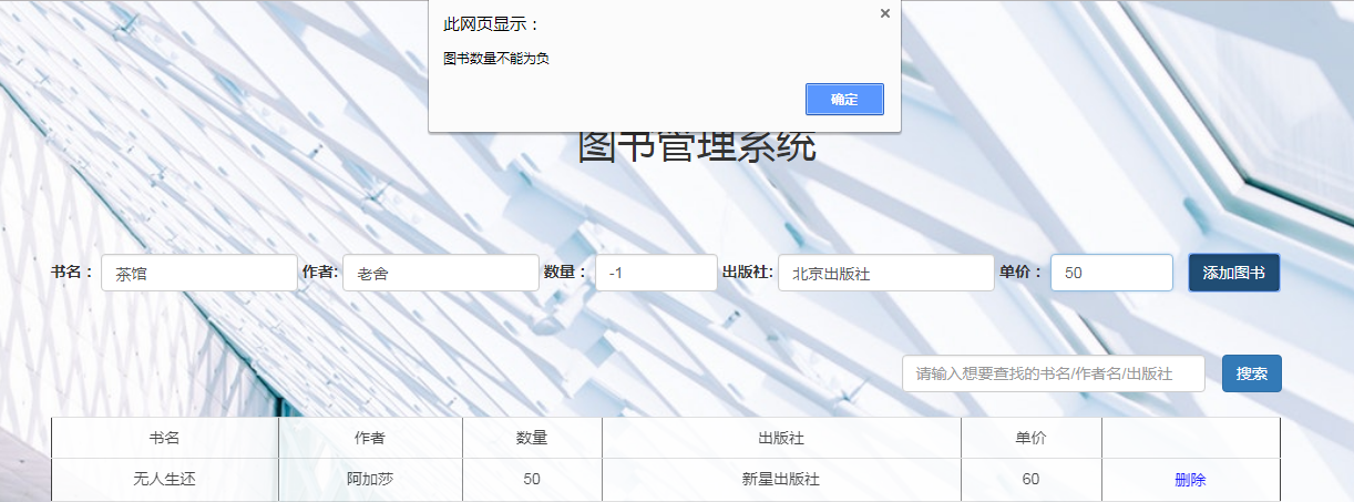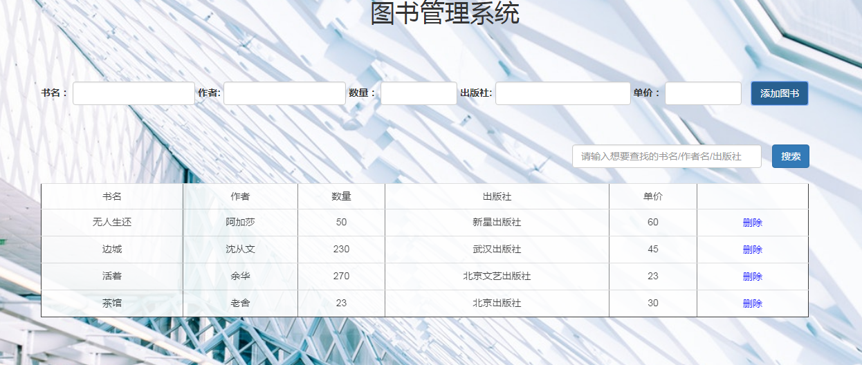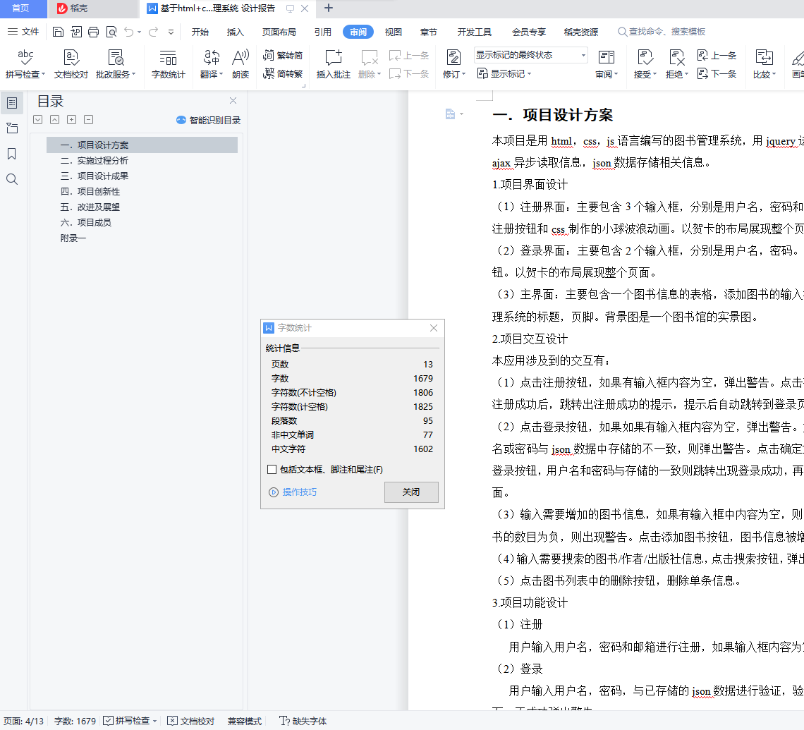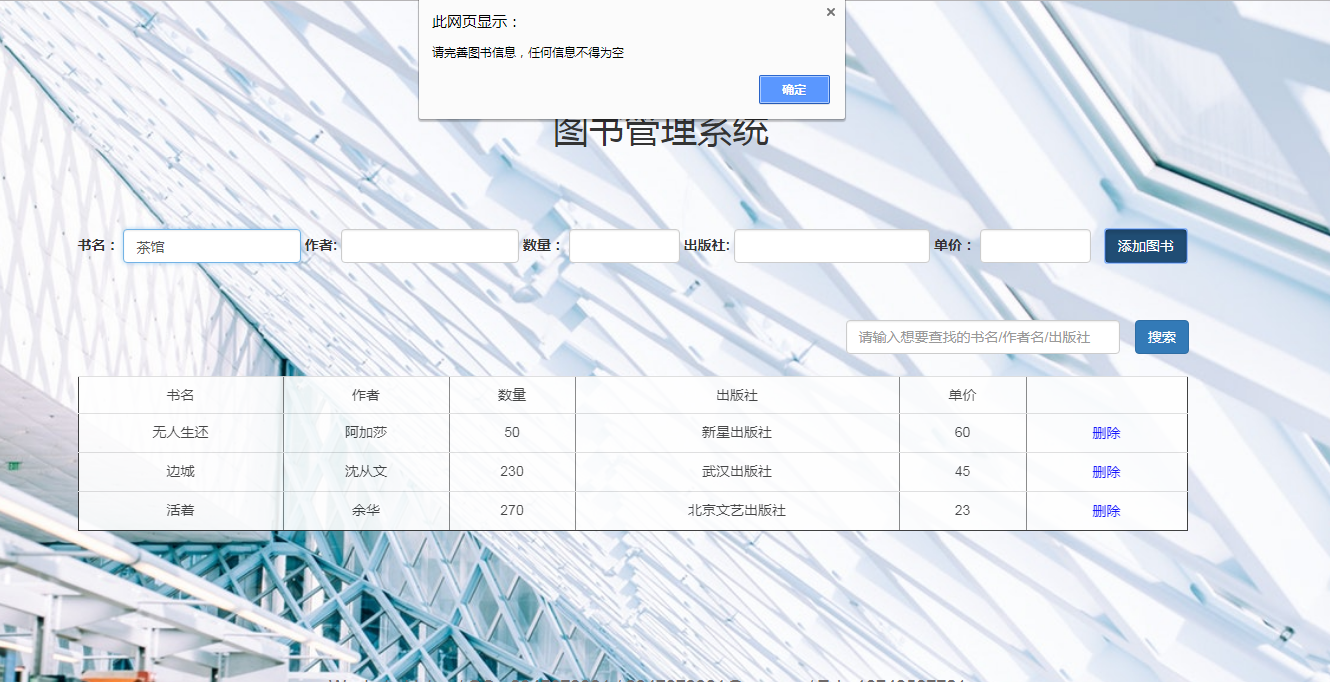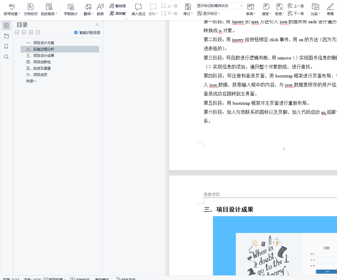 目 录一.项目设计方案 4二.实施过程分析 4三.项目设计成果 4四.项目创新性 4五.改进及展望 4六.项目成员 4附录一 5一.项目设计方案本项目是用html,css,js语言编写的图书管理系统,用jquery进行页面的加工,ajax异步读取信息,json数据存储相关信息。1.项目界面设计(1)注册界面:主要包含3个输入框,分别是用户名,密码和邮箱。下方一个注册按钮和css制作的小球波浪动画。以贺卡的布局展现整个页面。(2)登录界面:主要包含2个输入框,分别是用户名,密码。下方一个登录按钮。以贺卡的布局展现整个页面。(3)主界面:主要包含一个图书信息的表格,添加图书的输入框,搜索框,管理系统的标题,页脚。背景图是一个图书馆的实景图。目 录一.项目设计方案 4二.实施过程分析 4三.项目设计成果 4四.项目创新性 4五.改进及展望 4六.项目成员 4附录一 5一.项目设计方案本项目是用html,css,js语言编写的图书管理系统,用jquery进行页面的加工,ajax异步读取信息,json数据存储相关信息。1.项目界面设计(1)注册界面:主要包含3个输入框,分别是用户名,密码和邮箱。下方一个注册按钮和css制作的小球波浪动画。以贺卡的布局展现整个页面。(2)登录界面:主要包含2个输入框,分别是用户名,密码。下方一个登录按钮。以贺卡的布局展现整个页面。(3)主界面:主要包含一个图书信息的表格,添加图书的输入框,搜索框,管理系统的标题,页脚。背景图是一个图书馆的实景图。
