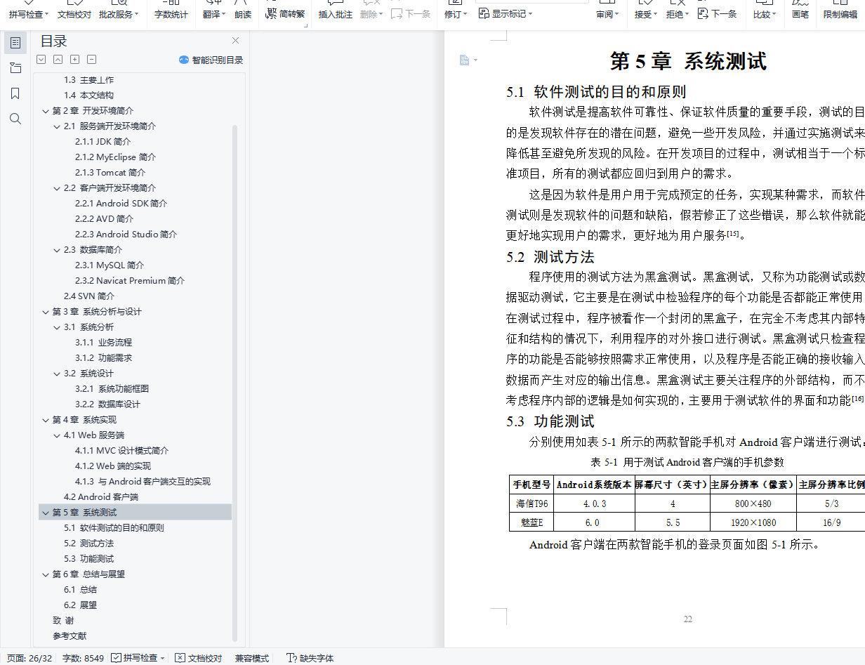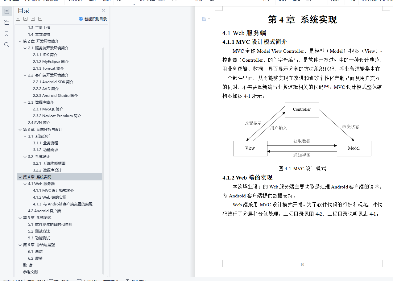 摘 要近年来,随着智能手机的普及,移动互联网得到了快速的发展,人们的日常生活已与手机紧密的联系在一起。在传统医学诊断中,患者在每次就医后,都会得到一份诊疗的结果和纸质的病历,但由于不同医院不同医生对应的病历信息都不同,所以患者的病历信息的整理与管理都十分的不方便。在这种情况下,常规的纸质病历模式就充分暴露出了自己的弊端,显得心有余而力不足。为了能有效的解决个人医疗信息管理、电子病历归档的问题,方便患者每次就医时向医生陈述自己的病情,充分发挥个人医疗信息的作用,特提出本课题。通过学习信息检索的基础理论知识、Java编程语言及SQL数据库语言,掌握安卓开发的基本流程、方法与开发工具,设计开发基于安卓的医疗信息检索客户端,从而实现个人医疗信息的自主管理。关键词:医疗信息,安卓,信息检索,电子病历AbstractIn recent years, with the popularity of smart phones, mobile Internet has been rapid development, people's daily life has been closely linked with the phone.In the traditional medical diagnosis, the patient after each medical treatment will get a diagnosis and treatment of the results of paper and medical records, but medical records are different because of the hospitals are different or the doctors are different, so the patient's medical record information collection and management is very inconvenient. In this case, the conventional paper medical record model to fully expose their own shortcomings, seemed to be more than enough. In order to effectively solve the personal medical information management, electronic medical records of the problem, to facilitate the patient every time he went to the doctor to state his illness, give full play to the role of personal medical information, especially the subject.By learning the basic theory of information retrieval, Java programming language and SQL database language, master the basic process, method and development tools of Android development, design and development based on Android medical information retrieval client, in order to achieve personal medical information management.Keywords: medical information, android, information retrieval, electronic cases目 录摘 要 IAbstract II第1章 绪论 11.1 研究背景 11.2 研究现状 11.3 主要工作 21.4 本文结构 3第2章 开发环境简介 42.1 服务端开发环境简介 42.2 客户端开发环境简介 42.3 数据库简介 52.4 SVN简介 5第3章 系统分析与设计 63.1 系统分析 63.2 系统设计 7第4章 系统实现 104.1 Web服务端 104.2 Android客户端 12第5章 系统测试 225.1 软件测试的目的和原则 225.2 测试方法 225.3 功能测试 22第6章 总结与展望 246.1 总结 246.2 展望 24致 谢 26参考文献 27