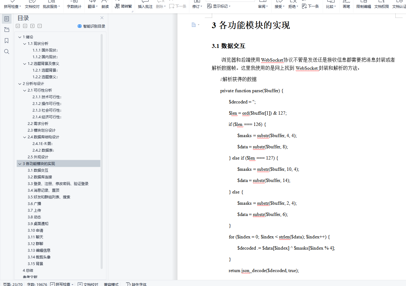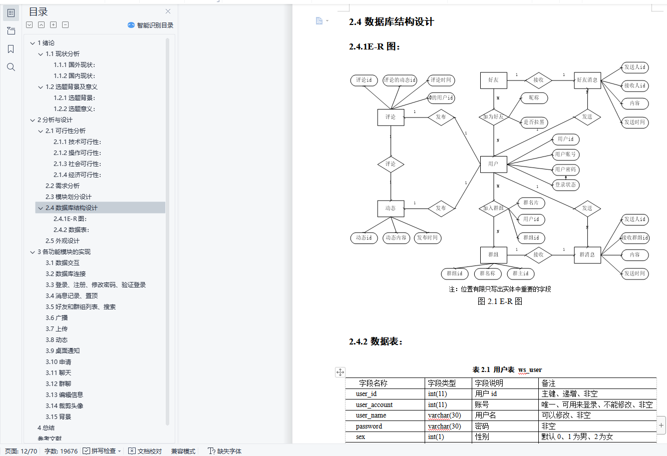 基于vue的实时交流平台的设计与实现摘要随着互联网的发展和智能手机的普及,人们在网络上聊天通讯已成为日常,通常情况下我们会在电脑端安装客户端和在手机安装app聊天,但如果在没有聊天软件时需要紧急通信只能花费时间和流量下载软件,而这时如果有像微信网页版这样的web端应用就可以解决问题了。所以我想做一个像微信网页版的实时交流平台。使用Vue.js开发出web端的实时交流平台,可以进行一对一聊天、多人群聊,聊天可以发送文字、表情、小文件,用户可以修改添加基本信息、签名、修改裁剪头像,用户可以创建群聊搜索其他用户来增删自己的好友和群组成员,还有发布动态让好友了解自己当时的动态想法。页面设计采用响应式网页设计,智能地根据用户行为以及使用的设备环境进行相对应的布局。关键词:实时交流;Vue;WebSocket;PHPDesign and implementation of real-time communication platform based on vueABSTRACTWith the development of the Internet and the popularity of smartphones, people chat on the Internet has become a daily routine. Usually, we will install the client on the computer and install the app on the mobile phone, but if there is no chat software, urgent communication is needed. It can take time and traffic to download software, and if there is a web-side application like WeChat web version, it can solve the problem. So I want to be a real-time communication platform like WeChat web version.Using Vue.js to develop a real-time communication platform on the web side, one-to-one chat, multi-group chat, chat can send text, expressions, small files, users can modify to add basic information, signature, modify cropped avatar, users can create groups Chat to search for other users to add and delete their friends and group members, as well as release dynamics to let friends know their dynamic ideas at the time. The page design uses a responsive web design that intelligently maps to the user's behavior and the device environment used.Key words:Real-time communication;Vue;WebSocket;PHP目 录1绪论 11.1现状分析 11.1.1国外现状: 11.1.2国内现状: 11.2选题背景及意义 11.2.1选题背景: 11.2.2选题意义: 22分析与设计 22.1可行性分析 22.1.1技术可行性: 22.1.2操作可行性: 52.1.3社会可行性: 52.1.4经济可行性: 52.2需求分析 52.3模块划分设计 62.4数据库结构设计 72.4.1E-R图: 72.4.2数据表: 72.5外观设计 123各功能模块的实现 183.1数据交互 183.2数据库连接 203.3登录、注册、修改密码、验证登录 263.4消息记录、置顶 303.5好友和群组列表、搜索 343.6广播 373.7上传 403.8动态 413.9桌面通知 453.10申请 473.11聊天 493.12群聊 523.13编辑信息 553.14裁剪头像 573.15背景 604总结 62参考文献 64致谢 65附录 66