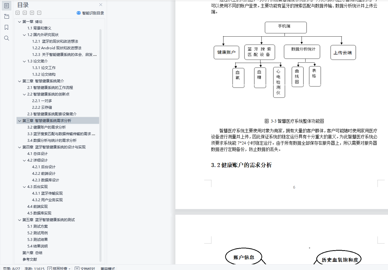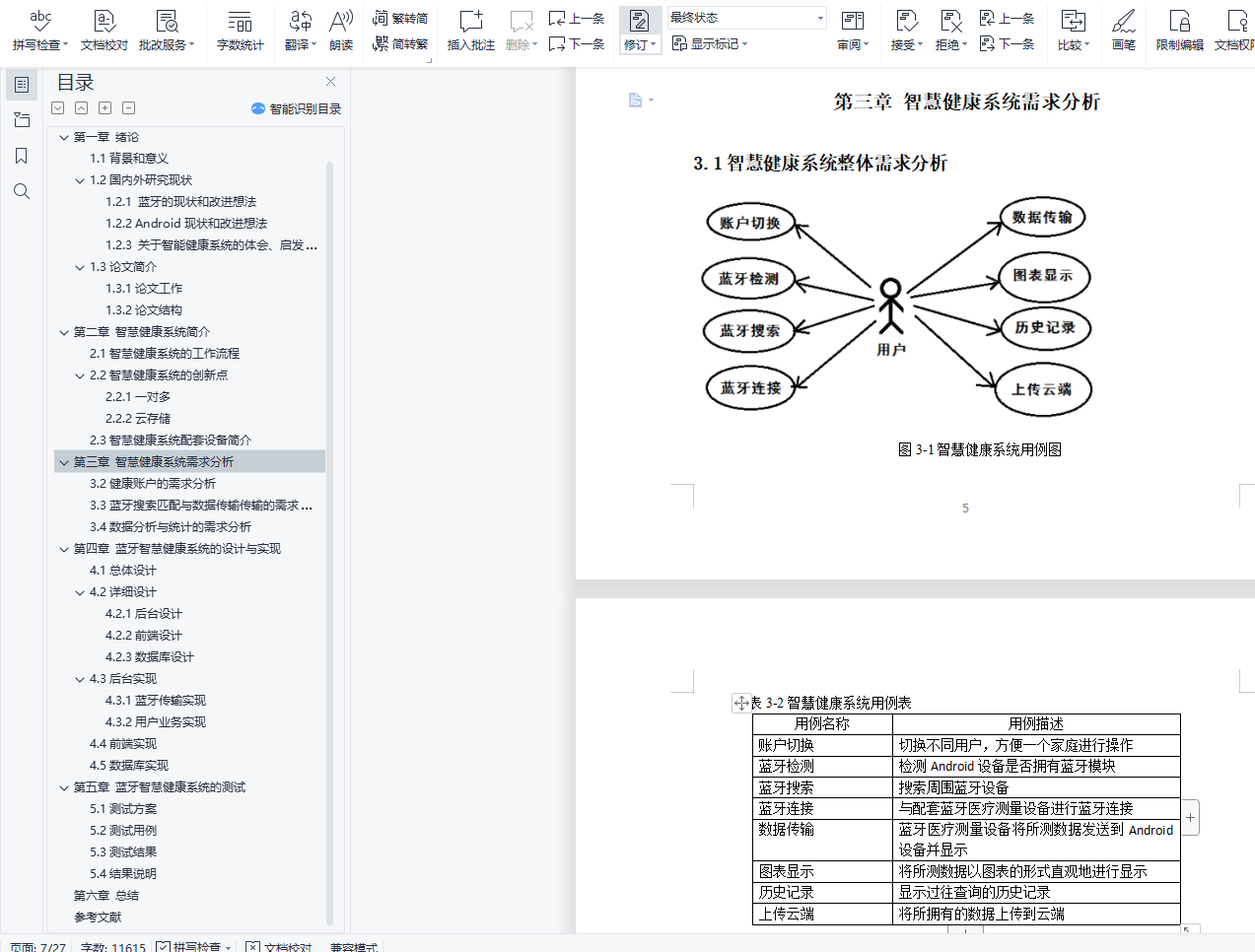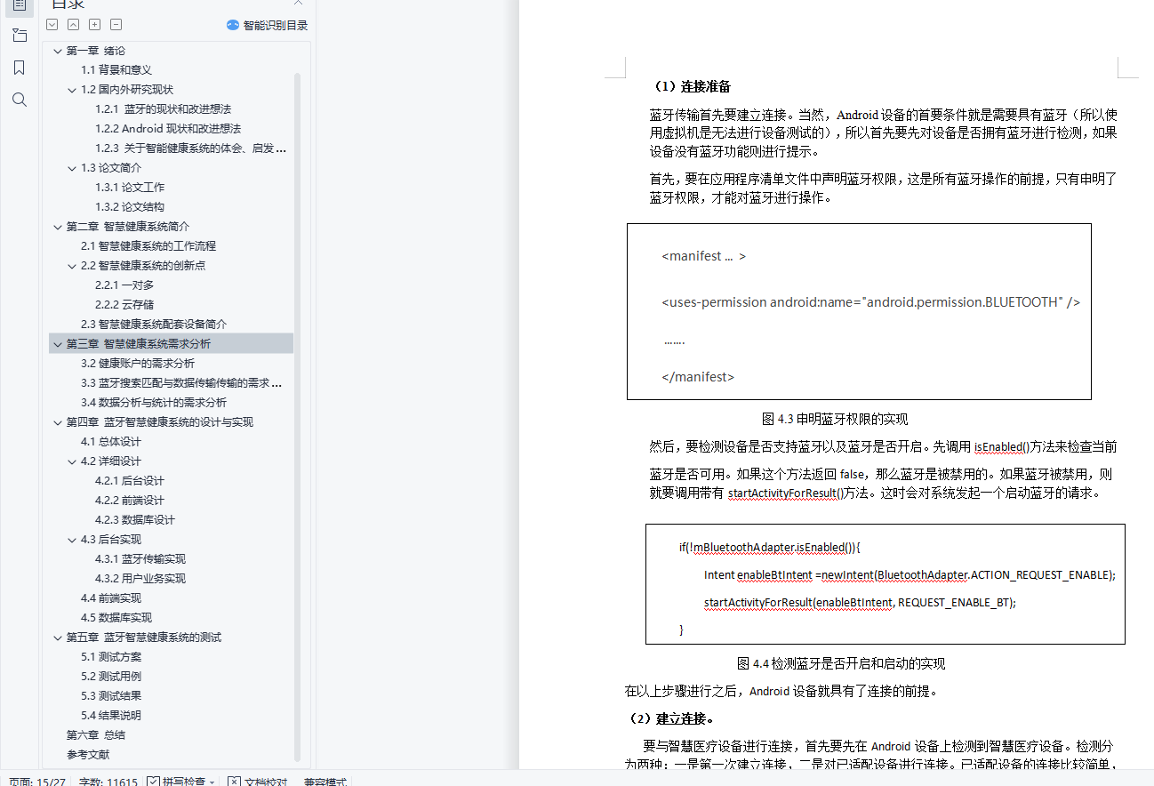 蓝牙智慧健康系统的设计与实现【摘要】随着现代信息的技术的不断发展及人们对健康的日益关注,健康检测设备越来越多地走进寻常百姓家。目前国内的智能健康软件还存在着不实用、通信差等不足。本文综合国内外现有的研究,对现有的智能健康软件状况进行分析,结合现在Android市场的火热以及蓝牙技术的兴起提出一个有效的改进方案――医疗健康设备和蓝牙设备技术的结合。其思想就是开发一个拥有蓝牙权限的健康系统,使Android设备能与蓝牙医疗测量设备进行可靠通信;当用户在蓝牙医疗测量设备进行测量时,所测数据就会通过蓝牙传输到Android设备,健康系统再对所接收的数据进行处理分析并上传服务器。其优点在于可以对数据进行分析与存储,免去手工记录的繁琐,帮助用户便捷地管理自己的健康信息,和以往的医疗健康系统比较起来有着较大的优势。【关键字】 Bluetooth;Android;Java;医疗Research on Bluetooth Intelligent Health SystemBased on Android【Abstract】 With the development of modern information technology and people are paying more and more attention to health, the medical and health system more and more into the homes of ordinary people. In recent years, many families have health detection equipment (blood glucose, blood pressure, oximetry), but only by the health detection equipment to measure insufficient records, analysis and so on. A practical, suitable for use in the elderly and intuitive wisdom health system is very promising. At present, the domestic smart health system are still not practical, communication etc.. Existing research at home and abroad in this paper, the health conditions of the existing intelligent software to carry on the analysis, combined with the rise of Android market fiery and Bluetooth technology now provide an effective improvement scheme of health care equipment and Bluetooth technology. The idea is to develop a bluetooth access health system, the Android device can communicate reliably measuring devices with Bluetooth medical; when measuring the user in the Bluetooth medical measuring equipment, the measured data will be transmitted via Bluetooth to the Android equipment, health system of the received data is processed and uploaded server. Its advantage is that it can be for the data analysis and storage, eliminating manual recording tape, help users to easily manage their own health information, compared with the health care system in the past have great advantage.【Keywords】 Bluetooth, Android,Java, medical目录第一章 绪论 11.1背景和意义 11.2国内外研究现状 11.2.1 蓝牙的现状和改进想法 11.2.2 Android现状和改进想法 21.2.3 关于智能健康系统的体会、启发与想法 21.3论文简介 31.3.1论文工作 31.3.2论文结构 3第二章 智慧健康系统简介 32.1智慧健康系统的工作流程 32.2智慧健康系统的创新点 42.2.1一对多 42.2.2云存储 42.3智慧健康系统配套设备简介 5第三章 智慧健康系统需求分析 53.2健康账户的需求分析 63.3蓝牙搜索匹配与数据传输传输的需求分析 83.4数据分析与统计的需求分析 9第四章 蓝牙智慧健康系统的设计与实现 104.1总体设计 104.2详细设计 114.2.1后台设计 114.2.2前端设计 124.2.3数据库设计 124.3后台实现 124.3.1蓝牙传输实现 124.3.2用户业务实现 164.4前端实现 164.5数据库实现 19第五章 蓝牙智慧健康系统的测试 205.1测试方案 205.2测试用例 205.3测试结果 215.4结果说明 24第六章 总结 24参考文献 25