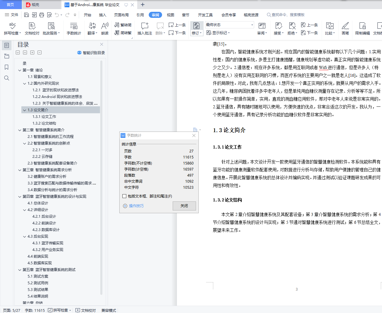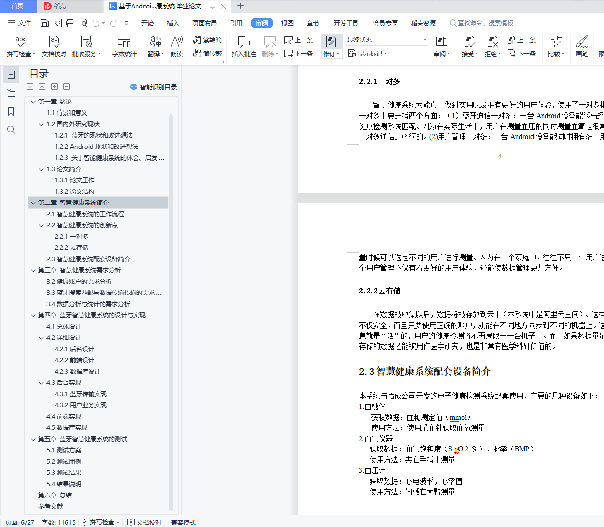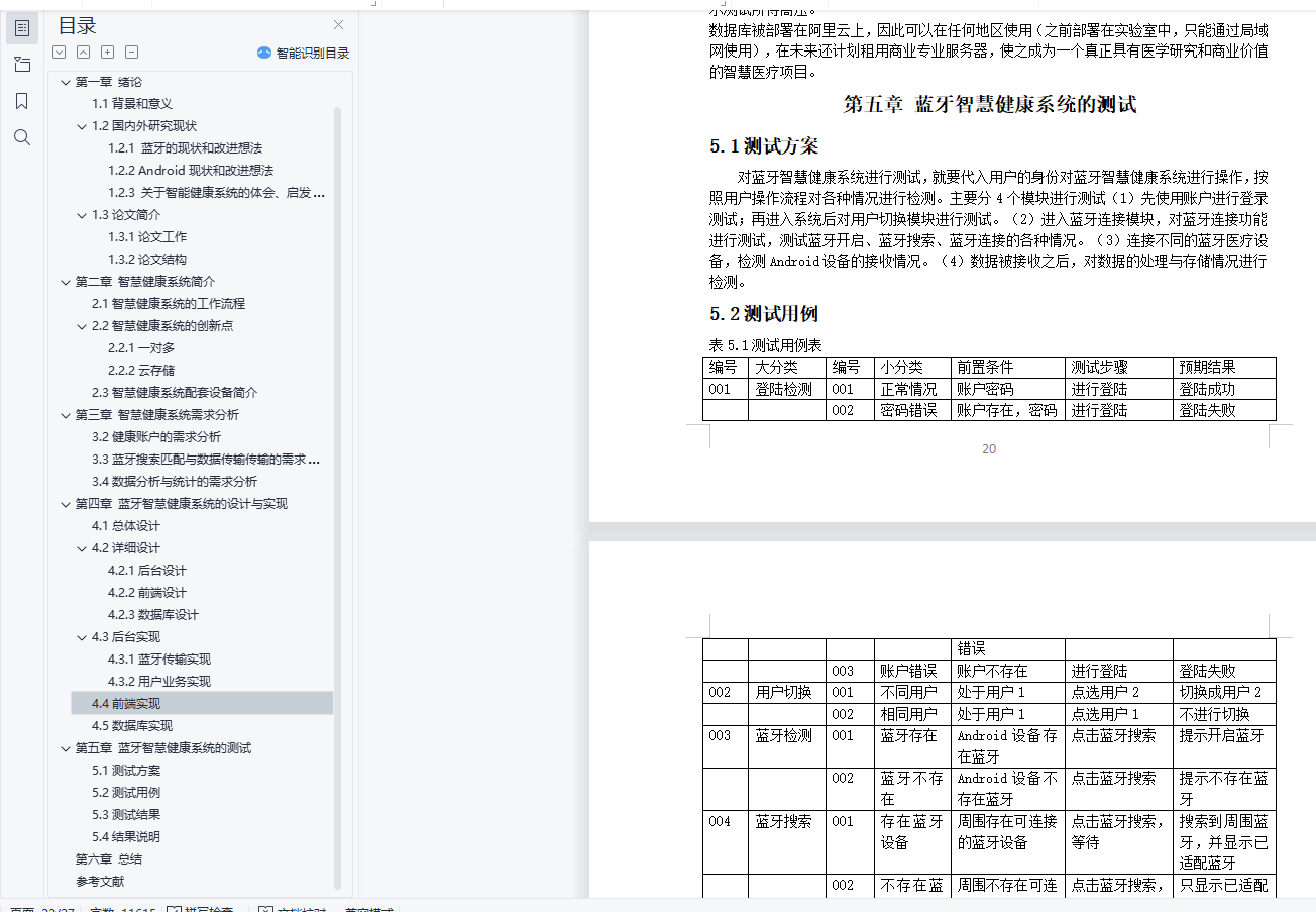蓝牙智慧健康系统的设计与实现【摘要】随着现代信息的技术的不断发展及人们对健康的日益关注,健康检测设备越来越多地走进寻常百姓家。目前国内的智能健康软件还存在着不实用、通信差等不足。本文综合国内外现有的研究,对现有的智能健康软件状况进行分析,结合现在Android市场的火热以及蓝牙技术的兴起提出一个有效的改进方案――医疗健康设备和蓝牙设备技术的结合。其思想就是开发一个拥有蓝牙权限的健康系统,使Android设备能与蓝牙医疗测量设备进行可靠通信;当用户在蓝牙医疗测量设备进行测量时,所测数据就会通过蓝牙传输到Android设备,健康系统再对所接收的数据进行处理分析并上传服务器。其优点在于可以对数据进行分析与存储,免去手工记录的繁琐,帮助用户便捷地管理自己的健康信息,和以往的医疗健康系统比较起来有着较大的优势。【关键字】 Bluetooth;Android;Java;医疗Research on Bluetooth Intelligent Health SystemBased on Android【Abstract】 With the development of modern information technology and people are paying more and more attention to health, the medical and health system more and more into the homes of ordinary people. In recent years, many families have health detection equipment (blood glucose, blood pressure, oximetry), but only by the health detection equipment to measure insufficient records, analysis and so on. A practical, suitable for use in the elderly and intuitive wisdom health system is very promising. At present, the domestic smart health system are still not practical, communication etc.. Existing research at home and abroad in this paper, the health conditions of the existing intelligent software to carry on the analysis, combined with the rise of Android market fiery and Bluetooth technology now provide an effective improvement scheme of health care equipment and Bluetooth technology. The idea is to develop a bluetooth access health system, the Android device can communicate reliably measuring devices with Bluetooth medical; when measuring the user in the Bluetooth medical measuring equipment, the measured data will be transmitted via Bluetooth to the Android equipment, health system of the received data is processed and uploaded server. Its advantage is that it can be for the data analysis and storage, eliminating manual recording tape, help users to easily manage their own health information, compared with the health care system in the past have great advantage.【Keywords】 Bluetooth, Android,Java, medical目录第一章 绪论 11.1背景和意义 11.2国内外研究现状 11.2.1 蓝牙的现状和改进想法 11.2.2 Android现状和改进想法 21.2.3 关于智能健康系统的体会、启发与想法 21.3论文简介 31.3.1论文工作 31.3.2论文结构 3第二章 智慧健康系统简介 32.1智慧健康系统的工作流程 32.2智慧健康系统的创新点 42.2.1一对多 42.2.2云存储 42.3智慧健康系统配套设备简介 5第三章 智慧健康系统需求分析 53.2健康账户的需求分析 63.3蓝牙搜索匹配与数据传输传输的需求分析 83.4数据分析与统计的需求分析 9第四章 蓝牙智慧健康系统的设计与实现 104.1总体设计 104.2详细设计 114.2.1后台设计 114.2.2前端设计 124.2.3数据库设计 124.3后台实现 124.3.1蓝牙传输实现 124.3.2用户业务实现 164.4前端实现 164.5数据库实现 19第五章 蓝牙智慧健康系统的测试 205.1测试方案 205.2测试用例 205.3测试结果 215.4结果说明 24第六章 总结 24参考文献 25
