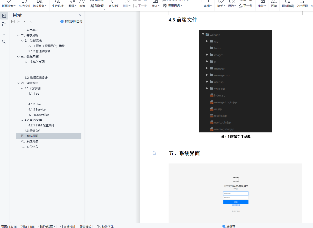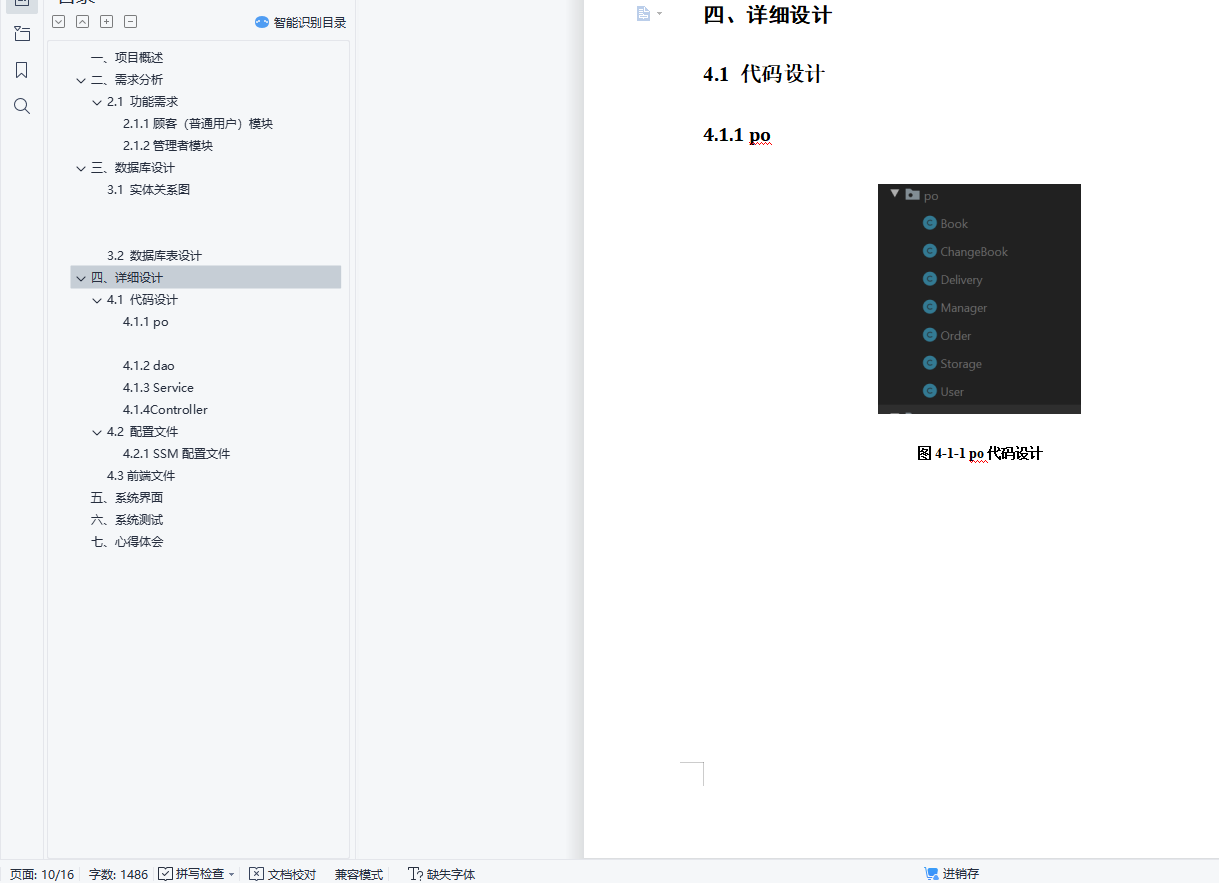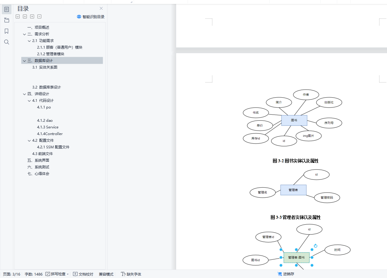 目 录一、 项目概述 4二、需求分析 42.1 功能需求 4三、数据库设计 53.1 实体关系图 53.2 数据库表设计 8四、详细设计 124.1 代码设计 124.2 配置文件 144.3前端文件 15五、系统界面 15六、 系统测试 18七、 心得体会 18一、项目概述图书商城是一个在线购书系统,为用户提供图书展示,图书购买等服务主要系统模块包含:(1)用户管理,用户的注册与登录(2)图书类目管理,对图书类目进行增删改查(3)图书管理,对图书进行增删改查(4)图书的进销存管理。包含图书的进货入库、图书上架与下架、图书的销售出库等管理。(5)订单管理。包含用户个人订单查看,管理员对订单的确认与发货等(6)购物车,图书浏览,前端展示图书列表进行浏览,同时可以按条件进行排序筛选,如价格、类别等。