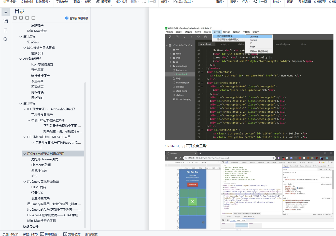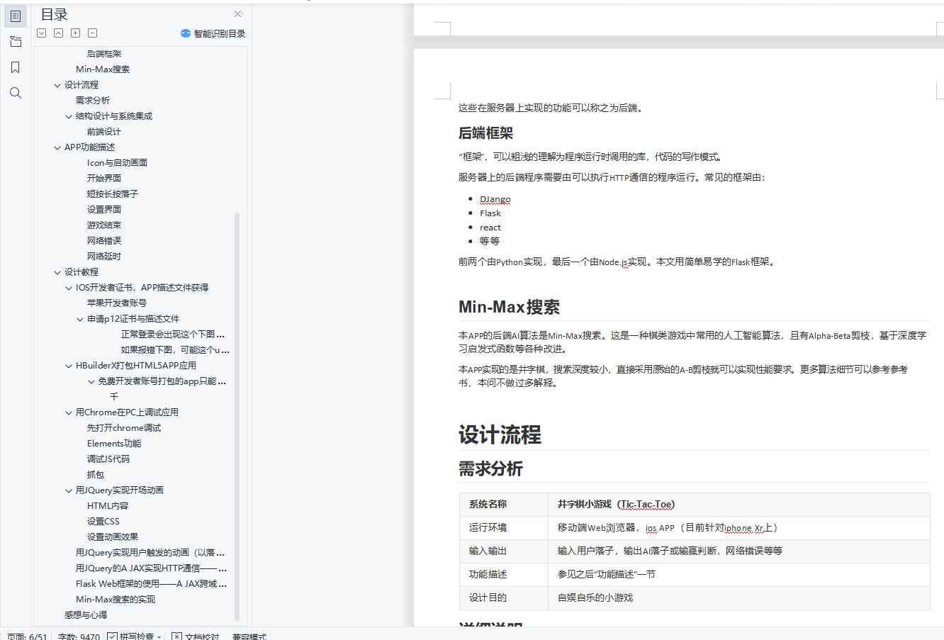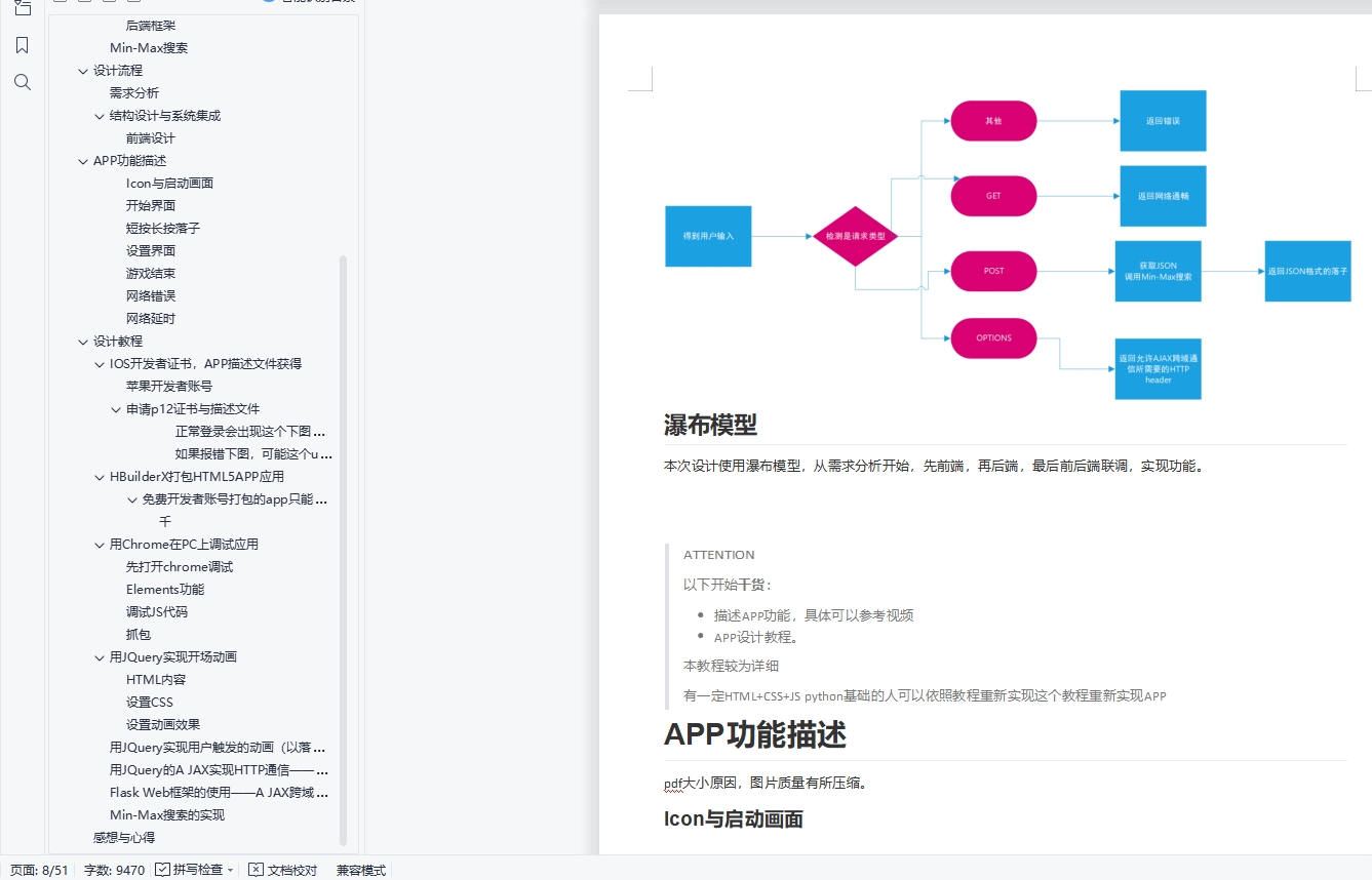 关键词: Flask HTML5 CSS Javascript Max-Min Search AI摘要本次嵌入式作业,完成了井字棋HTML5 APP小游戏的开发,并实现了真机调试,真机安装。本APP前端借助HTML5+CSS+JavaScript,并采用了jQuery框架。前端实现了及其细腻的动画,赏心悦目的用户界面,以及良好的异步操作性能。游戏中与人对战的AI使用Min-Max搜索,由运行在阿里云服务器上的python程序实现。前后端通信采用了现代的 A JAX CROD(ajax跨域)通信技术,利用HTTP协议将json格式的数据在前后端POST。利用Min-Max搜索的深度,可以调节难度。实验中AI通信良好,一定难度下可以实现保证和棋或赢棋。本实验利用HBuilderX, appUploader实现了IOS上APP真机联调与开发者协议下APP的安装。本教程的脱水版即将发布CSDN与Github上的个人博客。目录基于jQuery与Flask前后端框架,借助A JAX跨域通信技术的人工智能井字棋小游戏 HTML5 APP 的开发目录基本概念HTML5 APPHTML5历史HTML5的新特性HTML5与FlashFlash将退出历史舞台HTML5的优势利用HTML5开发APP的优势成本比较难度比较市场推广比较前端与后端前端后端后端框架Min-Max搜索设计流程需求分析详细说明结构设计与系统集成前端设计后端设计瀑布模型APP功能描述Icon与启动画面开始界面短按长按落子设置界面游戏结束网络错误网络延时设计教程IOS开发者证书,APP描述文件获得苹果开发者账号申请p12证书与描述文件三、申请ios描述文件(mobileprovision)HBuilderX打包HTML5APP应用免费开发者账号打包的app只能通过爱思助手安装! 用Chrome在PC上调试应用先打开chrome调试Elements功能调试JS代码抓包用JQuery实现开场动画HTML内容设置CSS设置动画效果用JQuery实现用户触发的动画(以落子为例)用JQuery的A JAX实现HTTP通信――在保持异步回调的前提下保证通信结果获得处理Flask Web框架的使用――A JAX跨域通信JSON需要的特殊处理Min-Max搜索的实现感想与心得