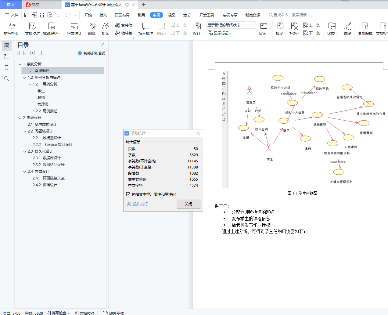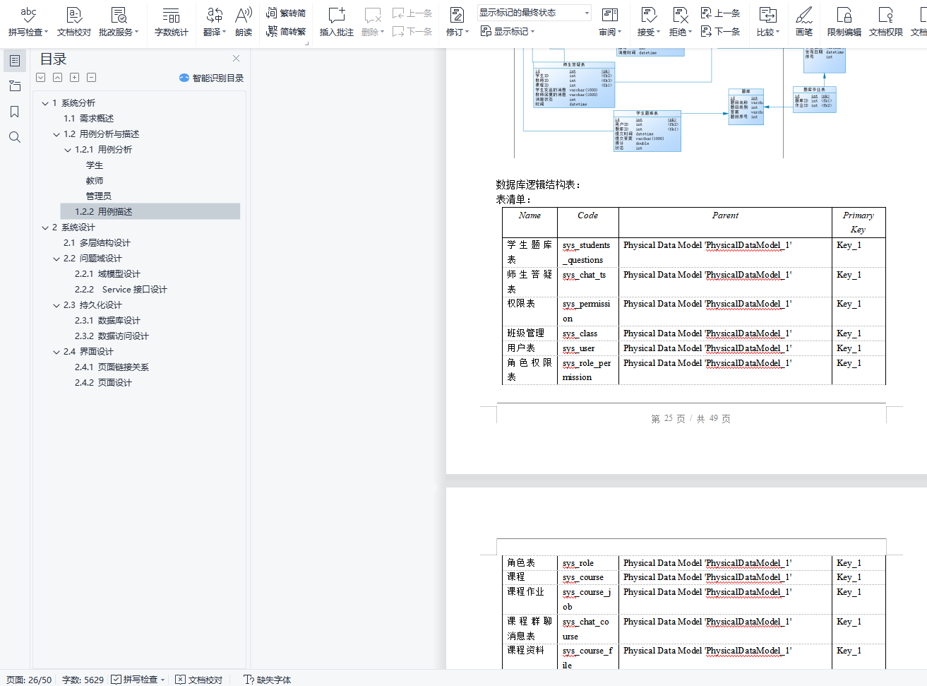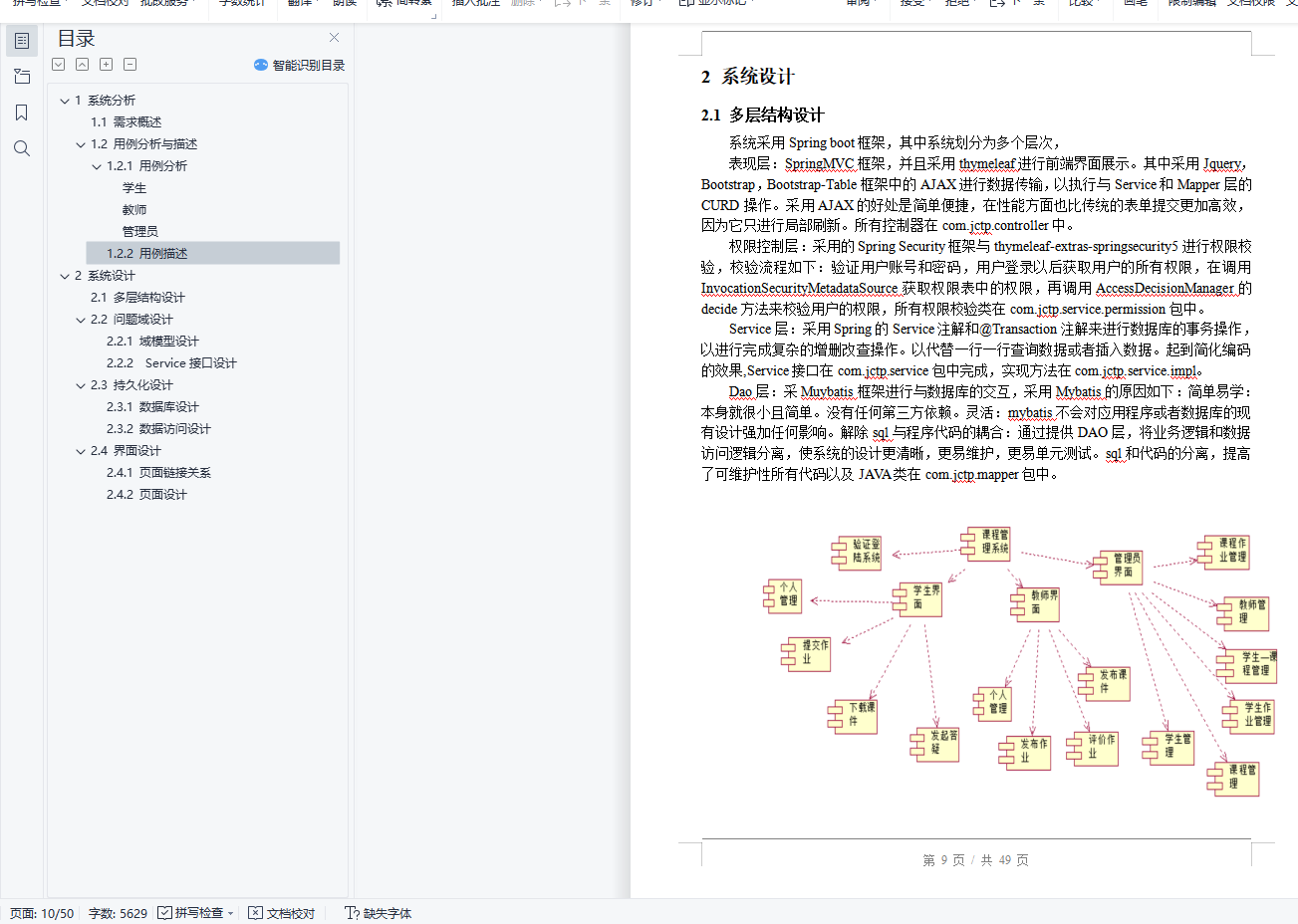 目录1 系统分析 11.1 需求概述 11.2 用例分析与描述 11.2.1 用例分析 11.2.2 用例描述 52 系统设计 82.1 多层结构设计 92.2 问题域设计 102.2.1 域模型设计 102.2.2 Service接口设计 102.3 持久化设计 252.3.1 数据库设计 252.3.2 数据访问设计 312.4 界面设计 322.4.1 页面链接关系 322.4.2 页面设计 381 系统分析1.1 需求概述设计此系统的目的在于为教师和学生提供一个交互的平台,相对于传统的教学方式,该系统为师生提供线上的教学演示,同时可以发布作业,练习,资料等。传统的教学方式需要学生教师面对面教学,而该平台可以提供师生线上点对点进行教学,不限任何时间,任何地点。同时传统的教学方式批改作业时需要手动批改,该平台提供自动评分机制,对:选择题,填空题,判断题,编程题自动评分,而对于简答题还是需要自己手动评分。这极大节约了教师的时间,除此之外,还提供数据分析,学生成绩统计,平均分,知识点掌握程度雷达图等。该系统还可以上传各种教学资料,如实验资料,课程PPT,教学资料等。系统提供师生答疑功能,学生可以在线咨询学习中遇到的各种问题,也可以在课程讨论组中进行交流。同时系统保证数据的安全性。1.2 用例分析与描述1.2.1 用例分析本系统主要有学生,教师,管理员,系主任这四个角色。学生登陆教学平台修改个人介绍修改密码找回密码注册账号注销自己的账号选择自己所学的课程提交老师发布的作业查看老师批改的情况下载老师发布的资料下载学习课件查看通知通过上述分析,可得到学生的用例图如下: