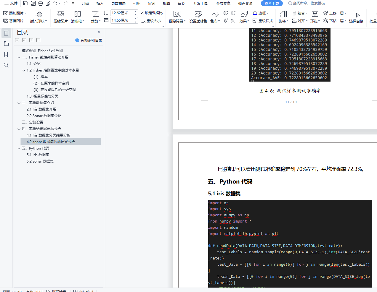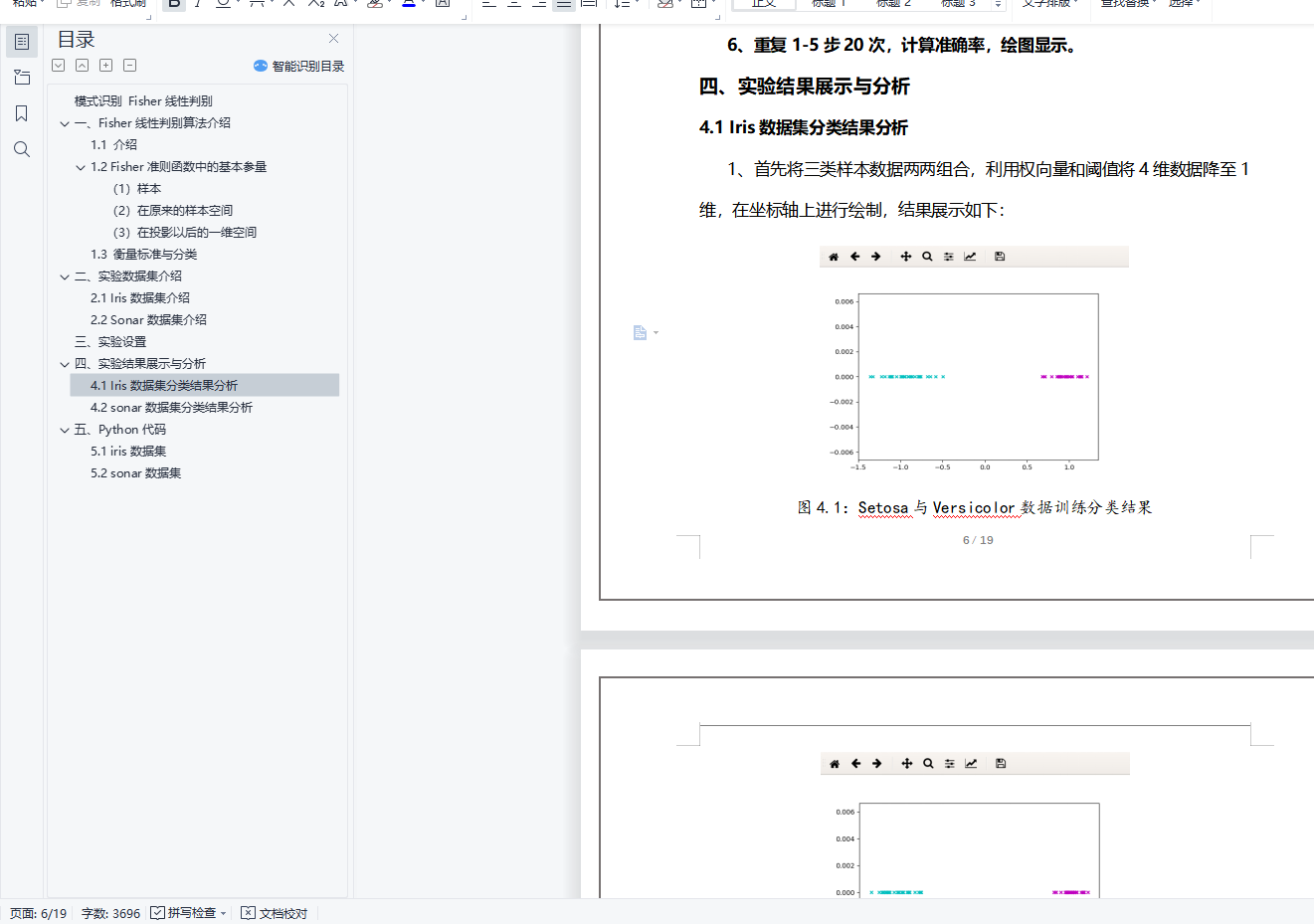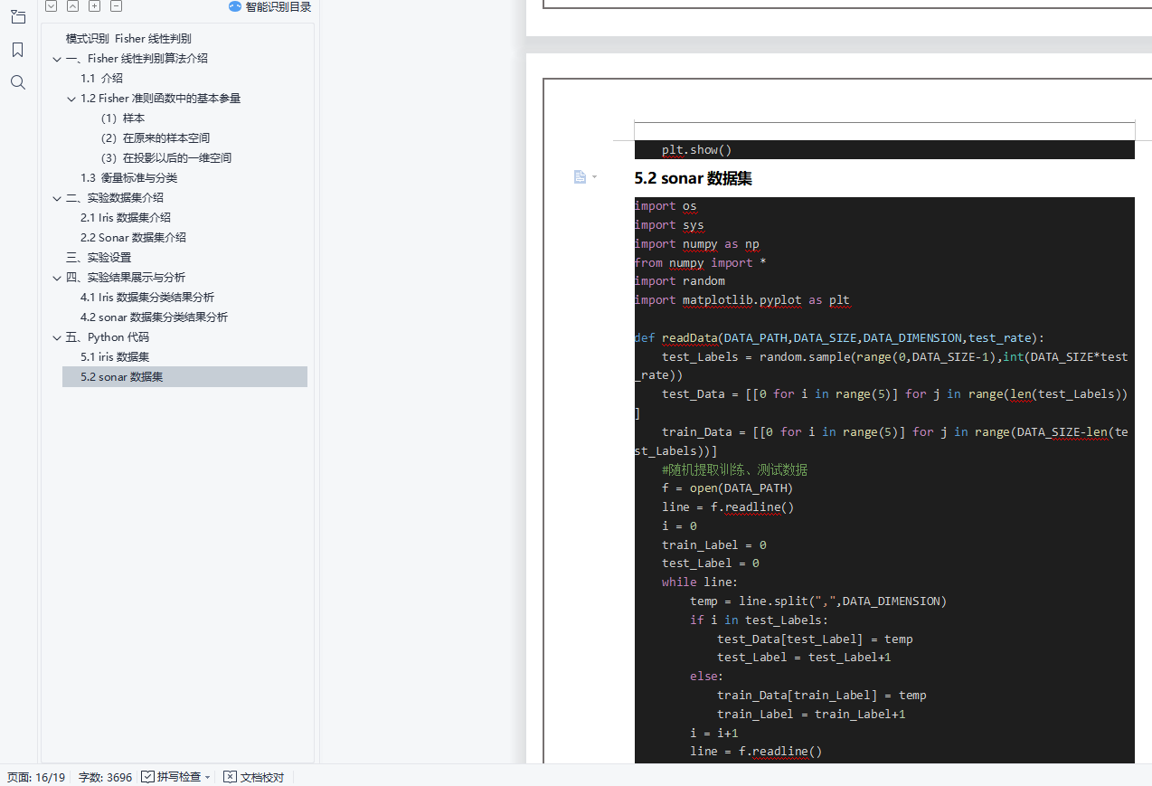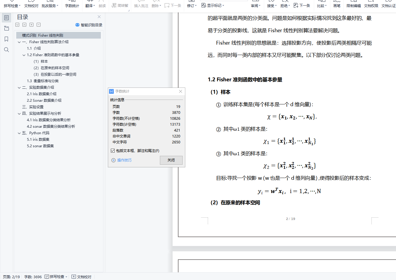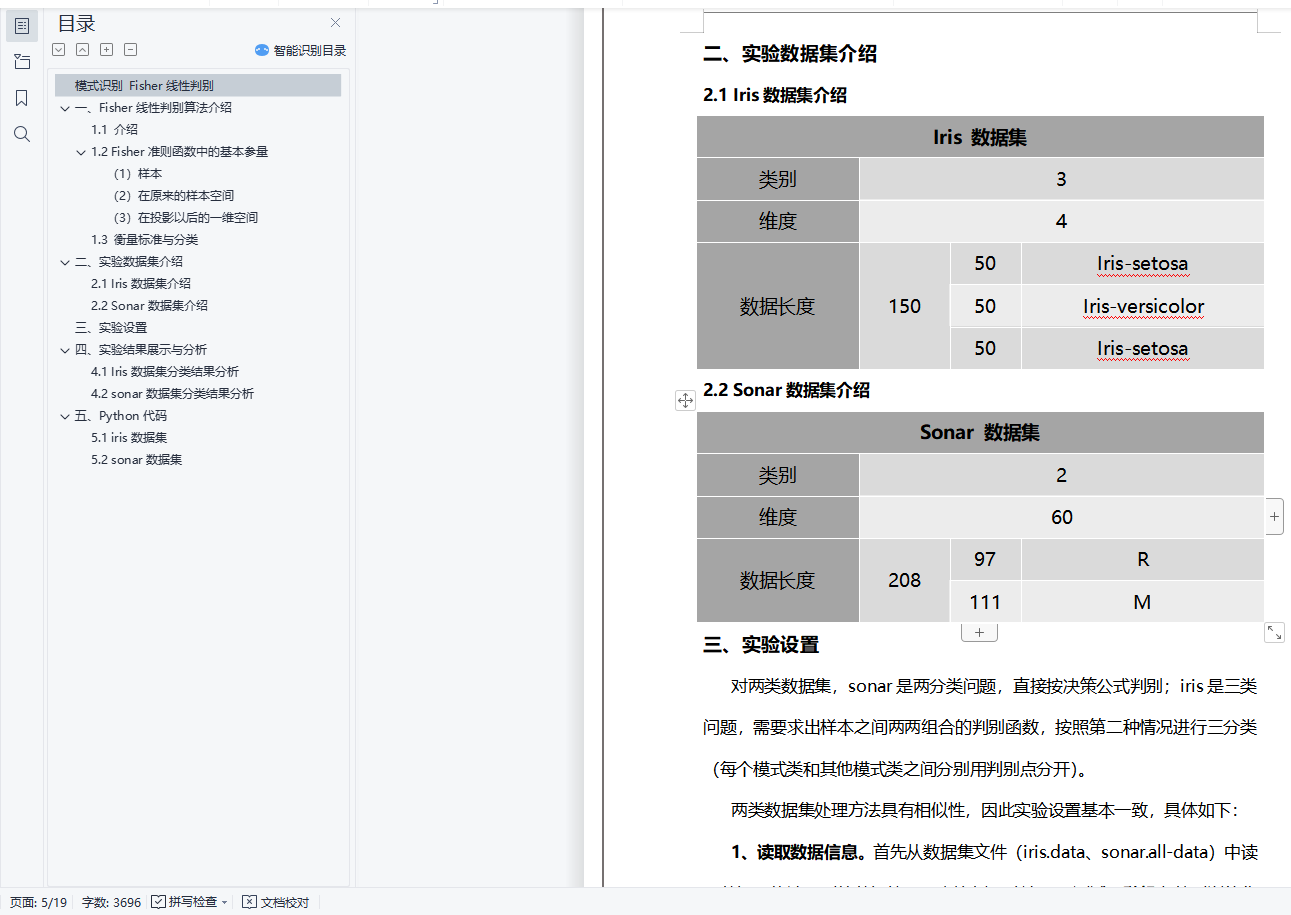 模式识别 Fisher线性判别目录模式识别 Fisher线性判别 1一、Fisher线性判别算法介绍 21.1 介绍 21.2 Fisher准则函数中的基本参量 2(1)样本 2(2)在原来的样本空间 2(3)在投影以后的一维空间 31.3 衡量标准与分类 3二、实验数据集介绍 42.1 Iris数据集介绍 52.2 Sonar数据集介绍 5三、实验设置 5四、实验结果展示与分析 74.1 Iris数据集分类结果分析 74.2 sonar数据集分类结果分析 12五、Python代码 145.1 iris数据集 145.2 sonar数据集 18一、Fisher线性判别算法介绍1.1 介绍Fisher两类的判别问题可以看作是把所有样本都投影到一个方向上,然后在这个一维空间中确定一个分类的阈值。过这个阈值点且与投影方向垂直的超平面就是两类的分类面。问题是如何根据实际情况找到这条最好的、最易于分类的投影线,这就是Fisher线性判别算法要解决问题。Fisher线性判别的思想就是:选择投影方向,使投影后两类相隔尽可能远,而同时每一类内部的样本又尽可能聚集。以下部分仅讨论两类问题。
