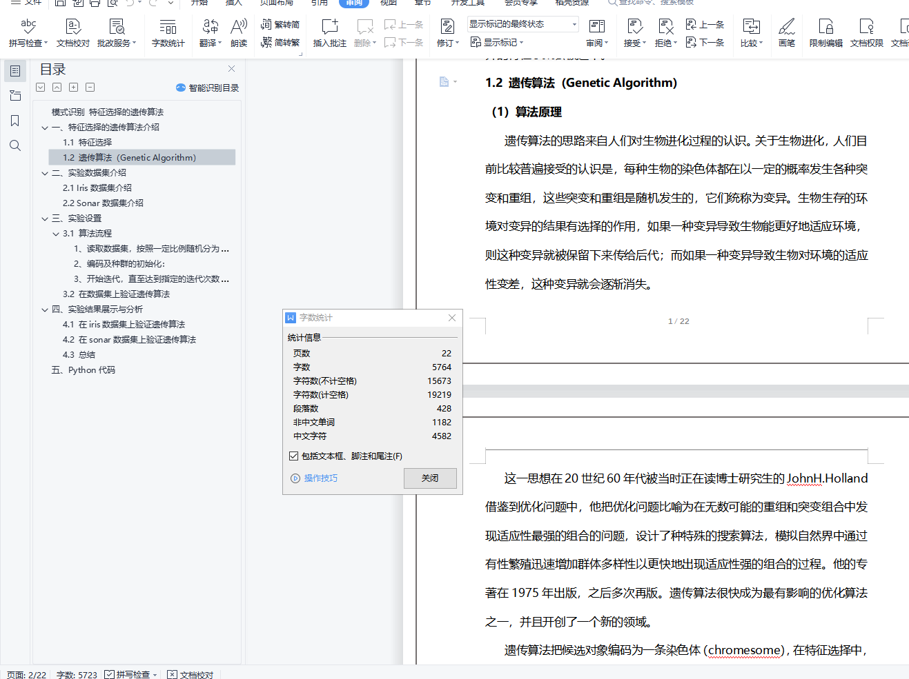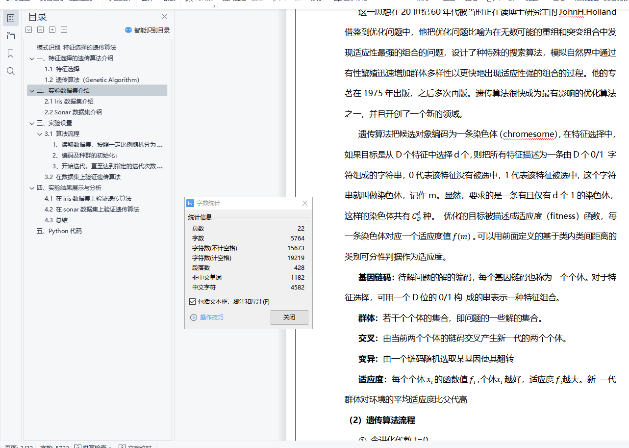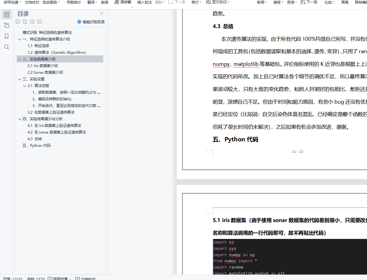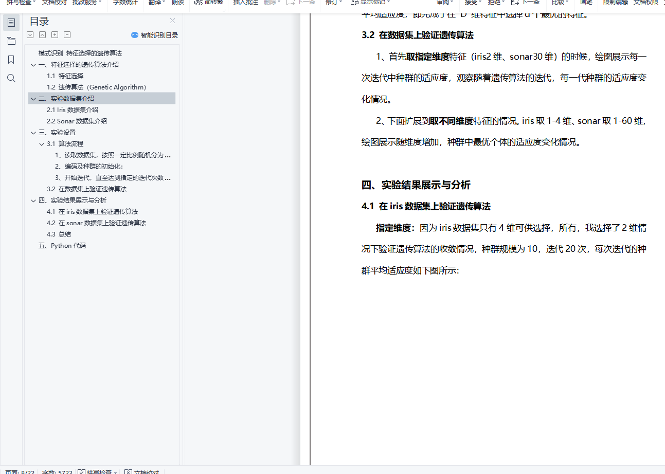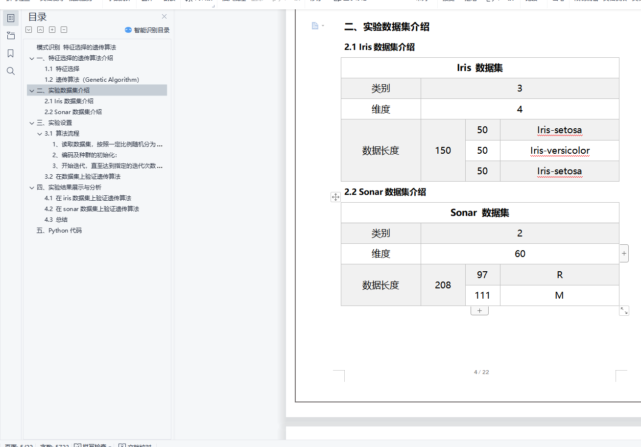 模式识别 特征选择的遗传算法目录模式识别 特征选择的遗传算法 0一、特征选择的遗传算法介绍 11.1 特征选择 11.2 遗传算法(Genetic Algorithm) 1二、实验数据集介绍 42.1 Iris数据集介绍 42.2 Sonar数据集介绍 4三、实验设置 43.1 算法流程 41、读取数据集,按照一定比例随机分为测试集、训练集 52、编码及种群的初始化: 53、开始迭代,直至达到指定的迭代次数: 53.2 在数据集上验证遗传算法 6四、实验结果展示与分析 74.1 在iris数据集上验证遗传算法 74.2 在sonar数据集上验证遗传算法 84.3 总结 10五、Python代码 10一、特征选择的遗传算法介绍1.1 特征选择特征选择在概念上十分简单,即对原有特征进行删选优化。特征选择就是从原始特征中挑选出一些最有代表性、分类性能最好的特征进行分类。特征选择要解决两个问题:如何确定选择的标准,如可分离性判据;如何构建快速寻优算法。特征选择根据是否直接考虑分类器性能可以分为两种方法:Filter方法:根据独立于分类器的指标J来评价所选择的特征子集S,在所有可能的特征子集中搜索出使得J最大的特征子集作为最优特征子集。 不考虑所使用的学习算法。Wrapper方法:将特征选择和分类器结合在一起,在分类过程中表现优异的特征子集会被选中。