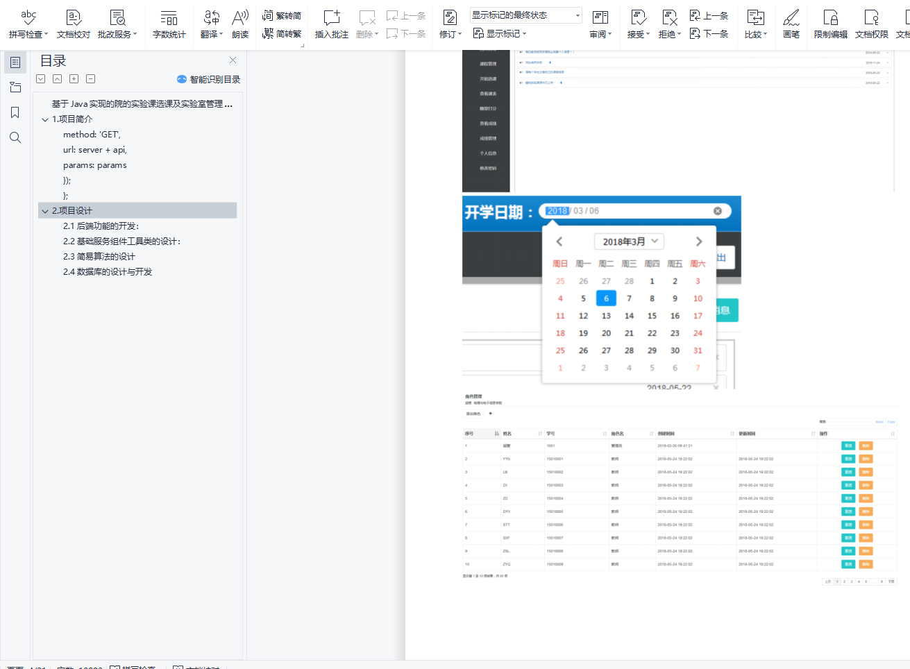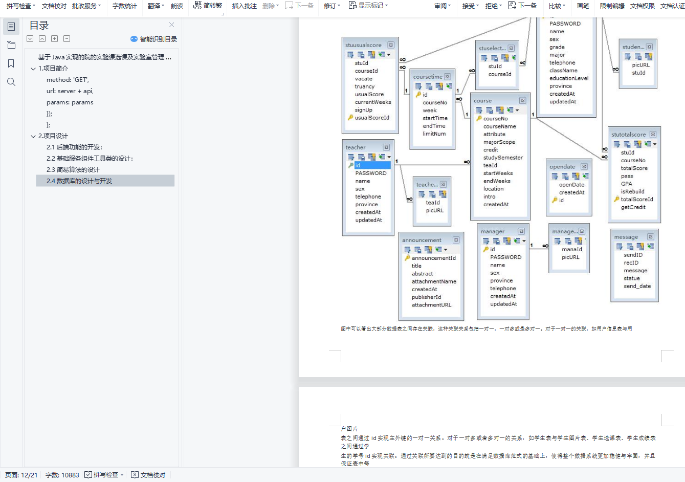 基于Java实现的院的实验课选课及实验室管理系统目录基于Java实现的院的实验课选课及实验室管理系统 11.项目简介 1method: 'GET', 2url: server + api, 2params: params 2}); 2}; 22.项目设计 32.1后端功能的开发: 32.2基础服务组件工具类的设计: 32.3简易算法的设计 32.4数据库的设计与开发 31.项目简介该项目设计是物电学院实验室选课系统的Web前后端设计,实现同学根据个人时间安排自主选课的功能,同时教师可以根据选课情况,进行管理,如某个时间段的实验课选课学生人数过少可以另外更改开课时间或者做其他修改,这样为教师和学生都带来很大的便利,同时系统还需要实现平台化打分,如为每个学生打总成绩时,平台会为教师提供参考成绩以及平时课堂情况,代替以往的手写填表式打分。另外平台更加的自动化,如随堂打分,系统会自动的根据时间去进行判断,筛选出当前实验课信息以及学生信息。平台在为教师和学生带来便利的同时,还为管理员提供了更大的权限,查看课程信息,成绩,学生选课情况等,使得管理员在第一时间可以清楚学院的课程管理情况,同时系统还增加了实验室管理的功能,管理员在拥有更高权限的同时,可以起到更好的管理作用,为学院管理做出贡献。而课题设计正是为实现这些功能以解决问题,同时保证系统可靠运行而进行的。