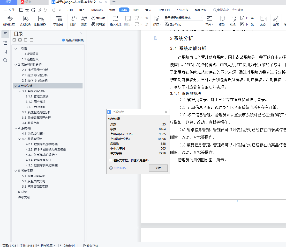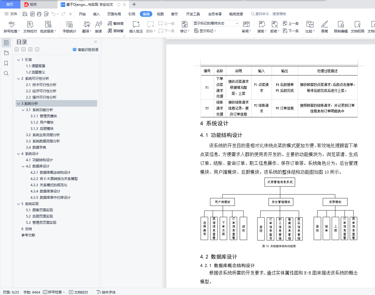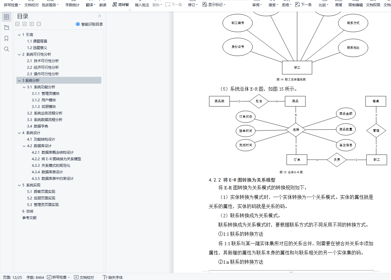 目 录1 引言 11.1课题背景 11.2选题意义 12 系统可行性分析 12.1 技术可行性分析 12.2 经济可行性分析 12.3 操作可行性分析 23系统分析 23.1 系统功能分析 23.1.1 管理员模块 23.1.2 用户模块 33.1.3 后厨模块 43.2 系统业务流程分析 43.3 系统数据流程分析 53.4 数据字典 64 系统设计 94.1 功能结构设计 94.2 数据库设计 94.2.1 数据库概念结构设计 94.2.2 将E-R图转换为关系模型 114.3.3 关系模式的规范化 124.3.4 数据库表设计 134.3.5 数据库表中约束设计 155 系统实现 165.1 顾客页面实现 165.2 后厨页面实现 185.3 管理员页面实现 196 总结 22参考文献 24点菜信息管理系统的设计与实现1 引言1.1课题背景现代社会,美食是每个人不可缺少的一部分,现如今,越来越多的人选择去知名的餐厅品尝美食,然而,在这些的知名的餐厅中,由于人的数量太多,所以导致餐厅做菜、上菜不及时,甚至有些客人看见如此庞大的人群堆积在餐厅中,只能对美食望而却步,所以,提升做菜、上菜的效率变的越来越重要。因此,一套高效率的流程标准是解决问题的关键。开发一个基于数据库点菜信息管理系统成为餐厅提高做菜、上菜的效率、接待更多的顾客不可或缺的组成部分。