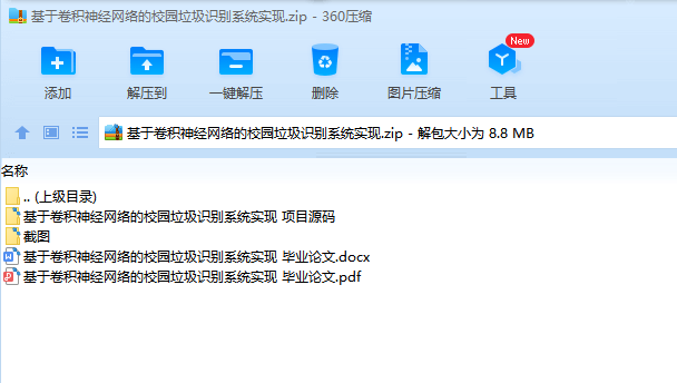 基于卷积神经网络的校园垃圾识别系统实现目录目录1 需求分析 2 13 详细设计 4 25 总结提高 8 41 需求分析 41.1 功能需求 41.1.1 基本功能 41.1.2 扩展功能 41.2 数据需求 41.2.1 C/S架构客户端数据需求 41.2.2 C/S架构服务器数据需求 41.2.3 B/S架构浏览器数据需求 41.3 界面需求 51.3.1 C/S架构客户端界面需求 51.3.2 C/S架构服务器端界面需求 51.3.3 B/S架构浏览器界面需求 51.4 开发运行环境需求 51.4.1 客户端开发环境需求 51.4.2 客户端运行需求 51.4.3 服务器开发运行环境需求 61.4.4 其他环境需求 62 概要设计 62.1 主要数据结构 62.2 程序总体结构 73 详细设计 9议网络通信模块 11据库模块 134 测试 144.1 功能测试 144.2 边界测试 165 总结提高 175.1 课程设计总结 175.2 对本课程的意见与建议 18