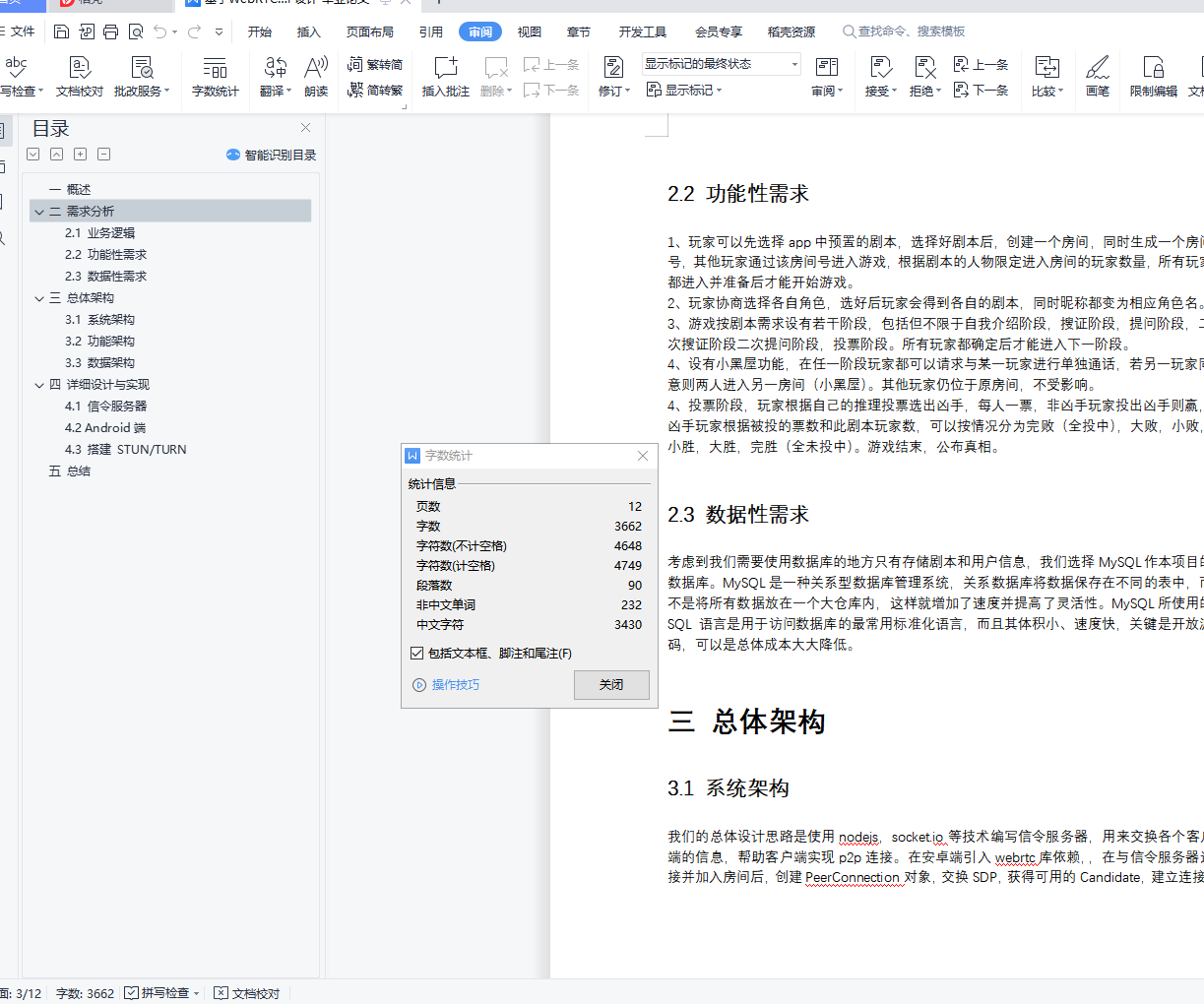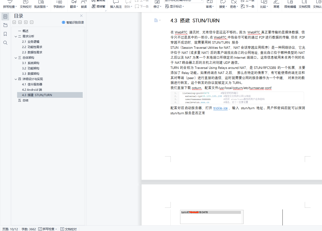 目录一 概述 2二 需求分析 22.1 业务逻辑 22.2 功能性需求 32.3 数据性需求 3三 总体架构 33.1 系统架构 33.2 功能架构 43.3 数据架构 5四 详细设计与实现 54.1 信令服务器 54.2 Android端 74.3 搭建 STUN/TURN 10五 总结 11一 概述随着移动端的不断发展,由谷歌公司和开放手机联盟领导和开发的安卓系统占据着绝大多数的市场份额,移动端的便捷性使安卓应用软件呈井喷式增长。WebRTC被誉为是web长期开源开发的一个新启元,是近年来web开发的最重要创新。WebRTC允许Web开发者在其web应用中添加视频聊天或者点对点数据传输,不需要复杂的代码或者昂贵的配置,目前支持Chrome、Firefox和Opera,相信后续会支持更多的浏览器,目前它有能力支持数十亿的设备在线。然而,WebRTC一直被误解为仅适合于浏览器。事实上,WebRTC最重要的一个特征是允许本地和web应用间的互操作,所以我们可以在自己的Android应用中植入WebRTC,使用 WebRTC Initiative 中提供的本地库。在新冠疫情席卷全球的情况下,很多人出行受限,不仅影响上班上学等公事,也限制了亲朋好友之间的交流聚会,影响亲友同学关系。在这个背景下,我们提出此次选题,计划结合所学知识,将webrtc运用在安卓开发上,开发出一款能实时音视频通话的剧本杀APP,使玩家在家中就可以与朋友来一局悬疑又刺激的剧本杀。