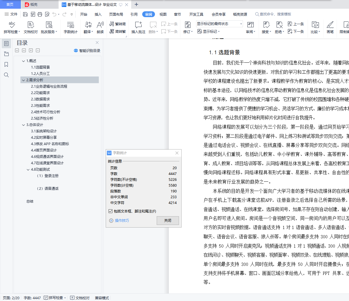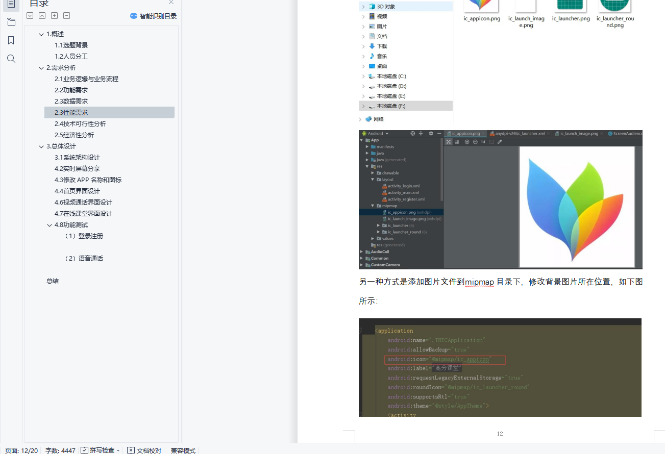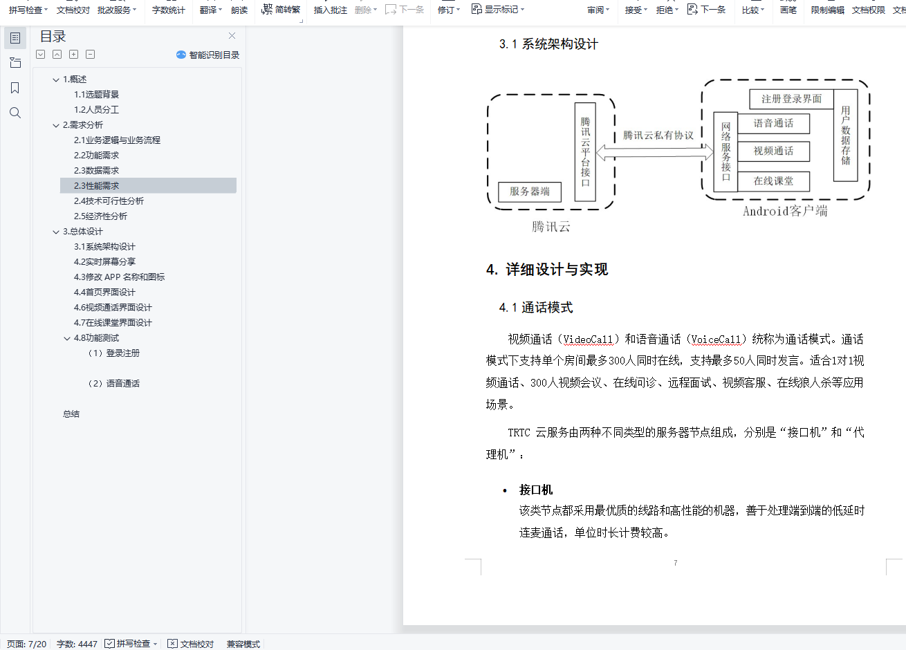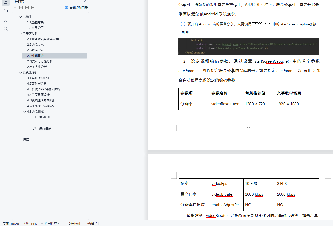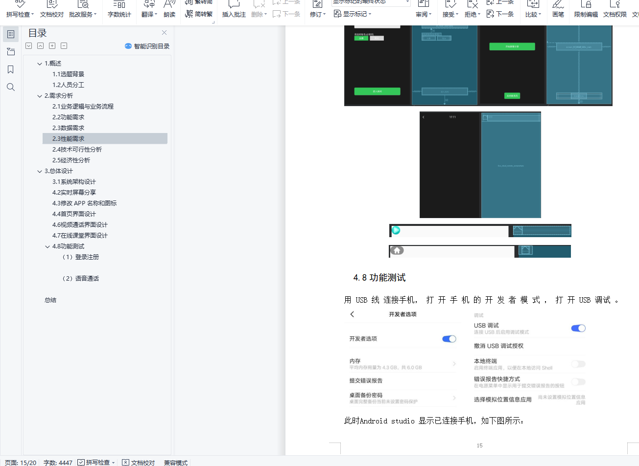 目录1. 概述 11.1 选题背景 11.2 人员分工 22. 需求分析 32.1 业务逻辑与业务流程 32.2 功能需求 32.3 数据需求 42.3 性能需求 42.4 技术可行性分析 52.5 经济性分析 63. 总体设计 73.1 系统架构设计 74.2 实时屏幕分享 104.3 修改 APP 名称和图标 124.4 首页界面设计 144.6 视频通话界面设计 154.7 在线课堂界面设计 154.8 功能测试 161.概述1.1选题背景目前,我们处于一个崇尚科技与知识的信息化社会。近年来,随着网络技术的快速发展与文化知识的快速更新,对我们的学习和工作都提出了更高的要求, 对学校的课程建设也提出了新要求。课程教学作为教育的核心,是实现人才培养目标的基本途径,以网络技术的信息化带动教育的信息化是信息化社会发展的必然趋势。近年来,网络教学的热度只增不减,它打破了传统的校园围墙和各种硬件措施的束缚,为学习者提供了便捷的学习机会、灵活学习的方式、廉价的学习成本和丰富的学习资源,也让我们更好地利用碎片化时间进行自我提升。网络课程的发展可以划分为三个阶段,第一阶段是,通过网页给学习者提供学习资料;第二阶段是通过电子邮件、网上练习和测试等异步双向交流;第三阶段是通过电话会议、视频会议、在线直播、屏幕分享等同步双向交流。网络课程越来越受到人们重视,包括幼儿教育、中小学教育、课外辅导、高等教育、职业教育、成人教育、项目培训等等。从网络课程总体发展上来看,各高校教育工作也慢慢向网络课程迁移。网络课程具有形式丰富、易更新、共享性、自由性的特点,是未来教育行业发展的趋势之一。