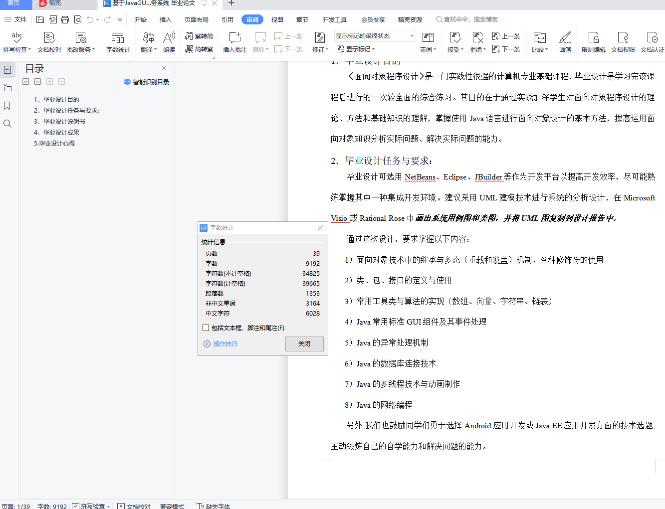 目录1.毕业设计目的 12.毕业设计任务与要求: 13.毕业设计说明书 34.毕业设计成果 115.毕业设计心得 381.毕业设计目的《面向对象程序设计》是一门实践性很强的计算机专业基础课程,毕业设计是学习完该课程后进行的一次较全面的综合练习。其目的在于通过实践加深学生对面向对象程序设计的理论、方法和基础知识的理解,掌握使用Java语言进行面向对象设计的基本方法,提高运用面向对象知识分析实际问题、解决实际问题的能力。2.毕业设计任务与要求:毕业设计可选用NetBeans、Eclipse、JBuilder等作为开发平台以提高开发效率,尽可能熟练掌握其中一种集成开发环境。建议采用UML建模技术进行系统的分析设计,在Microsoft Visio或Rational Rose中画出系统用例图和类图,并将UML图复制到设计报告中。