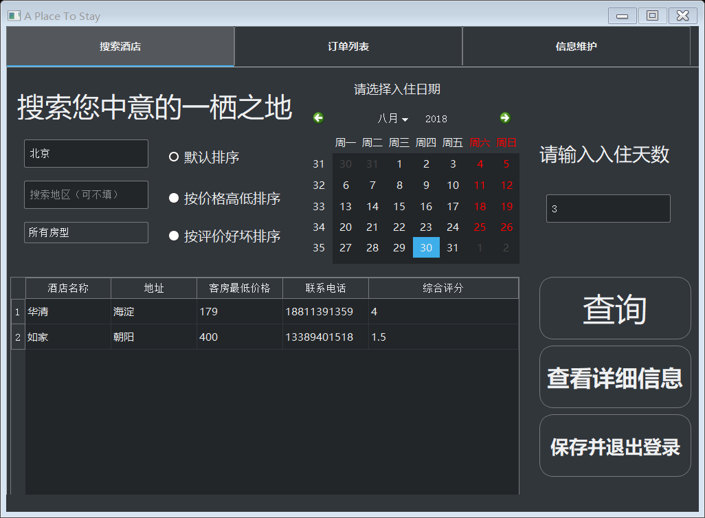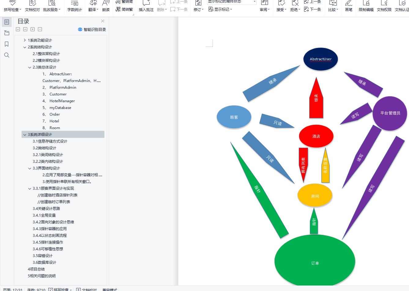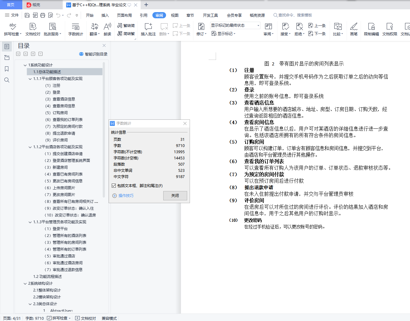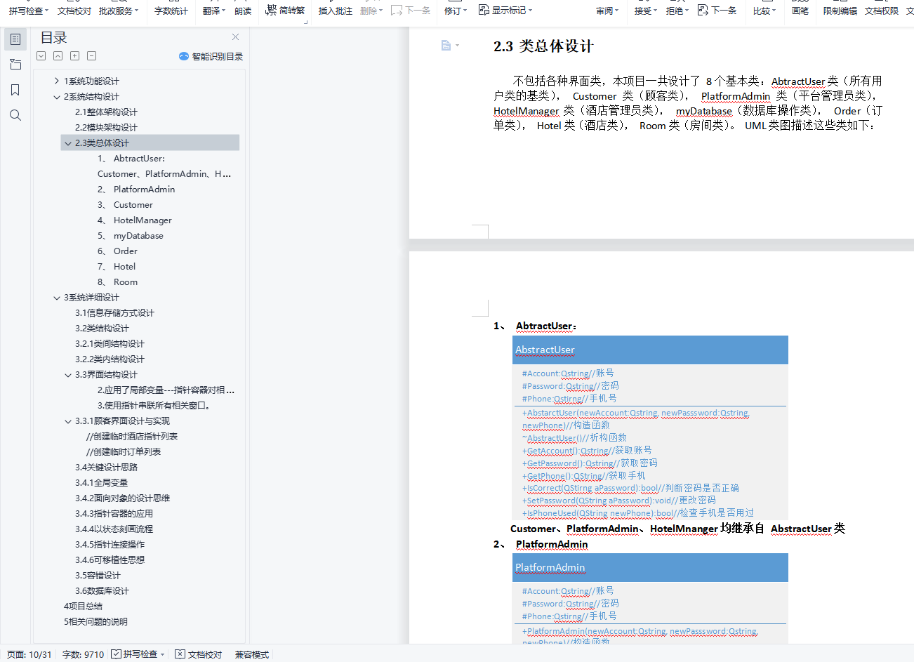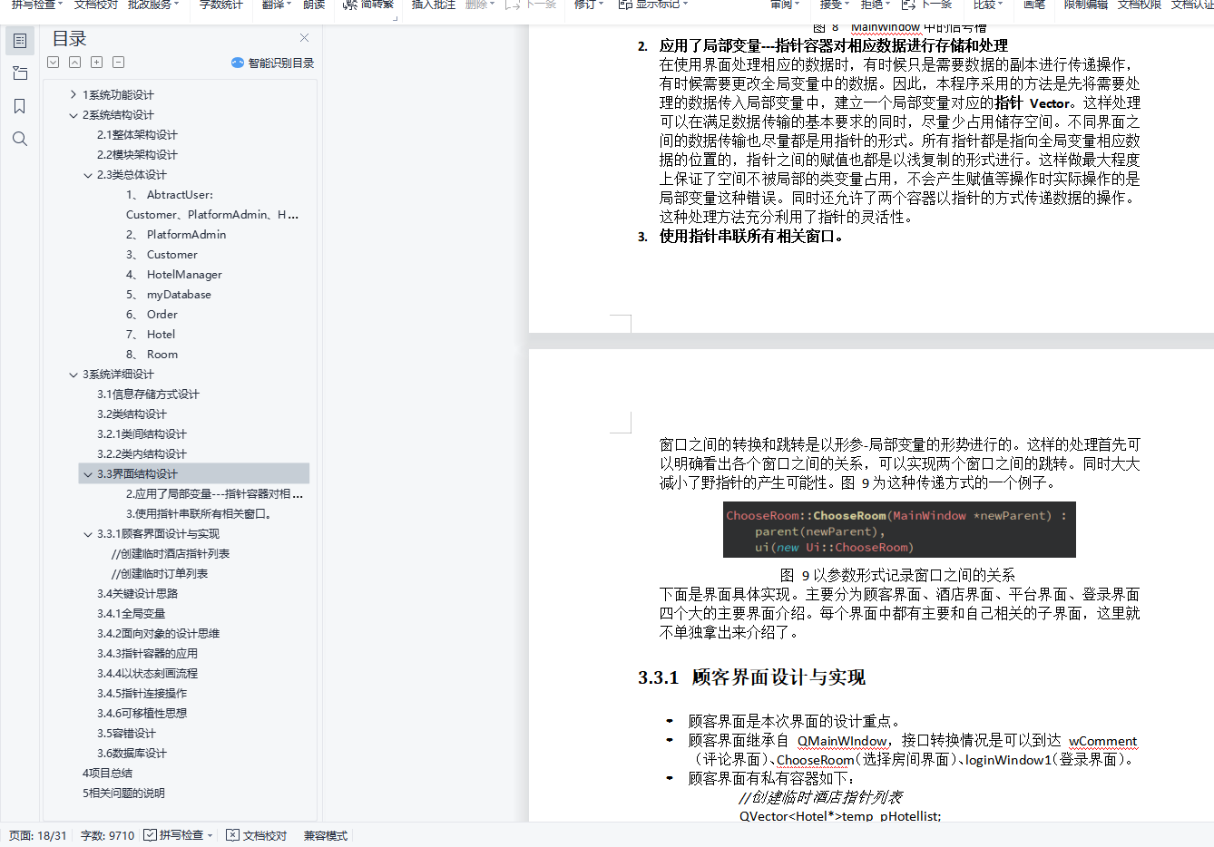 目 录1系统功能设计 31.1总体功能描述 31.1.1平台顾客各项功能及实现 41.1.2平台酒店各项功能及实现 61.1.3平台管理员各项功能及实现 81.2 功能流程描述 92系统结构设计 112.1整体架构设计 112.2模块架构设计 112.3类总体设计 113系统详细设计 173.1信息存储方式设计 173.2类结构设计 173.2.1类间结构设计 173.2.2类内结构设计 183.3界面结构设计 193.3.1顾客界面设计与实现 203.3.2酒店界面设计与实现 223.3.3平台管理界面设计与实现 243.3.4登录及注册界面设计与实现 253.4关键设计思路 273.4.1全局变量 273.4.2面向对象的设计思维 273.4.3指针容器的应用 283.4.4以状态刻画流程 283.4.5指针连接操作 283.4.6可移植性思想 283.5容错设计 283.6数据库设计 294项目总结 305相关问题的说明 321系统功能设计在科技日益发展的今天,许多的传统服务业都面临产业结构的转型和面对新市场的自我改变。其中,服务业面对的挑战尤为严重。市场特点的变化、人们需求的增长、自身技术转型的需求等等,都是服务业在科技发展的浪潮中所面对的挑战。因此,如何提高顾客消费时的自主性,提高服务效率和质量,带给顾客更好的体验,成为商家的一个重要关注点。酒店预订是旅游出行的重要环节,然而当前酒店行业存在管理混乱、信息不够透明等诸多问题。另外,随着民宿不断火热,这一问题将会更加明显。建立一个有效的酒店信息管理平台,有助于规范酒店和民宿等的经营秩序,在给用户提供方便的同时,营造出各个酒店公平竞争、接受合理审核和信息公开的良好环境。其中,顾客和酒店在平台上交换必要的信息,由平台进行信息处理和传递,最后完成交易,起到了信息综合汇总、创造交易条件的作用。本项目参考携程网的结构,创造了一个模拟网上预订酒店的信息平台。本系统将采用单用户模拟多用户系统,是的不同用户登录时能够使用自己的功能并且查看其它用户发来的消息。一再实现以上几点要求,同时顾客在界面上做到美观简洁,以带给用户更好地订购体验。平台管理员界面做到简单明晰,已达到操作的效率和管理上的方便。