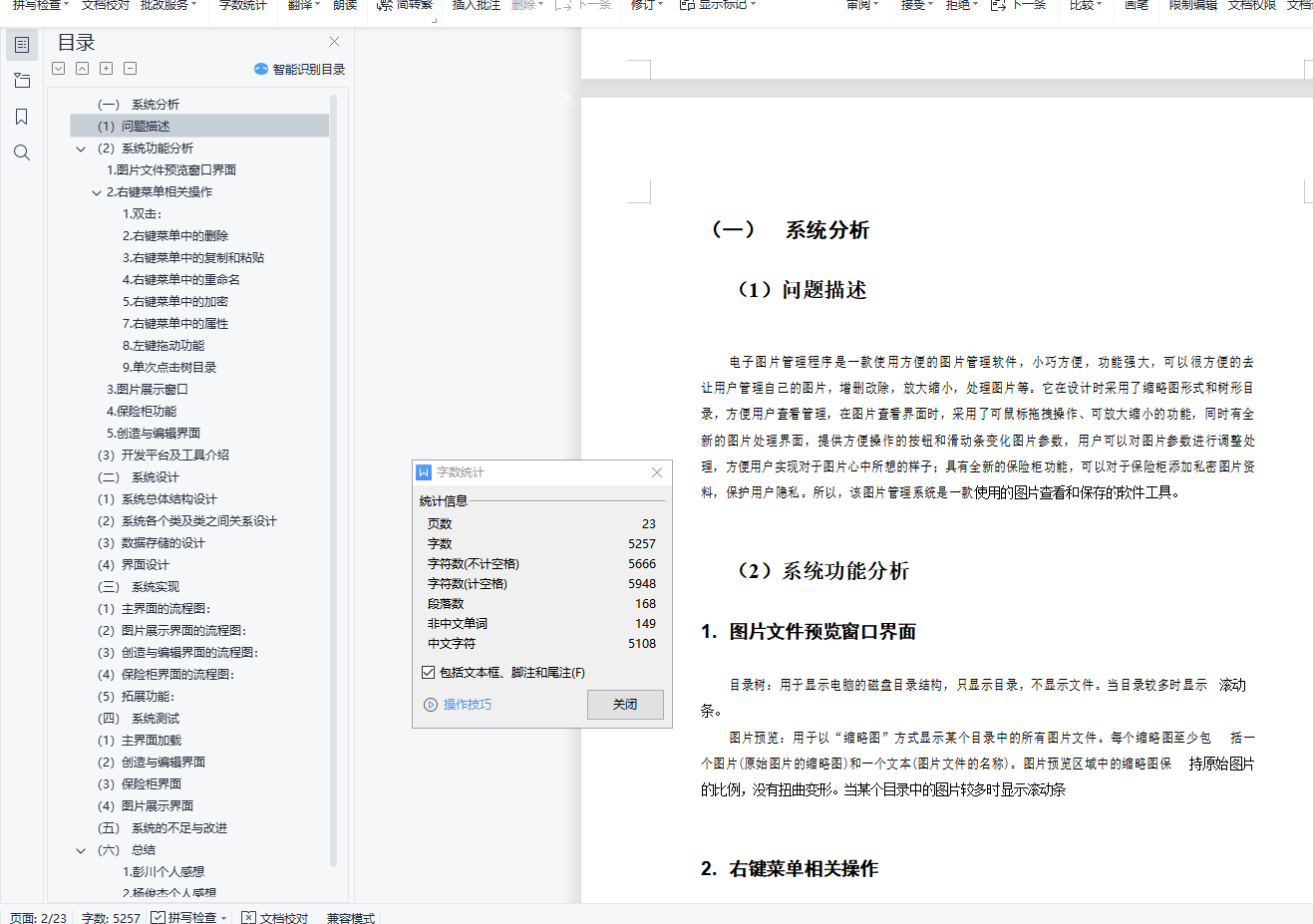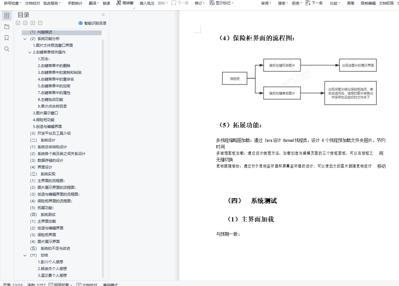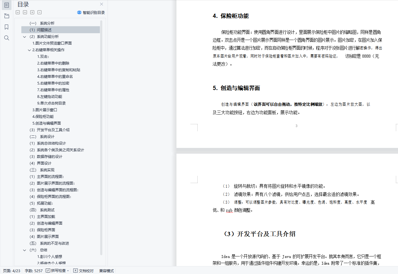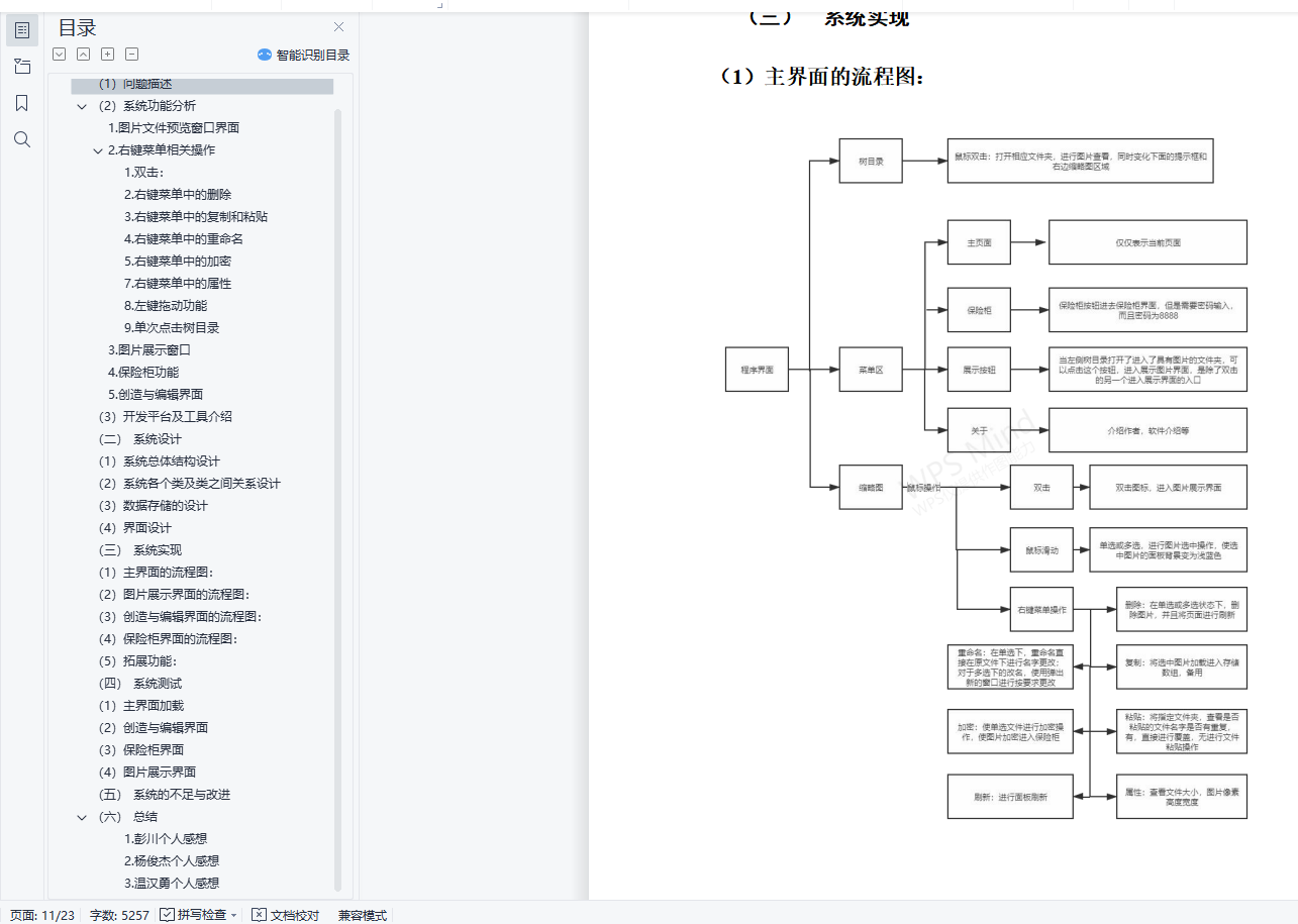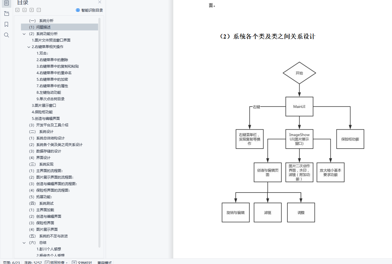 目录(一) 系统分析 1(1)问题描述 1(2)系统功能分析 1(3)开发平台及工具介绍 4(二) 系统设计 4(1)系统总体结构设计 4(2)系统各个类及类之间关系设计 5(3)数据存储的设计 6(4)界面设计 6(三) 系统实现 10(1)主界面的流程图: 10(2)图片展示界面的流程图: 11(3)创造与编辑界面的流程图: 11(4)保险柜界面的流程图: 12(5)拓展功能: 12(四) 系统测试 12(1)主界面加载 12(2)创造与编辑界面 14(3)保险柜界面 16(4)图片展示界面 18(五) 系统的不足与改进 20(六) 总结 211.彭川个人感想 212.杨俊杰个人感想 213.温汉勇个人感想 21(一) 系统分析(1)问题描述电子图片管理程序是一款使用方便的图片管理软件,小巧方便,功能强大,可以很方便的去让用户管理自己的图片,增删改除,放大缩小,处理图片等。它在设计时采用了缩略图形式和树形目录,方便用户查看管理,在图片查看界面时,采用了可鼠标拖拽操作、可放大缩小的功能,同时有全新的图片处理界面,提供方便操作的按钮和滑动条变化图片参数,用户可以对图片参数进行调整处理,方便用户实现对于图片心中所想的样子;具有全新的保险柜功能,可以对于保险柜添加私密图片资料,保护用户隐私。所以,该图片管理系统是一款使用的图片查看和保存的软件工具。