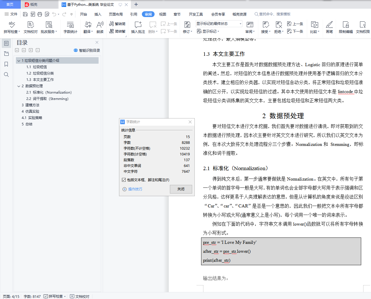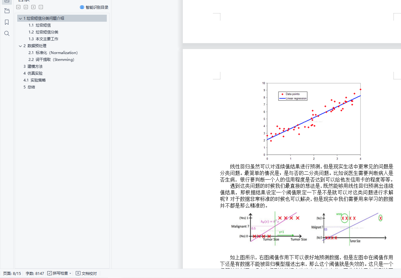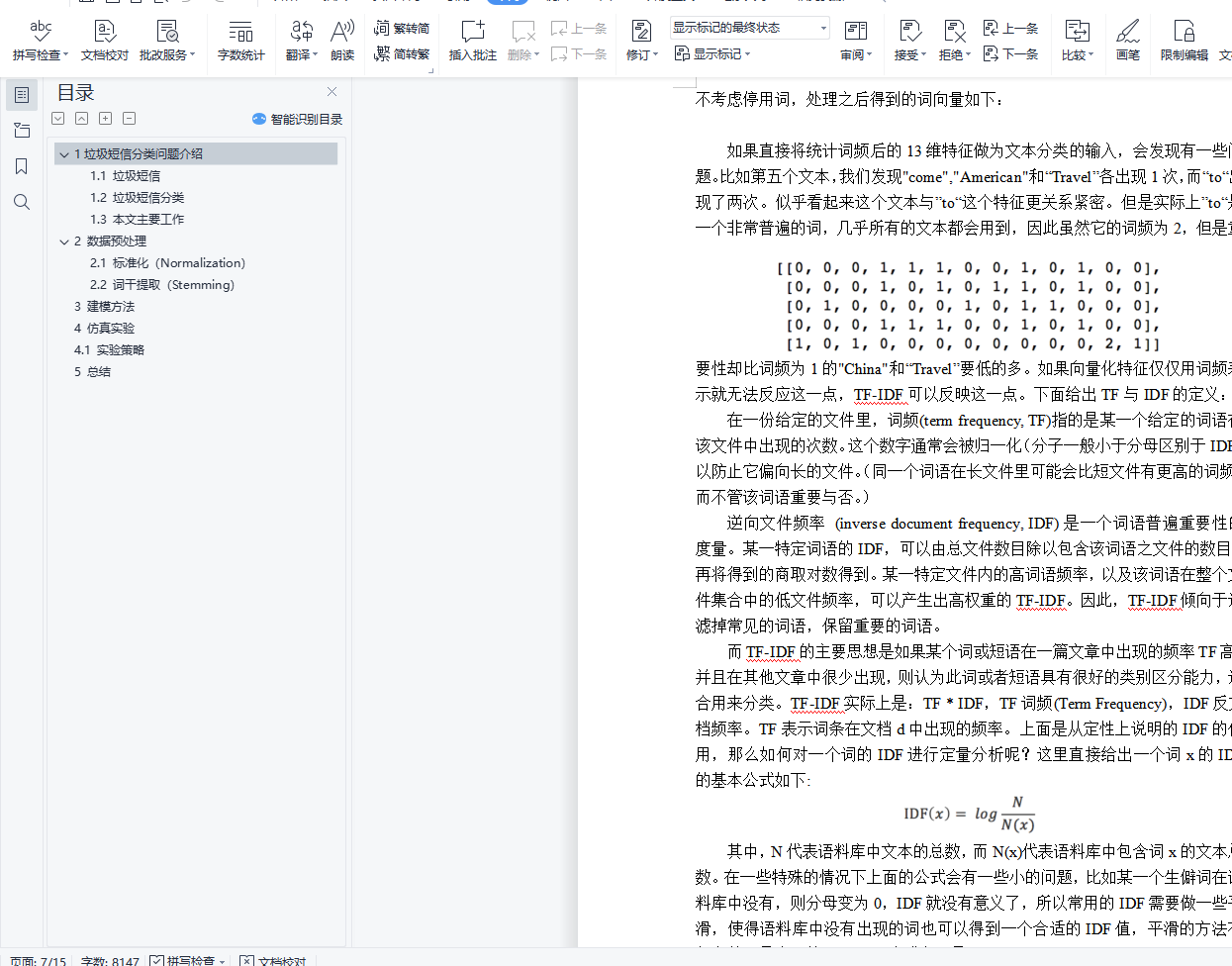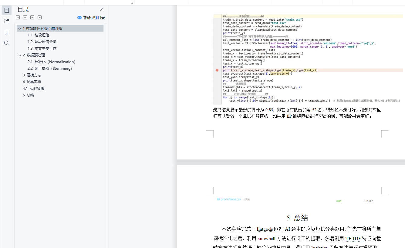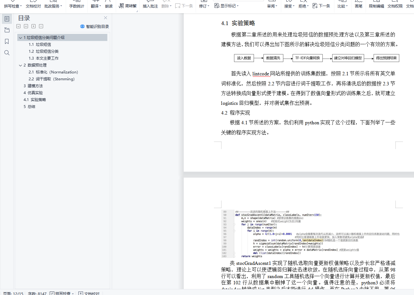 目录1垃圾短信分类问题介绍 11.1 垃圾短信 11.2 垃圾短信分类 21.3 本文主要工作 32 数据预处理 32.1 标准化(Normalization) 32.2 词干提取(Stemming) 43 建模方法 74 仿真实验 114.1 实验策略 115 总结 141垃圾短信分类问题介绍1.1 垃圾短信随着移动互联科技的高速发展,信息技术在不断改变着我们的生活,让我们的生活更方便,其中移动通信技术己经在我们生活起到至关重要的作用,与我们每个人人息息相关。短信作为移动通信的一个基础业务,由于简单方便而且廉价,在很久以前就己成为人们交流沟通的一种方式,得到人们的认同,成为人们生活中不可缺少的一部分,以短信拜年为例,2015年春节期间,全国短信发送量达到203.9亿条,2016年春节期间,全国短信发送量达到139.6亿条。从上述数据我们可以看出,随着科技的发展,短信可能会被其它社交方式代替,如微信、QQ等,但是我们发现它们之间区别并不大,所以研究垃圾短信的分类问题对研究其它社交方式垃圾信息自动识别具有同样意义。