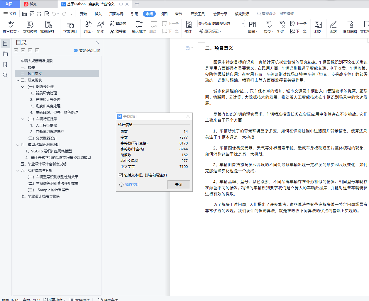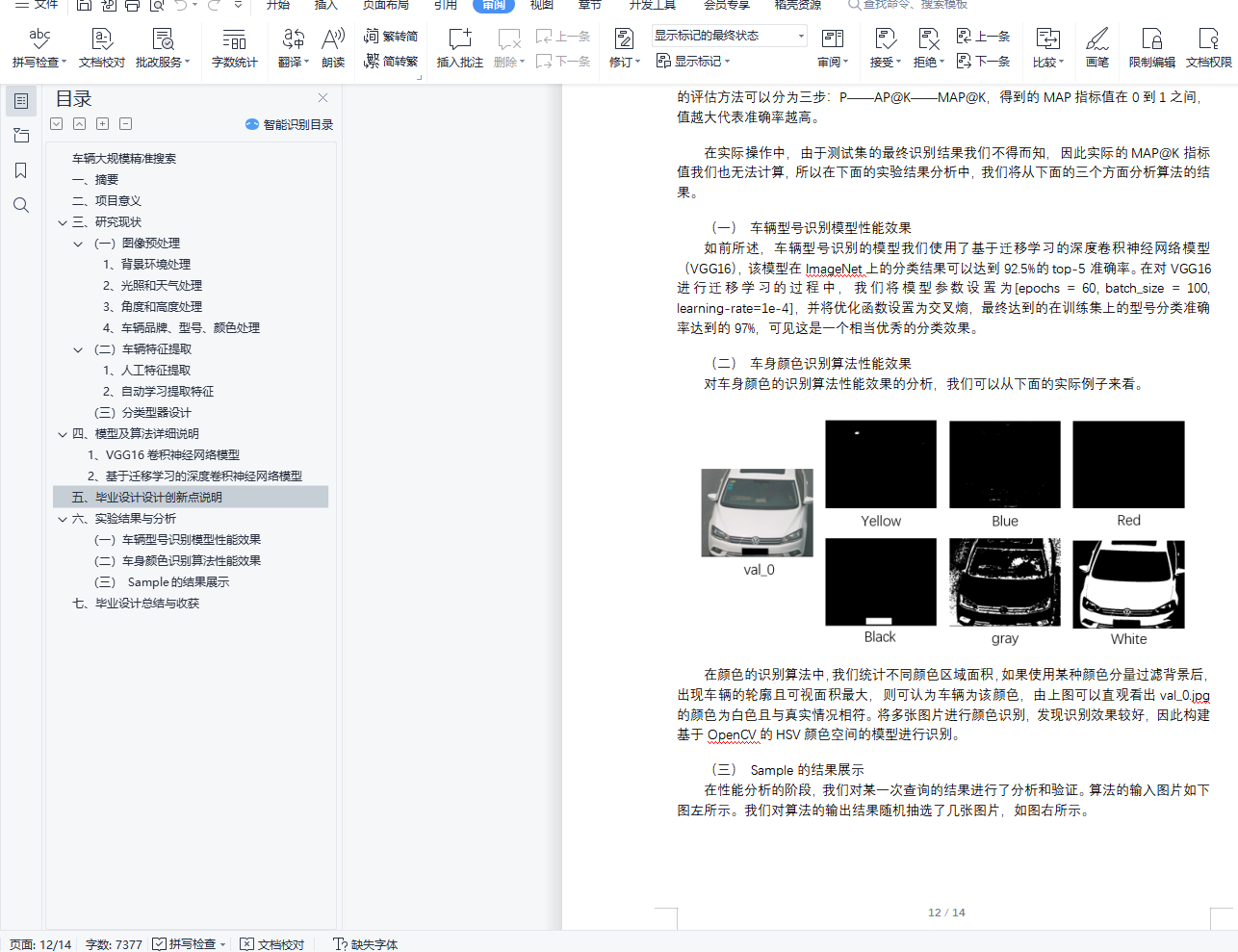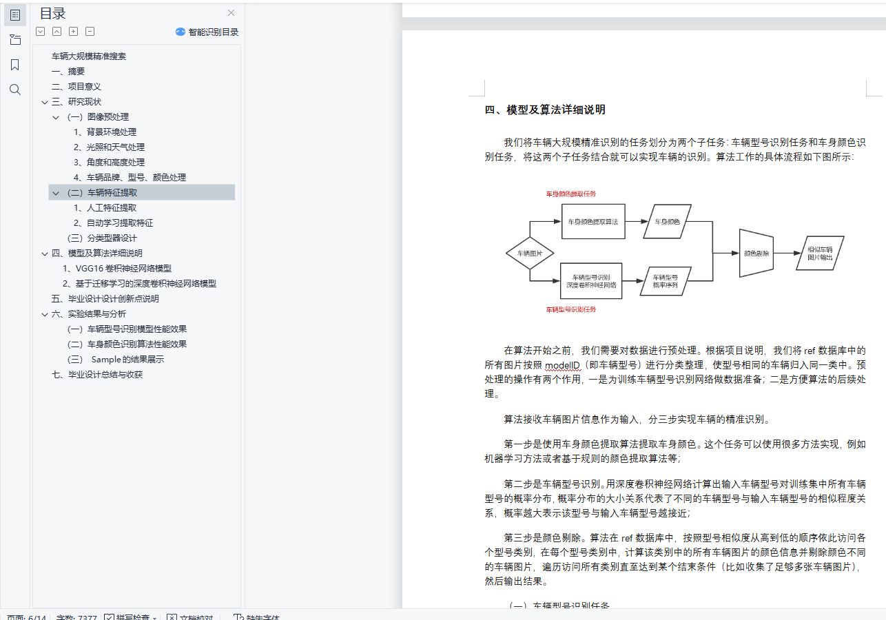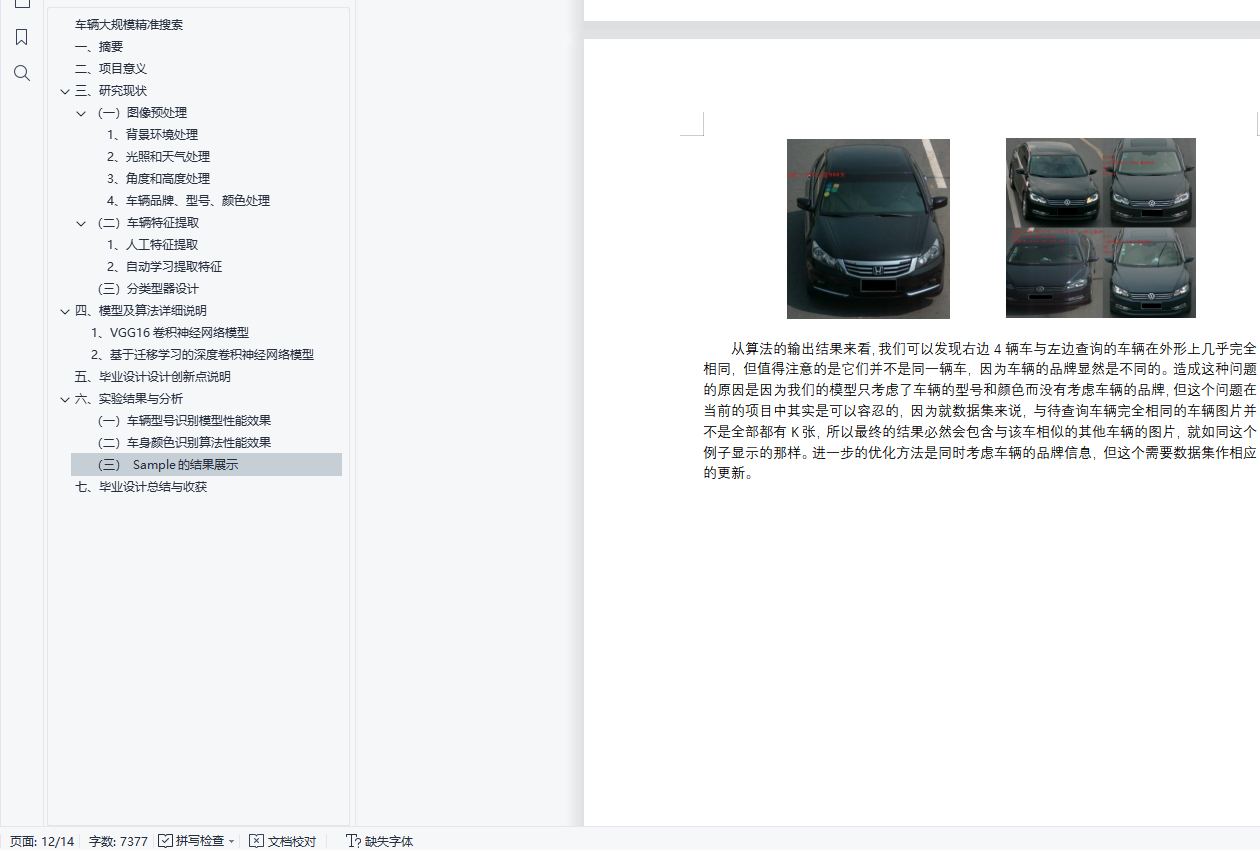 车辆大规模精准搜索目录车辆大规模精准搜索项目报告 1一、摘要 1二、项目意义 2三、研究现状 3(一)图像预处理 31、背景环境处理 32、光照和天气处理 33、角度和高度处理 34、车辆品牌、型号、颜色处理 4(二)车辆特征提取 41、人工特征提取 42、自动学习提取特征 4(三)分类型器设计 4四、模型及算法详细说明 61、 VGG16卷积神经网络模型 72、 基于迁移学习的深度卷积神经网络模型 7五、毕业设计设计创新点说明 10六、实验结果与分析 11(一) 车辆型号识别模型性能效果 11(二) 车身颜色识别算法性能效果 11(三) Sample的结果展示 11七、毕业设计总结与收获 13一、摘要车辆大规模精准搜索(以下简称车辆检索)在实际应用中具有非常重要的意义。与其他对象检索任务类似,车辆检索任务可以定义为:给定两部分图片数据ref(车辆图片数据库)和query(测试车辆图片),目标是对query中每张测试图片在ref中找出所有属于相同车辆的图片。在毕业设计项目中,我们的任务是对query中每张测试图片在ref中找出所有属于相同车辆的图片并排在查找结果的前面,采用MAP@K方法对算法结果进行评测。我们将车辆大规模精准搜索的任务划分为车辆型号(model)识别任务和车身颜色识别任务这两个子任务。在车辆型号识别任务中,我们使用了基于迁移学习的深度卷积神经网络模型算法来判断车辆型号。使用的深度卷积神经网络模型包括VGG16、Inception_V3和ResNet50等,将这些模型进行迁移学习,能使其在训练集上达到97%的型号正确分类效果;车身颜色识别任务使用了基于OpenCV的HSV颜色识别算法。将两个子任务结合就可以实现车辆精准识别的任务,我们的算法在测试集上达到非常优异的识别效果。