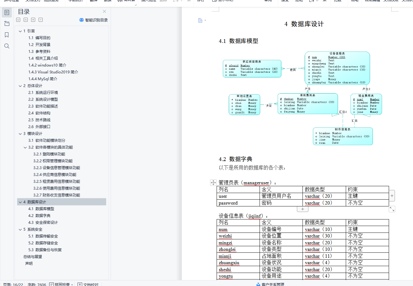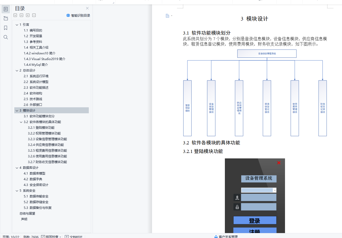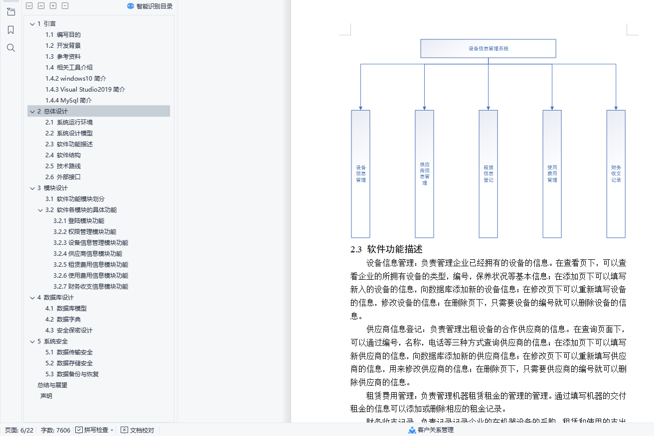 目录1 引言 21.1 编写目的 21.2 开发背景 21.3 参考资料 31.4 相关工具介绍 31.4.2 windows10简介 41.4.3 Visual Studio2019简介 41.4.4 MySql简介 42 总体设计 52.1 系统运行环境 52.2 系统设计模型 52.3 软件功能描述 62.4 软件结构 62.5 技术路线 72.6 外部接口 83 模块设计 93.1 软件功能模块划分 93.2 软件各模块的具体功能 94 数据库设计 154.1 数据库模型 154.2 数据字典 154.3 安全保密设计 175 系统安全 175.1 数据传输安全 175.2 数据存储安全 175.3 数据备份与恢复 17总结与展望 19声明 201 引言企业的设备管理在企业的生产制造和管理过程之中意义比较重大,明确企业的设备的产权和维护成本对于企业的成本控制和财务管理之中起到了重要的作用。随着市场竞争的加剧,现代企业所处的市场环境发生了深刻的变革,企业竞争越来越强调基于客户需求的竞争。因此,企业的生产方式逐渐转向以柔性自动化生产为基础的各种先进生产模式,目前生产类型大致可以划分为三种:大量流水生产、多品种小批量生产和单件生产。当下中国制造业多集中在多品种小批量生产企业,这种生产方式开始占有越来越重要的地位。为了适应这种生产方式,企业需要不断的改变生产线,并且不断的购买和租赁机器设备。这种转变给企业的设备管理和财务信息收集带来了巨大的挑战。